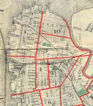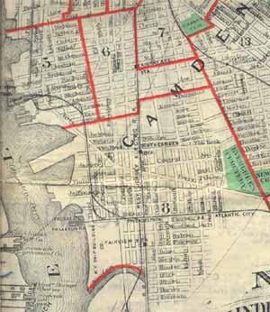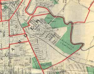 The City of Camden had a very different look than that of today. In 1914, when the map depicted here was published, the Yorkship Square neighborhood had not been built, and the land was to occupy was part of Haddon Heights, a great part of East Camden was part of Stockton Township, and as the Ben Franklin Bridge had not been built, there was no Admiral Wilson Boulevard. In 1914 the airplane was only two years old, there were no airports, thus no Airport Circle! You will note that many of the street names shown on this map are quite different than those of today. You will also find many streets on this map that are no longer there. |
