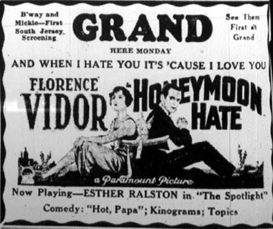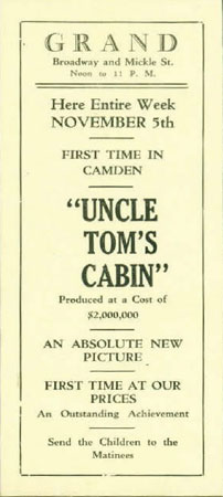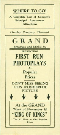 The Grand Theater was located at 207 Broadway, just south of Mickle Street and adjacent to one-time Camden Mayor Roy R. Stewart's men's wear store. The 1911 City Directory shows Abram Greenberg operating a theater at this address. The Grand remained a popular spot into the early 1950s, when television and a lack of parking caused attendance to fall. By 1959 the theater had closed. The October 1959 New Jersey Bell Telephone Directory's Yellow Pages lists only six theaters in Camden. By the early 1920s only two would remain open, and not for long. The Grand was razed and retail stores took its place on Broadway. Around 1990 Broadway Eddie Warhoftig expanded his record shop to include the site of the former theater. The Warhoftig family remains in business on Broadway under the Broadway Eddie's name in 2004. |