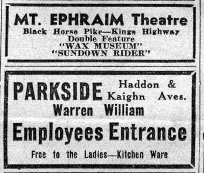 Camden entrepreneur Charles Kaufmann built the Parkside Theater, which had opened by 1914 at 1187 Haddon Avenue. By 1918 a new building had gone up, at 1191-1193 Haddon Avenue. Through 1926 it was known as the Forest Hill Theater. The 1926 City Directory shows Robert North of Haddon Heights as manager. By the time the 1927 Directory was compiled, the theater had been renamed. Ralph M. Hodgens of 1468 Kaighn Avenue was the manager. The 1928 City Directory shows William D. Gersman of 1050 Langham Avenue, managing the theater. The Parkside remained open into the early 1960s. By 1967 the theater had closed, and there is no occupant listed in the 1970 New Jersey Bell Telephone Directory. In the early 1970s the building was acquired by the Church of God and Saints in Christ Tabernacle No. 2, under the direction of Rev. R.L. Greene. This denomination is still utilizing the building as of 2013. |
