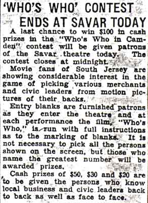 The Savar was the flagship theater of the Savar Theatre Corporation chain, which was founded by Samuel Varbalow. His brother, Joseph A. Varbalow, also served as an officer of the corporation, as well as practicing law in Camden. Another brother, Harry, passed away in 1940. Other theaters in the Savar chain in Camden included the the Auditorium, which was torn down and rebuilt as the Rio; the Victoria, the Towers, the Midway, and the Arlo. Located just to the east of the Camden Trust bank building on Market Street, the Savar in 1938 was the first theater to utilize a new sound system that had been developed by the Radio Corporation of America, otherwise known as RCA, which had its research and development facilities in Camden at the time. The Varbalow family had roots in the Jewish agricultural settlements established near ear Hammonton before the turn of the century. They came to Camden prior to World War I, and engaged in realty, building, shoe stores, and other business. The family settled first in South Camden, and shortly afterwards in Cramer Hill. In the late 1940s, Samuel and Joseph A. Varbalow both lived in the 2600 block of Baird Boulevard, between Marlton Pike and Federal Street. Their neighbors included realtor Edward J. Borden and tavern owner David Plasky. Deteriorating economic conditions in Camden, caused by the closing of many of Camden's major employers translated into declining attendance. By 1970 the Savar had closed its doors. The building has been gone for decades. |