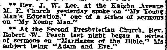 REV. JAMES C. RUSSELL Announcement was made yesterday in local Presbyterian churches of the death of Rev. James C. Russell, formerly pastor of the old Second Presbyterian Church, Fourth and Benson Streets, died Wednesday at his home in Oneonta, New York. He was 76. Reverend Mr. Russell served here some 40 years ago and had been pastor of the First Presbyterian Church at Oneonta since 1898. He was also a former pastor of the church at Horsehead, New York. |