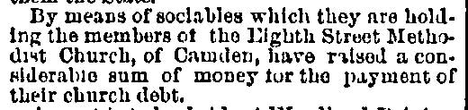 The history of the Eighth Street Church begins with a Mission Sunday school under the care of the Broadway Church. This school, under the name of Paradise Mission, was organized in 1859 in a building on Mount Vernon Street, used as a meat-shop and owned by John Paschal. At the time of the organization of the school John Collins was elected superintendent; John S. Long, assistant and secretary; Mr. Holmes, librarian; Mifflin K. Long, treasurer, and Joseph Hoffinger, John Paschal and Benjamin F. Long, teachers. Fifty children were immediately gathered into this school. The building had no chimney and was not plastered. The cold weather compelled the school to seek a more comfortable place, and the public school-house on Spruce Street was generously granted and the school held in it for several months. In 1860 a room or hall on Walnut Street, to the rear of the present church, was rented, and there the school convened until 1862, when a frame chapel was built where the church now stands. Under the charge of the presiding elder, A. K. Street, this chapel was dedicated by Rev. H. M. Brown, and the Sunday school, then numbering one hundred members, moved into it. During 1862 Rev. R. S. Harris, pastor of the Broadway Methodist Episcopal Church, formed a class with John S. Long as leader, and thus originated the Eighth Street Methodist Episcopal Church. Regular services were conducted every Sunday, and daring that winter extra meetings were held, which resulted in bringing many persons within the fold of the church. Encouraged by this success, in 1863 the Eighth Street Chapel, as it was then called, formed a mission in connection with Stockton and Newton, and the Conference appointed Rev. Garner H. Tullis to take charge of this mission. The first year of his ministry was a successful one and brought eighty-three members, forty probationers and two hundred and twenty Sunday school children within the mission. The Eighth Street Chapel then filed a certificate of incorporation, under the name of the Tullis Methodist Episcopal Church, by which name it has ever since been known, though called in Conference minutes as the Eighth Street Methodist Episcopal Church of Camden. In 1865 Rev. David McCurdy was appointed pastor and in 1866 Rev. N. Walton succeeded him. In 1869 this church, which had from the first been associated with Broadway Church, separated from it and became a station. In 1873 W. C. Stockton became pastor and the chapel was enlarged and greatly improved, at a cost of one thousand dollars, through his exertions, and during the second year of his pastorate the foundation of the present large brick church building was built up to the second story and a temporary roof placed over it. It was not completed until 1880, at which time the church and grounds were valued at fifteen thousand dollars. Since this congregation separated from the Broadway Methodist Episcopal congregation the pastors who have served it were Revs. J. H. Nichols, J. I. Merrill, J. White, Jacob T. Price, W.C. Stockton, John E. Westwood, Willis Reeves, Garner H. Tullis, James H. Payson and William Walton, the present pastor. The history of this church has been promising from its first inception, and its future prospects are brighter than ever. With an increasing population about it and a large membership of more uniform piety, it cannot fail to accomplish its great mission. The membership at this time (1886) is three hundred and fifty-one, and the Sunday school is in a flourishing condition, having four hundred and fifty-one teachers and pupils, with E. S. Matlack as superintendent. . |