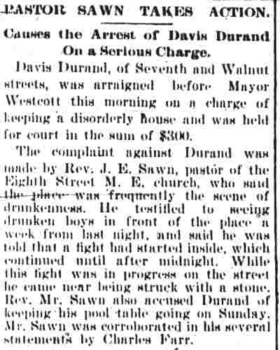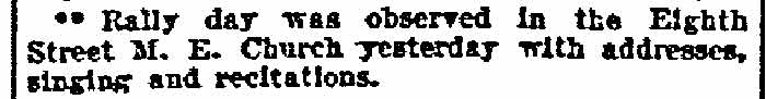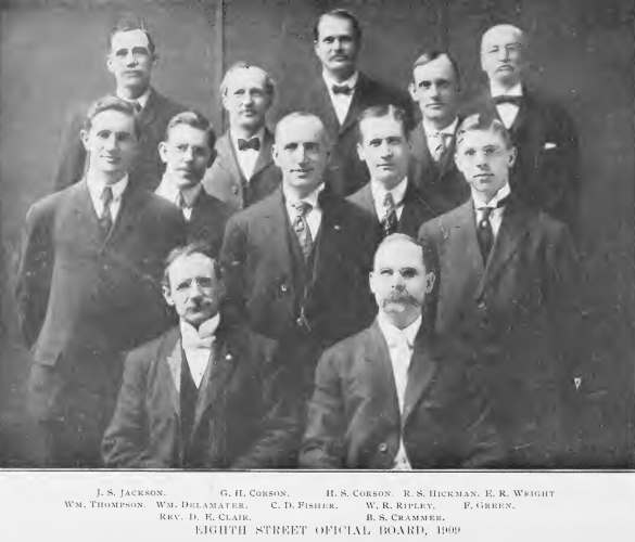 numbered 112 scholars, with 26 officers and teachers. The need of a new church was apparent, and September 6th, 1873, Brother Stockton placed a tent on vacant lots near by and opened a city camp meeting. Services were very successful—and keeping ever in mind the needs of the people he spoke of the new enterprise and reported $305.84 received in cash and subscriptions. The work of pulling down the structure was commenced. The basement portion of the new church was built up to the joists of second floor. March, 1875, Rev. J. R. Westwood was appointed by the Conference in session at New Brunswick, N. J. He found the congregation worshipping in a portion of the old structure. The new building was open and exposed to the weather and encumbered with $1,500 debt. It was decided to roof and finish the basement, using the material of the old frame building as far as practical. Work was begun on the finishing of the basement, and October 19th, the first prayer meeting was held in the finished Class room, fourteen persons being present. On Sunday, October 31, 1875, the basement was dedicated to the service of Almighty God by Rev. Jacob T. Price. Rev. C. R. Hartranft preached in the morning. Rev. A. Atwood, Philadelphia Conference, 1.30 P. M., and Rev. J. W. Hickman, 7 P. M., there being large congregations throughout the day. The total indebtedness was $2,419.98. The amount raised at the dedication was $747.70. The remaining indebtedness was $1672.28. Not only wais the church blessed financially but also spiritually, under the ministry of Bro. Westwood. Hence at the closing of the third year, 'he reported 350 converted to God and received on probation, 153 received in full connection. Rev. Willis Reeves was appointed pastor in 1878, to succeed Bro. J. R. Westwood. He was abundant in labors. It was during his pastorate that the upper part of the church was finished. He enlisted the people to work for this enterprise by taking the plan of selling the bricks needed to complete the work of church construction at ten cents per brick. The congregations were large and enthusiastic and were jubilant over the much needed place of worship. His pastorate continued until 1881. Rev. G. H. Tullis was again appointed pastor, Eighth Street becoming an independent charge and Brother Tullis gave experience and personality which added greatly to the charge. Rev. J. H Payran succeeded Brother Tullis. and served the church until March, 1886. Then followed the pastorates of Rev. William Walton, Jesse Stiles. H. R. Cheeseman, Harry White, J. E. Sawn, W. S. Mitchell, James Burns, Steadman Applegate, Daniel E. Clair, the present pastor. Under each of these pastors added improvements have been made to church property, indebtedness paid—revivals occurred, until to-day. the church property is conservatively estimated at $20,000, with a very convenient and well-located parsonage, on Walnut street with but $3,000 against church and parsonage clear of debt. Three young men have gone out from this church to preach the Gospel: Rev. Hibbard Howell, to Philadelphia Conference; Rev. George R. Middleton, a very promising young man taking some of the best appointments in New Jersey Conference, and died at Atlantic Highlands, May 2, 1908; Rev. Joseph Simpson, also a member of the New Jersey Conference, and now stationed at Manahawkin. Notable among the men who have wrought so faithfully and well in the Sunday School are Philip Patterson, John Carwell, Thornton Sayers, Elijah C. Smith, William Kaighn, John Marshall and William D. Delemater, the present superintendent. The Official Board of the Tullis M. E. Church (now known as Eighth Street) have been composed of earnest sacrificing men through all the passing years and the Elishas have caught the spirit of the Elijahs and at the present the men in the control of the church interests are worthy sons of these noble sires. The Ladies' Aid of the church comes in for no small glory. But for their untiring, heroic efforts the comfortable, up-to-date parsonage would not have been free of debt, and in such excellent state of repair. These elect ladies with the spirit of a "Deborah" placed the parsonage in the building loan and patiently and perseveringly financed the matter until the debt and mortgage was wiped out. Another right arm of strength is the Ushers' Union, numbering fifty men, strong and ready to assume any burden, financial, social or spiritual. This society has been a great help to the church. Today the church numbers 300 members. The church building, equipped for present day needs, and with the growing neighborhood, has a bright outlook for the future.