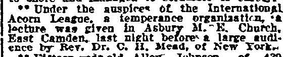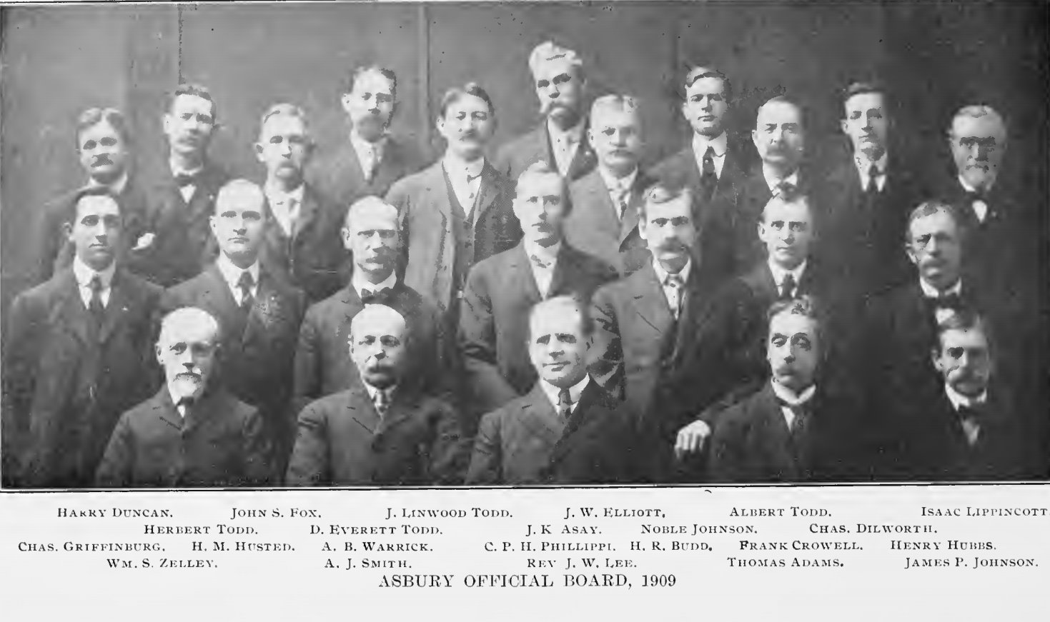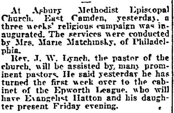 Sunday School Superintendents:—William Hamlin, 1873; Edward W. Madison, 1874; Webster Gill, 1875; Edward W. Madison, 1878; S. Harmer, 1879; J. H. Boyd, 1880; John J. Stone, 1881; Edward W. Madison, 1882; J. F. Barnett, 1883; Charles Wentzell, 1884-1885; Joshua Tushingham, 1886-1891; A. James Smith, 1892-1908; Charles Dilworth, 1909. Superintendents at Pavonia—Fairview—Samuel Dare, Jonas Shaw, William S. Zelley, 1891-1897. The present official list is as follows : Pastor, Jesse R. Thompson. Local Preachers—A. James Smith, John Crowley, Arthur Mansure, Fred. B. Morley, George Brown. Exhorters—William Royal, Paul Miller. Sunday School Superintendent, Chares Dillworth. Epworth League President, Edward E. Patchett. Stewards—James K. Asay, William T. Lamb, George Corkhill, John Elliott, Noble Johniston, Herbert Todd, D. Everett Todd, Harry Husted, Charles Dillworth, Charles Griffenberg, Isaac Lippincott, Henry Hubbs, Charles Carter, Charles Chamberlain, Curtis P. H. Phillippi, James P. Johnston. Class Leaders—Albert M. Todd, William Royal, John Crowley, Hazel Carman. President Ladies' Aid Society, Mrs. Ruth E. Blessing. Junior League Superintendent, Mrs. Amanda Moran. President Home Missionary Society, Mrs. James K. Asay. Trustees—Thomas Adams, who has been continuously in the Board since April, 1883; William S. Zelley, who has been continuously in the Board since 1884; J. Linwood Todd, elected in September, 1895; Joseph P. Martin, elected September, 1901; Harry Duncan, elected September, 1903; Horace R. Budd, elected September, 1906; Frank Crowell, elected September, 1907; John S. Fox, elected September, 1901; Harry Duncan, elected September, 1908. |