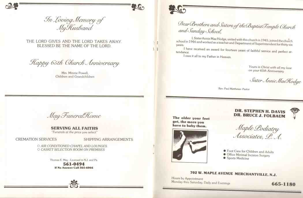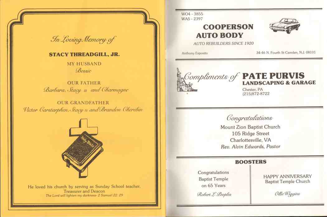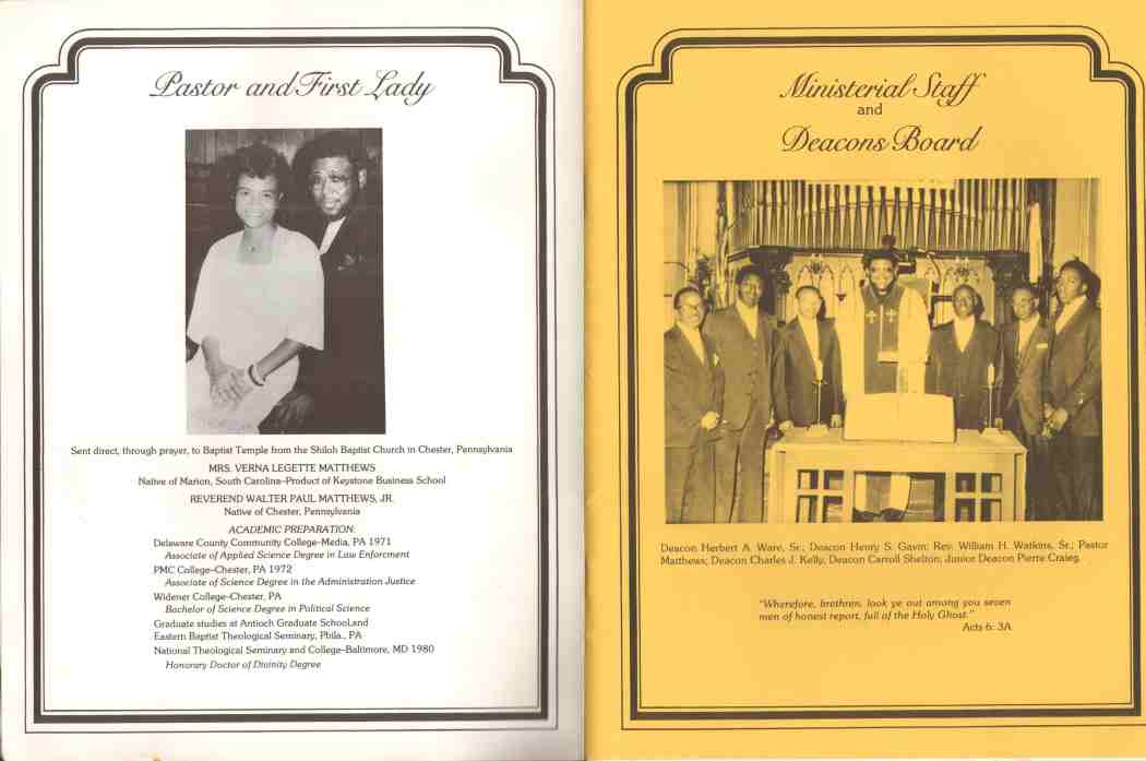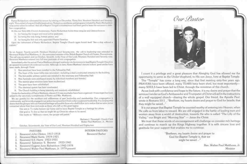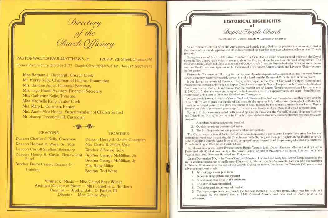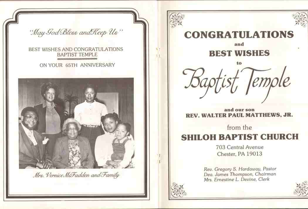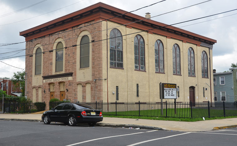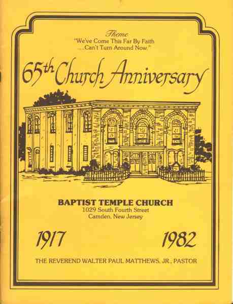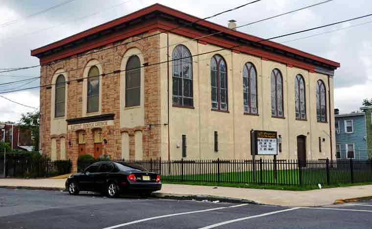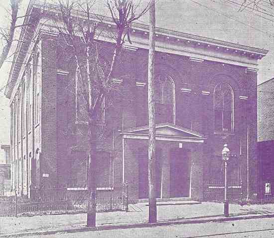 BAPTIST TEMPLE CHURCH stands on the southwest corner of South 4th Street and Mt. Vernon Street. The building goes back to the late 1860s 0r early 1970s, when the Second Baptist Church, erected a meeting-house on the southwest corner of Fourth and Mount Vernon, of brick, two stories high and costing, with ground, eighteen thousand dollars. This church operated as the Second Baptist Church as late as 1888, according to City Directories. That year's Directory shows the congregation being led by Rev. John D. Flansburg. The 1890 Directory shows the name had been changed to Mt. Vernon Baptist Church, and that Rev. Flansburg still led the church, however declining membership and dissatisfaction with Rev. Flansburg caused much controversy. The 1894 Directory shows that the church had once again been reorganized, and was then known as Emmanuel Baptist Church, with Rev. Joseph N. Folwell now at its helm. Among his successors were Rev. John Snape and Rev. Dr. Quentin Chew Davis. Emmanuel Baptist Church remained at this location until 1920, when the present occupant, Baptist Temple Church, acquired the property, which they still occupy. The Baptist Temple Church was founded in 1917 as the Morning Star Baptist Church. This congregation renamed itself Baptist Temple Church and acquired the building at South 4th Street and Mt. Vernon Street in lat 1919 or early 1920. |