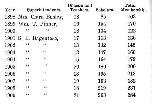 been appointed in the On the third of October of this year (1892) the church building, from fire of an unknown origin was burned to the ground. An offer from the Republican Club at 27th and River avenue for the Congregation to worship in their building was accepted, until July 1893, at which time the present building was erected. Conference of 1893 appointed Rev, William McClaskey to supply the pulpit. He served until fall and then went west. During the remainder of that year and until conference of 1895 Mr. Blake, Mr. Severns and Mr. Wells filled the pulpit in succession. At the conference of 1895, Rev. Harry Denlinger was appointed to the charge and served until 1897 when Rev. Edward Wells followed, serving a short time. Rev. John Newkirk followed, serving until the church was organized in 1898. The Sabbath school then had a total membership of 73. On March 29th 1898, at a meeting of which Brother William T. Pinner was chairman, a committee was appointed to procure articles of incorporajtion for an independent church and on April 12th of the same year the church was incorporated, Rev. J. T. Wilde being the first pastor at a salary of $150.00 per year. The first Trustees were Brothers B. Johnson, George Carey, William Travis, H. G. Shockley, A. Liming, William Knox, and William T. Pinner. Stewards: George Carey, B. Johnson, George H. Ensley, William Ward, George Straughn, Joseph Wood, Mrs. E. Southwick, and Mrs. Catherine Funfer. The indebtedness on the church was $1,584,00 a mortgage of $1,200.00, and two notes amounting to $384.00. During Brother Wilde's pastorate the notes were paid thus leaving the mortgage of $1,200.00 when he resigned in 1901, having served three years doing good work for the Master and greatly beloved by the congregation. At the conference of 1901, Rev. William Grum was appointed to the charge, serving for six years until conference of 1907. Much success attended his ministry both in members being added to the church, among which were several heads of families, and also in beautifying the church. Stained glass windows were put in, the church was fitted up with electric lights, new carpet, and money raised by free-will offerings on the part of the congregation toward paying off the mortgage of $1,200.00, and finally the burning of the mortgage, in October 1906, thus leaving the church free of debt. There were three class meetings in the church : Sunday morning, leader, L. G. Horn; Tuesday evening, William Knox, and Friday evening, William T. Pinner. Brothers Horn and Knox resigned under Bro. Grum's pastorate. Brother Manuel Hope was appointed leader of Sunday morning class and Rudolph Lack of the Tuesday night class. There was also a Children's Class meeting on Sunday afternoon. Sister Collins, leader, who resigned, and was succeeded by Sister Snape, who also resigned and she was succeeded by Sister White, the present leader. The salary of Bro. Grum was $150.00 the first year, but it was increased to $600.00 and house rent by the time that he was removed elsewhere. At the Conference of 1907, the Rev. P. W. Bilderback was appointed to the charge. During his pastorate the subject of a parsonage was brought forward, and on April 17th, 1907, a Building Committee was appointed as follows: Rev. P. W. Bilderback, George Allender, Henry O. Geschwindt, Jared Noecker, S. L. Bagenstose and William T. Pinner, who immediately drew up plans for a building alongside of the church at a contract price of $2,650.00, the house being completed in November of the same year, the pastor and family duly installed in the new home. Up to the present time there has been paid on the building $650 out of the $915 left as a legacy to the church through the generosity of Sister Mary Ward. Thus at this time there is $2,000 still due on the parsonage. This is the history up to the present time of Fairview Church as near as the Committee could gather the facts together. Following are the names of the members of the Quarterly Conference at the present time. Pastor, Rev.