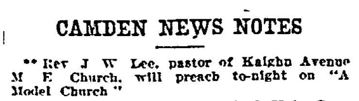 William Stockton. Rev. Boswell had not been with us but a few months when he secured a lot While building, the congregation worshipped in a tent on a lot at the corner of 3rd and Sycamore streets. While there Brother Boswell held revival meetings, and one of our noted preachers in the New Jersey Conference today was converted, the Rev. J. F. Shaw. Since that time other young men have started out from Kaighn Avenue M. E. Church to labor in the Master's Vineyard: Revs. Walter Shaw, William K. Fisher, J. Franklin Smith, and William Sidebottom. Brother Sidebottom was in poor health and did not live long to labor for the Master. The following preachers served as pastor of Grace M. E.