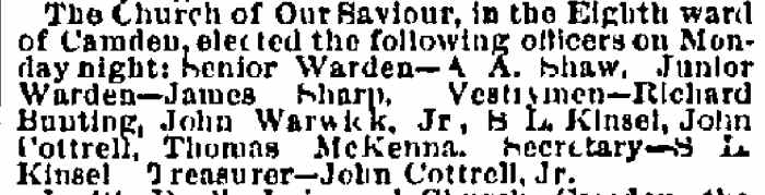 In October, 1854, the Rev. Elvin K. Smith, rector of St. John 's Church began a weekly cottage lecture at the village of Stockton, now known as the Eighth Ward of Camden, where there were a few families desirous of worshipping God after the manner of their fathers. This service was maintained with varying degrees of regularity and success for several years. In September, 1857, Mr. Thomas Lyle, a candidate for Holy Orders, became Sunday lecturer, holding service every Sunday afternoon in an upper room, specially set apart and furnished for that purpose, in the house of John Otten, the rector of st. john 's preaching once a month, and celebrating the communion once in two months. In September, 1859, steps were taken to organize a parish, to be known as the Church of Our Saviour, Stockton, and at a meeting held for this purpose the following were elected as wardens and vestrymen: Senior Warden, John Hare Otten; Junior Warden, Henry Davis; Vestrymen, Charles Drake, O.J. Search, Henry B. Wilson, Gabriel Johnson, Richard Bunting and James Green. This organization, however, was dissolved in 1864. On the 19th of July, 1867, the parish was reorganized; and, after various struggles, in the latter part of 1873, at the instance of the Rev. Dr. Garrison, dean of the convocation of Burlington, steps were again taken to reorganize it. In 1867, largely through the efforts of Mr. Patroni, a brick building situated on Van Hook Street, near the West Jersey Railroad, which had formerly been used as a Baptist meeting house, was purchased, and services were held in it until a lot of ground, situated at the southeast corner of Broadway and Viola Street, was deeded by the Manufacturers' Land Improvement Company to the rector, wardens and vestry, and a new building erected thereon. It was constructed of stone donated by John Powell, of Camden; the other materials being supplied by members of the parish and others interested in its welfare. The cornerstone was placed in, November, 1880. In November, 1882, just about two years after the laying of the cornerstone, the building, free from debt, was consecrated by the Right Rev. John Scarborough, D.D., Bishop of New Jersey. From the last reorganization, in 1873, until 1879 services were held chiefly by the Rev. Reece C. Evans, of Gloucester, and students from the West Philadel-phia Divinity School, among whom were Messrs. Winskill, Waller, Powell, Heff'ern, Bagnall and Post. In November, 1879, the Rev. P.C. Creveling, then a teacher in Mr. Reilly's school, in Burlington, began, by appointment of the bishop, to hold services. He continued a year and three months. Shortly after his withdrawal, Rev. J. L. McKim, of St. Mary's Hall, Burlington, assumed charge of the parish and held regular Sunday and occasional weekday services until Advent, 1882. On the first Sunday in Advent of that year the Rev. Win. B. Thorn entered upon his duties as rector of the parish. The officers at the present time (August, 1886) are,—Rector, Rev. Win. B. Thorn; Senior Warden, A. A. Shull; Junior Warden, Jas. F. Sharp; Vestrymen, Lewis K. Kinsell (secretary), John Cottrell, Richard Bunting, Thos. McKenna, John Warnock, Jr., Benjamin Thomas and John W. Brooks. |