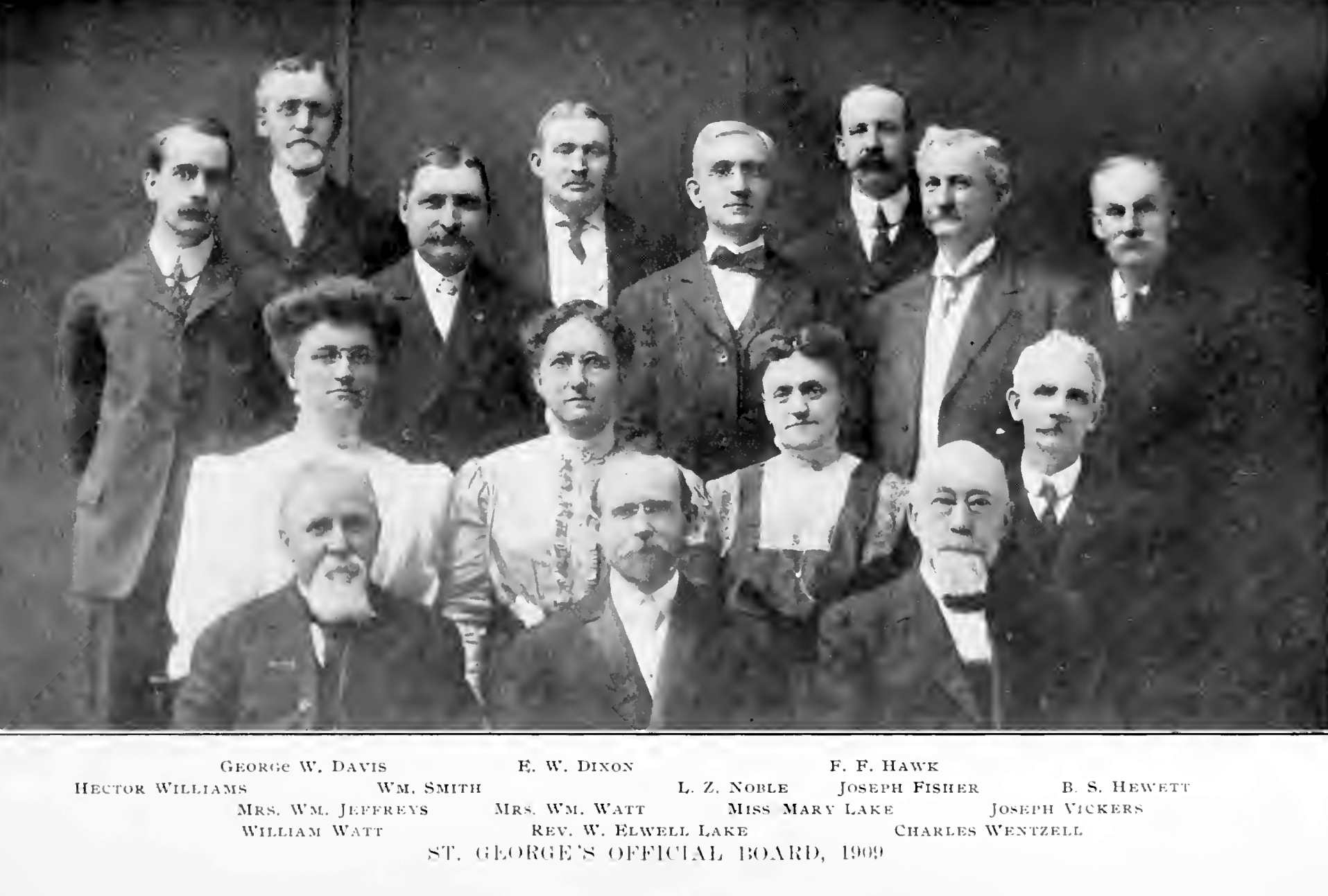 spacious grounds, bringing the total value of the property In the present year 1908, 1909, $500 has been raised by subscription and paid on the Church mortgage, reducing it to $2,400. St. George's Church thus has a property today worth more than $15,600 against which there is a total indebtedness of $4,000. In the early days, in order to carry the large debt and pay the running expenses (the interest and discount on the note alone amounted to $3,000 in seven years) many heroic sacrifices were made by the small band of faithful members. The church organized with thirty on the roll of membership and lat the end of the seventh year pastor G. W. Finlaw reported 57 members and eight probationers. At the close of Rev. G. W. Finlaw 's administration there were eighty-four members and seven probationers. At the close Rev. William Stone's administration there were 123 members and 8 probationers. At the close of Rev. W. Elwell Lake's pastorate there were 162 members and 17 probationers.