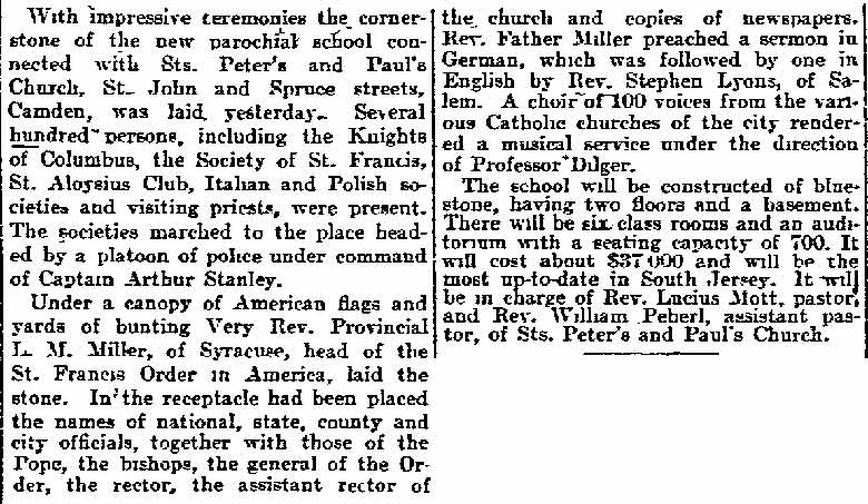 The history of the Roman Catholic Church of SS. Peter and Paul, of which Father Hennig is rector, is interesting. In 1867, it was evident to the German Catholics of Camden, who had been worshipping in the Church of the Immaculate Conception , that they should have a church of their own. Steps were taken toward that end. On April 8 of that year a meeting was held under the supervision of the Rev. Joseph Thurnes, of Egg Harbor, to appoint a committee to either select and purchase a suitable location for a church or a suitable building already erected for a place of worship. The committee appointed at that time made investigation, and finally purchased the church building of the Second Baptist Church, on Fourth and Division streets, in January, 1868, for $4,000. After episcopal approbation had been obtained, the new congregation was incorporated under the laws of the State of New Jersey as The German Roman Catholic SS. Peter and Paul's Church of the City of Camden, New Jersey. After alterations in the building the church was dedicated by Right Rev. Bernard J. McQuade, Vicar-General of the diocese, and afterward Bishop of Rochester, New York. Father Thurnes took permanent charge of the parish, and in a short time the congregation counted several families. In 1869 the building was enlarged, and under the care and supervision of Father Thurnes, who remained as pastor until 1883, a parsonage and school house were also built. In 1883 Father Thurnes was transferred to St. Francis' Church in Trenton, and the Franciscan Fathers, Minor Conventuals, were put in charge of the parish. Rev. Francis Neubauer became the first Franciscan pastor of the church. He addressed himself to the task of a reorganization and the bringing back of those who had wandered away from "their Father's house." He was very successful in his pastorate. It was during his administration that the SS. Peter and Paul's Society and St. Francis' Society were organized. He likewise introduced the Third Order of St. Francis in the parish, and was untiring in his efforts for the spiritual welfare of his flock. For nearly a score of years the faithful worshipped in the little church, when it became evident that a larger edifice was necessary. Accordingly, on June 1, 1886, it was decided to purchase a new property for the congregation. One plot was bought, but as it was unsuitable, it was sold, and after much deliberation the property at the corner of Spruce and St. John streets, the present site, was purchased, and in due time a new church was built upon it. On Sunday morning, December 7, 1890, the church was dedicated by Bishop O'Farrell. After various changes in the pastorate, Father Hennig took up the work in September, 1915. |