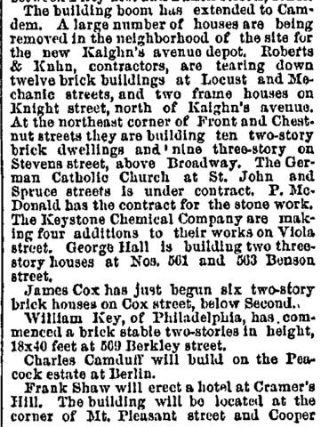 In 1867 a number of the German people of Camden, who had been worshipping in the Church of the Immaculate Conception, of this city, with a few persons who had been connected with other Roman Catholic Churches, met at the house of Anthony Kobus, at No. 419 Spruce Street. This meeting was under the supervision of Rev. Father Joseph Thurnes, of Egg Harbor, and was called for the purpose of appointing a commit-tee to select and purchase a suitable location for building a church, or a suitable building already erected, for a place of worship. John Welsh, Valentine Voll, Anthony Kobus and Anthony Voll were appointed as a committee. Soon after, hearing that the church property of the Second Baptist Church, on Fourth Street, could be obtained, the committee purchased it for the sum of four thousand dollars, in January 1868. After a few alterations were made, the church was dedicated by Vicar-General McQuade, of the Diocese of New Jersey. Rev. Father Joseph Thurnes was placed in charge, and in a short time seventy families united with the congregation. A Sunday school was organized, which meets in the basement of the church building. In 1869 the committee was authorized to enlarge this building. An extension of twenty feet to the rear was built, and other alterations and improvements were made the same year. Rev. Father Thurnes remained with the church until 1833. Under his care and supervision a parsonage, schoolhouse and hall were built, and a day school established, in which English and German were taught to a large number of pupils. Rev. Father Francis Neubauer and Rev. Father Peter Scharoun, of the Franciscan Order, then as-sumed charge of the church, and under their care the congregation has prospered and increased, and the schools have gained in numbers. All indebtedness on the church has been canceled. About one thousand persons form the congregation, and three hundred children are taught in the Sunday school and day schools. The congregation is now preparing to erect a large and commodious house of worship. |