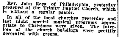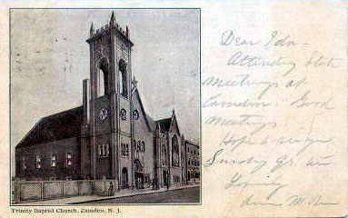 TRINITY BAPTIST CHURCH of Camden was organized on the 7th day of December, 1871, by the adoption of a church covenant and articles of faith as recorded in Rev. T. Hiscox's "Baptist Church Directory," pages 154 to 177, inclusive, and the following-named gentlemen were duly elected the officers thereof: For office of deacons, Thomas Peak, J. D. Rogers and R. H. Morgan; for church clerk, Thomas W. Wilkinson; and at a subsequent meeting held December 21, 1871, the 'following-named gentlemen were elected trustees: Isaiah Woolstoii, E. E. Read, George E. Taylor, William Groves, Alfred McCully, John Burr, William Scudder. The membership of the church numbered about ninety-five. Amongst them, we may mention Deacons Thomas Peak and wife, J. D. Rogers and wife, R. H. Morgan and wife, Deacon Jacob S. Collings, Rev. Charles Sexton and wife, Mrs. E. Westcott, Mrs. Anna Davis and Mrs. Amy Anderson. In a few days after the election of the trustees, as above stated, they purchased the building known as the Presbyterian Meetinghouse, on Fifth Street, above Market Street, in Camden, which purchase was ratified by the church December 28, 1871, and on the 7th day of January, 1872, the church held its first public service, Dr. Weston, of Crozer University, preaching the sermon.. On the 20th day of February the church received recognition in a public manner by pastors and lay members of a number of churches of the same faith and order, the Trinity Church, being represented by J.D. Rogers, R.H. Morgan and Thomas W. Wilkinson. The recognition services were held in the meetinghouse purchased by the church. Dr. Sanford, of Salem, preached the sermon and Deacon Thomas Peak received the hand of fellowship from the council by the hand of Rev. Mr. Chambles, pastor of the North Baptist Church of Camden. On the 22d day of April, 1872, the church/by a unanimous vote, invited Rev. A.H. Lung, of. Germantown, Pa., to become its pastor. June 2, 1872, Rev. A.H. Lung entered upon his duty as pastor of the church, and after nine and one-half years of faithful and successful labor he resigned on March 27, 1882, to accept a position as general secretary of the Home Missionary Society of the State of New York, since which time the church has been very successful in her work under the leadership of Rev. O A. Adams, who resigned the pastorate in June of the present year (1886). |