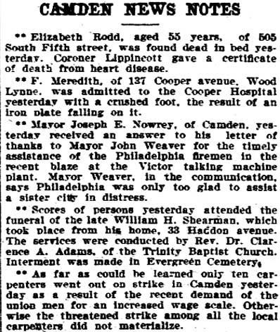 The Trinity Baptist Church was organized December 7, 1871, and on December 21, 1871, ratified the purchase of the Presbyterian meeting house on 5th Street above Market Street. This building was used until 1896, when it was decided to erect a new edifice ion the same site. The church remained at this address, 114 North 5th Street until 1918, when the church building was sold to the Victor Talking Machine Company. Victor's original recording studio, on the southwest corner of Front and Cooper Street (now a parking lot for The Victor loft apartments), was surrounded on all sides by factory buildings. Another studio location was the top floor of a production factory on the northwest corner of Front and Cooper Street, which now houses the Camden Board of Education. The original recording studio was too small to fit an entire orchestra, so the top floor studio was used by the Philadelphia Symphony Orchestra and the Boston Symphony to fit all of their musicians. The factory buildings created excess noise which interfered with recording, Barnum says. The company decided to purchase Trinity Baptist Church in 1918 for its good acoustics. Along with the church, the company acquired a pipe organ, used by musicians such as Fats Waller, who recorded, "Ain't Misbehavin' " and Jelly Roll Morton and his orchestra, who recorded "Down My Way" and "Try Me Out" in 1929." Besides Morton, many of the eras most beloved artists in genres as diverse as blues, gospel, opera, and what we today would call country recorded in the former church. These artists include Enrico Caruso, Irish tenor John McCormack, Jimmie Rogers, and The Carter Family, who recorded "The Wildwood Flower," on May 10, 1929, in Camden. The end of Camden's recording days came when the city decided to construct a subway line underneath the church in 1935, Schopp says. Now a part of the PATCO line, the subway construction created vibrations that interfered with the crude type of sound recording being done at the time. The company moved its recording operations to a New York studio. By February 1936, the former studio had been converted into a gymnasium for use be the Victor Athletic Association. RCA-Victor kept the building as late as 1947, the the Victor Athletic Association and the Victor Employees Salesroom being located there. The church was demolished in the 1950s or 1960s and turned into a parking lot for the Hotel Plaza. |