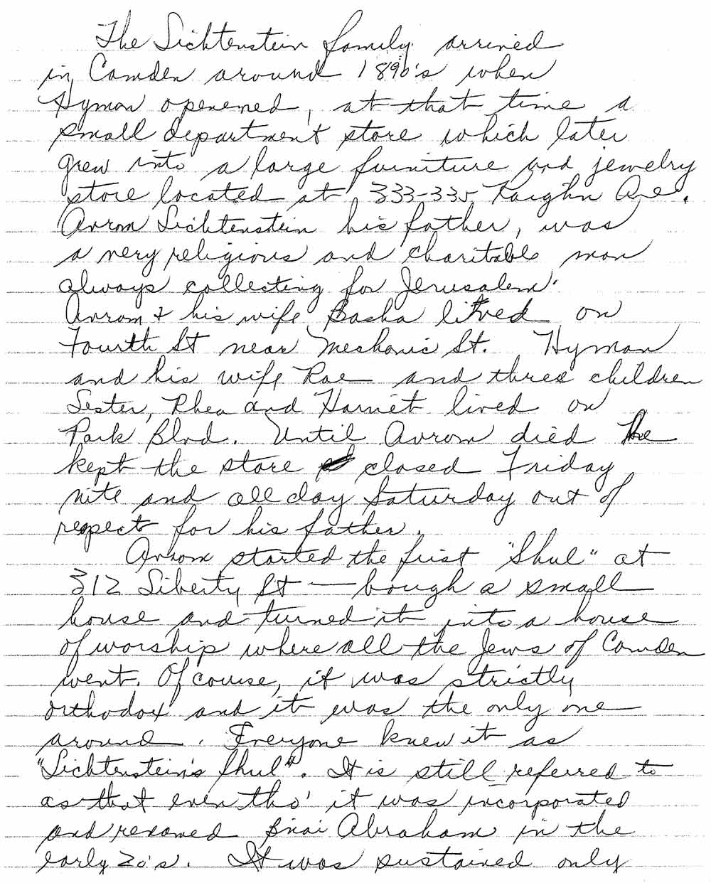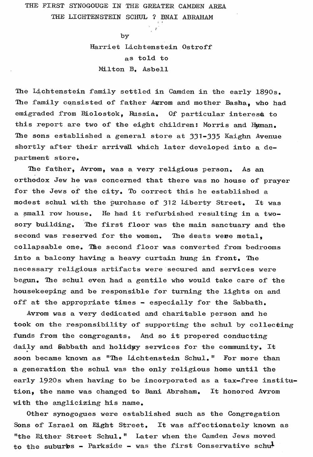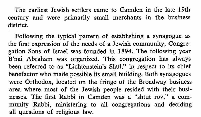 Camden is well known for its ethnic communities. The large Polish, Italian, Irish, German, and Jewish communities played a great role in Camden's history in the 19th and first part of the 20th century, while Black and Puerto Rican families have given the city much of its recent flavor. There are other, lesser known ethnic groups that have made up the fabric of the city's life over the years. Greeks, Armenians, and Ukrainians grouped together in the city in Camden's growth years. More recently, Mexicans, Vietnamese, Jamaicans, Dominicans, Haitians, and Koreans have come to the city to live and seek the American dream. Congregation B'nai Abraham, best remembered as the Lichtenstein shul, was, depending on who one hears the story from, either the first or second synagogue organized in Camden. It's main patron was Abraham (Avram) Lichtenstien, whose family had a successful business around the corner on the 300 Block of Kaighn Avenue. Mr. Lichtenstein, who lived on South 4th Street, south of Kaighn Avenue, procured a rowhouse at 335 Liberty Street and had it converted into a small synagogue in the 1890s. As there were a good number of Jewish families in the immediate area… roughly from Mechanic to Chestnut Street between South 2nd and Broadway… the synagogue filled the immediate needs of the local residents. Another congregation, Sons of Israel, came together on the other side of Broadway. Neither had a full-time rabbi in the early years. Rabbi Louis Segal was the community rabbi during the 1900s and through most of the 1910. Rabbi Naftali Riff came to Camden in in the late 1910s and by September of 1918 was leading Congregation Sons of Israel, who soon had moved to South 8th and Sycamore Street, gaining the name "Eighth Street shul". Even though most of the Jewish families that were originally part of Congregation B'nai Abraham had moved to Parkside and elsewhere by the 1950s, the synagogue was still operating at the end of the decade as "Congregation Shomra Sabbath, Sons of Abraham". Further loss of membership and crime put an end to the synagogue. In December of 1967 the property at 335 Liberty Street was sold to Congregation Sons of Israel in Parkside, who inturn sold it to a private party in September of 1968. There still were a few Jewish families in the neighborhood in 1969, who then attended services elsewhere. In a few short years they, too, had left and so had Congregation Sons of Israel. The building itself at 335 Liberty Street was used as a church for many years. In recent times the church that was housed their disbanded, and the building was used as a residence. On August 28, 2009 at 6:00 AM, a fire was reported. Units of the Camden Fire Department under the command if Battalion Chief Edward Glassman responded and quickly put the blaze out, but not before the old synagogue and the home next door at 337 Liberty Street were badly damaged. Fortunately, no one was badly hurt, although one person escaped the fire by jumping out of a second-floor window. On this page you will find a number of articles and accounts written about Congregation B'nai Abraham also known as the Lichtenstein shul. There are some discrepancies between what was written from memory and the documented record as to what actually was, most notably in the address of the the synagogue. August 2009 |