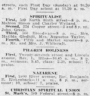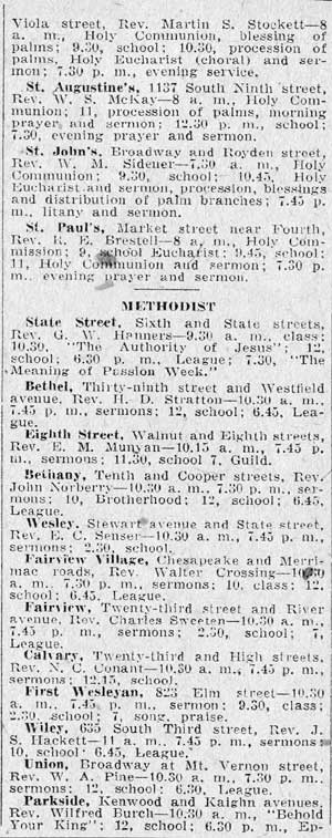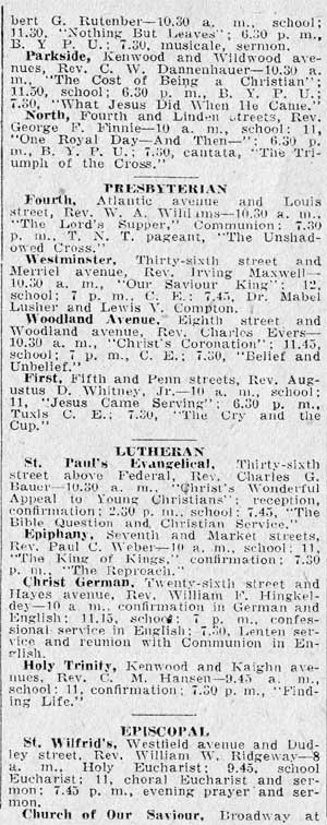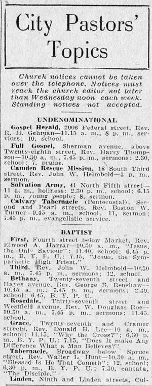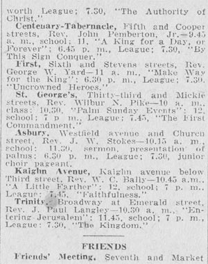 Cantatas, and Special Services Open Holy Week in Churches Here Opening of Holy Week tomorrow in Camden churches will bring special sermons, distribution or palms, musical programs, religious dramas and cantatas. Special programs have been arranged for Sunday school, children. Choirs have been rehearsing special songs, and pastors have been busy arranging the Holy Week services. The choir of Centenary Tabernacle M. E. Church, Fifth and Cooper streets, will sing three anthems at morning service. Howard S. Tussey, organist, will begin a 15-minute recital at 7:15 p. m. Three numbers will be presented by the choir in the evening. Soloists will be Laura Tyler Stone, soprano, and Leila Steele Conly, contralto. Special pictures will be shown at the junior church service at 1:00 a. m. An unusual program of music will be presented by the choir of First M. E. Church, Sixth and Stevens streets. Palms will be presented to every person attending the morning service of Asbury M. E. Church, Westfield Avenue and Church Street, and there will be a pageant and exercises by the junior choir at the evening services. Choir in Cantata The robed choir of North Baptist Church, Fourth and Linden streets, will present Mathew's cantata, "The Triumph of the Cross," under the direction of Forrest Newmeyer, at 7:30 p. m. More than 40 members of the choir will participate. The church quartet will take special parts. Members of the quartet are Winifred Langley, soprano; Edith Sedgley, contralto; Stephen Puff, tenor, and John C. Mather, bass. Rev. A. M. Galloppi, pastor of the First Italian Baptist Church and Christian Center, Third and Line streets, will preach on "The Day of the Palms." in English, at 11:00 a. m. A special Italian service is scheduled for 8:00 p. m. Palm Sunday confirmation will be held at the German Evangelical Lutheran Trinity Church, Stevens street, between Broadway and Fifth streets, where Rev. Thilo M. Gorr is pastor. The service will begin at 10:00 a. m. Those to be confirmed are Ruth Hehl, Harie Hensgen, Elinor Leisling, Norma Otis, Virginia Ports, Freda Renne, Freda Schmidt and Mary Schwab. There will be a reunion of members confirmed on previous Palm Sundays, at the evening Services. The Luther League will attend in body. The junior choir of Tabernacle Baptist Church, broadway below Spruce street, will present a cantata, "The Disciple," at 7:30 p. m. The session of the Fourth Presbyterian Church, Atlantic Avenue and Louis Street, will meet at 10:15 a. m. to receive members into the church. Holy communion will be administered at the morning service, and both choirs will sing. Members of the T. N. T. will have charge of the, evening services, presenting a pageant, "The Unshadowed Cross." Mrs. Ellen Hilbmann will have charge of the program. Mrs. Carl Myers will lead the singing and Mrs. Dorothy Severance will be at the organ. William J. Williams will have charge of the devotional meeting at 7:00 p. m. Special Music Special musical numbers will be presented by the Junior and senior choirs of Woodland Avenue Presbyterian Church, Eighth street and Woodland avenue, tomorrow morning. There will be an organ recital at 7:30 p. m. Members of the Doctrine and Salvation class of St.Paul's Evangelical Lutheran Church. Thirty-sixth Street above Federal, will be confirmed tomorrow morning. They are Grace L. Bibighaus, Annie G. Bowers. Ida L. Craythorn, Pearl M. Dawson, John E. Dayton, Charles W. Fensch, George A. Kraemer, Arthur A. Lick, Marie Loeffler, Karl R. Myhre, Marie K. Orr, Alma M. Schuck, Conrad H. Simensen, Robert W. Thorne, Violet J. Watson, Catherine A. Wolf and Robert L. Wonstetler. Members of the church who are students of Bible institutes will participate in the evening service. The. general theme will be "Vital Questions on Salvation and the Christian Life." Those taking part will be William G. Miller, George Smith, David Christensen, Horace S. M. Aldridge, Shepard Joslin, Samuel Hill, Ernest G. Strang, William H. Evans, Florence Kite, Mrs. Laura Aldridge, Violet M. Humes, Mary Doole, Murl H. Hill and Alice A. Ridgway. The theme will be introduced by the pastor, Rev. Charles G. Bauer. John H. Carter, of Collingswood, will sing a solo, and Miss Lucy A. Viehweg will sing at the morning service. The Bible school session will be held at 2:00 p. m. Classes to Be Confirmed A class of 18 will be confirmed at 11 a. m. in Epiphany Lutheran Church, Seventh and Market streets. Members of the class are Doris M. Barrett, Dorothy M. Blankenhorn, Matilda S. Blankenhorn, Naomi E. Brown, Florence E. Moon, Anna E. Remmers, Gertrude M. Schultz, Anna K. Schultz, Evelyn M. Souder, Dorothy S. Stites, John W. Brimmer, Max H. Helmrich, Edward L. Lemmerman, Fred J. Lightfoot, J. Oswald Kartlai, Clarence E. Kaufman, Leon E. Williams and Robert O. Zoll. Confirmation in German and English is scheduled for 10 a. m. at Christ Evangelical Lutheran Church, Twenty-sixth Street and Hayes avenue. There will be confessional service in English at 7 p. m., followed at 7.30 p. m. by Lenten service, reunion of former confirmation classes and Holy Communion in English. Members of the confirmation class are Margaret B. Schirmer, Mary E. Lang, Willetta Le Rose Dodderer, Edna M. Hoffman, Frieda J. Stutz, Gertrude A. Schoenfeld, Alfreda E. Cramer, Helen L. Koch, Erica J. H. Koehler and Elsie P. Knorr. Six girls and four boys will be confirmed at Holy Trinity Lutheran Church, Kenwood and Kaighn avenues, at 11 a. m. They are Anna Clifton, Dorothy Lepson, Edna Liss, Viola Murphy, Anna Maier, Margaret Remus, Milton Deputy and John Morrell. Rev. C. M. Hansen, pastor, will preach at the evening service, the final of a series of sermons on "Finding the Gate to Life." . |