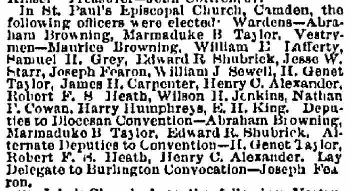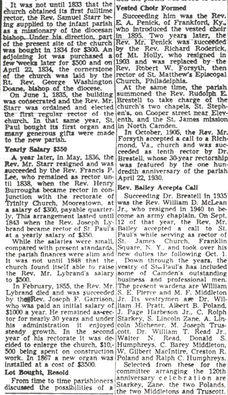 PAUL'S EPISCOPAL CHURCH March 12, 1830, a small company of gentlemen met to consult on the advisability of organizing an Episcopal Church in the town of Camden. There had been occasional services of the church held in Camden, in the second story of the building known as the City Hall, at the present site of Federal Street Market, for some time previous, by several clergy-men of Philadelphia who had agreed among them-selves "to preach" here in turn on Sunday after-noon, "so that it should have, if possible, one service of the church on every Sunday." In the first report made from the parish after its organization, to the Diocesan Convention, the congregation gave acknowledgments for services to Rt. Rev. Bishop Onderdonk, Rev. Dr. De Lancey, Rev. Messrs. Bedell, Douglass, Mead, Rutlidge, Depuy, Hawks, Boyd, Van Pelt, Alien, Jaquette, Smith and Tyng. After due consultation among those assembled at this preliminary conference, it was "Resolved that the meeting do now institute a Protestant Episcopal Church in the city of Camden, under the name of Zion Church, the name subject to be changed if deemed advisable at the time of incorporation." On March 26, 1830, the parish was organized and incorporated under the name and title of" The Rector, Wardens and Vestrymen of St. Paul's Church, Camden." The first wardens of the new parish were Josiah Harrison and Isaac Welsh. The vestrymen were Dr. Bowman Hendry, Jeremiah H. Sloan, Richard W. Howell, Gideon V. Stivers, Abraham Browning Sr., Ebenezer Toole, John Browning, Auley McCalla, Dr. Samuel Harris and Morris Croxall. The deputies to ask admission to the convention were Josiah Harrison, Jeremiah H. Sloan and Richard W. Howell. The first convention after the accession of Bishop Doane to the episcopate, in 1832, was held in Camden, and in the same unpretending "upper room of the City Hall," which had been used for the services of the young congregation, and in which the meetings for its organization and incor-poration had been held. In September, 1833, the Rev. Samuel Starr, of Connecticut, was appointed by Bishop Doane as a missionary to the church in Camden in connection with the old St. Mary's (Colestown) Parish. The records of the Camden Parish, speaking of this missionary, say: "He was a man of singular energy, and by his exertions in the effort to erect a house of worship in this place, was an enterprise in which the boldness was only equaled by the success." On February 3, 1884, the vestry, under his energetic influence, .took steps toward the building of a church. The parish records state that "The lot marked No. 121 in the Map of Camden, and situated on the south side of Market Street, between Fourth and Fifth, was purchased for three hundred dollars, and the lot adjoining was obtained on a perpetual lease on payment of twenty-five dollars per annum ground-rent,; February, 1884." The cor-ner-stone of the church building was laid by Bishop Doane on Tuesday, April 22,1834. The venerable Bishop White assisted Bishop Doane in the ceremonies. The basement-room was ready for use and services held in it early in 1835. The entire church was completed the same year. On Jane 1, 1835, the Rev. Mr. Starr, who, to this time, had been only a missionary to the parish, was elected to the rectorship, and on the same day the building was consecrated by Bishop Doane and the benediction pronounced by Bishop White. The congregation at the end of the first year bad twenty-one communicant's, and a Sunday school had been opened with one hundred children in attendance. In May, 1836, the Rev. Mr. Starr resigned, and on July 25th, Rev. Francis P. Lee became the second rector. The two churches of Camden and Colestown were, from the beginning of the former, a single charge. During the two years' pastorate of Rev. Mr. Lee the number of communicants at St. Paul's increased to forty-one and the Sunday school was in a prosper-ous condition. On his resignation, in 18S8, Rev. Henry Burroughs was elected, and he entered on the joint charge of the two parishes of Camden and Moorestown on November 20, 1838. He retained this until March 7,1840, when the church in Moorestown severed its connection with Camden, and Mr. Burroughs was left with the rectorship of St. Paul's only. On July 9, 1843, he wrote to the vestry, " My constitution is not suited to this part of the country, and I find myself most reluctantly compelled to resign the charge of this parish." On August 23, 1843, the Rev. Joseph M. Lybrand was elected to the pastoral charge. Under his earnest labors the congregation grew steadily. The church, was constructed of unhewn stone, and in 1846 a resolution was passed " that the unhewn stone of the church be covered with rough casting, after the mariner of the State House, in Trenton, and squared, in imitation of stone.'' Among the earliest of the institutions for pariah' aid in this congregation, and one, which did much good in pecuniary assistance to the church, was the "Ladies' Sewing Society," which was formed in 1835. The object of this organization was to assist in decreasing the debt of the church and render general aid. In 1836, according to a. record, the vestry "thanked the society for a splendid service of communion plate and act of lamps for the pulpit." The society ceased to exist in 1860. According to its last report, it had raised for the church over seven thousand dollars. In 1844 the church had seventy-two communicants, and the contributions amounted to three hundred and eighty dollars. In 1847 the number was ninety, and the contributions eight hundred and thirty eight dollars. Rev. Lybrand had served as rector nearly twelve years; during a large portion of that time he was an invalid, but his zeal and interest in his work did not abate. He died on February 14, 1655. Bishop Doane said: "I have known him long and well. I never knew a better man. He was modest, gentle and quiet, yet firm, fearless and indomitable. He said but little, but always what was wise a