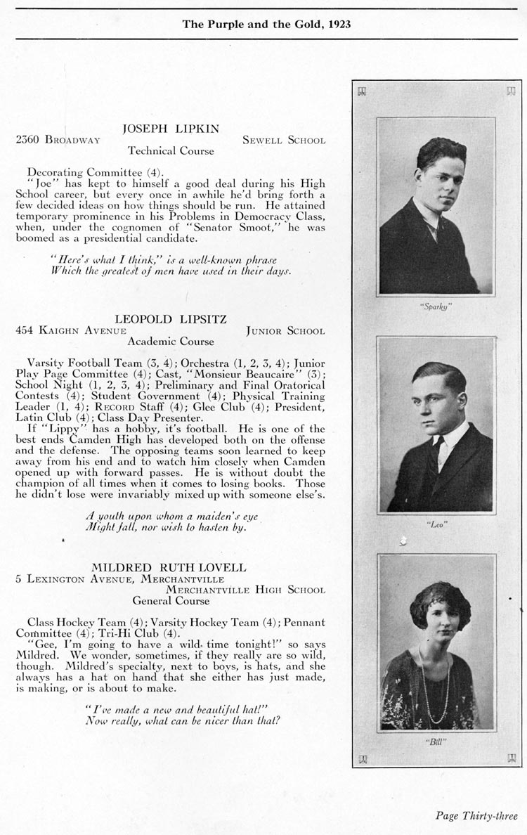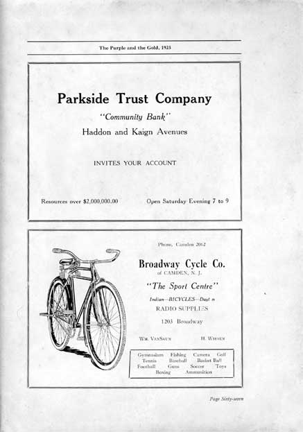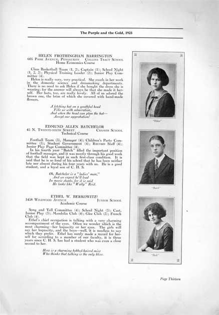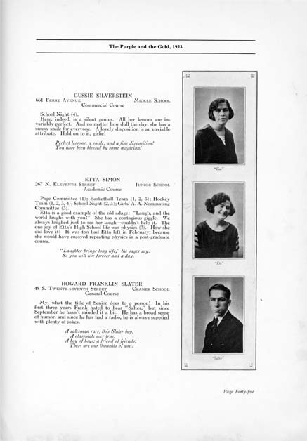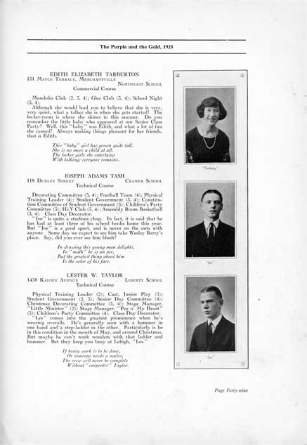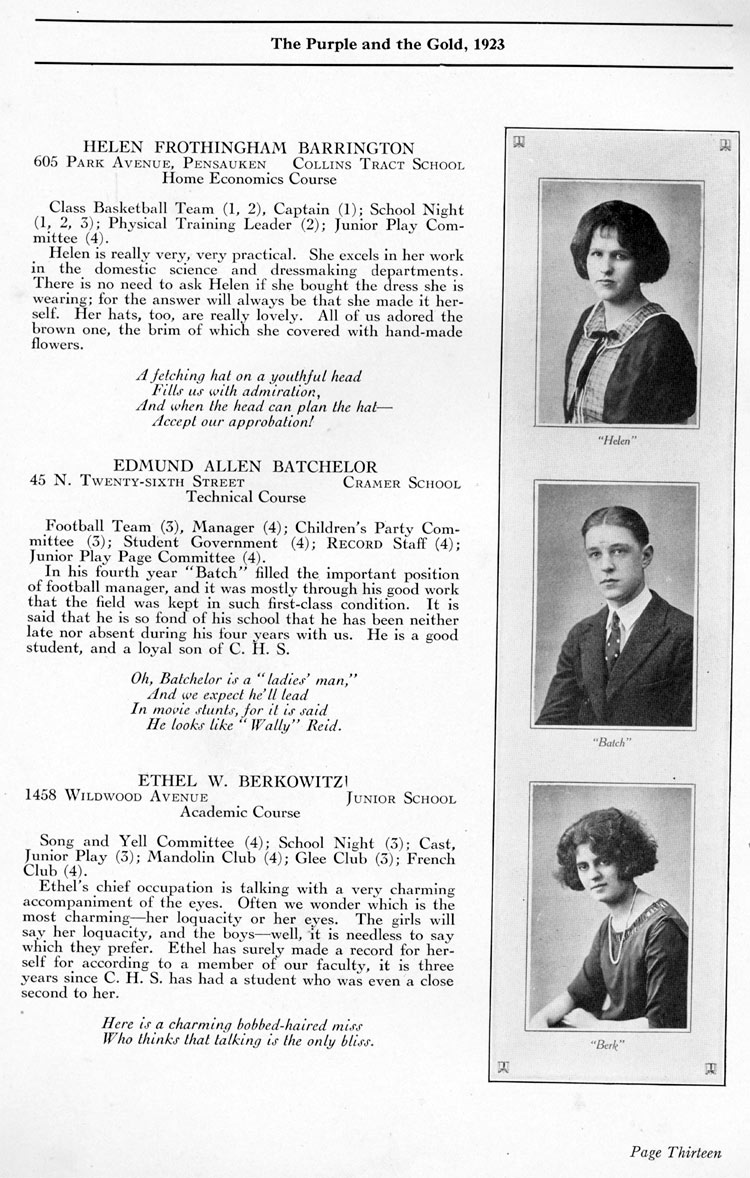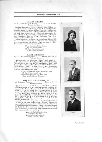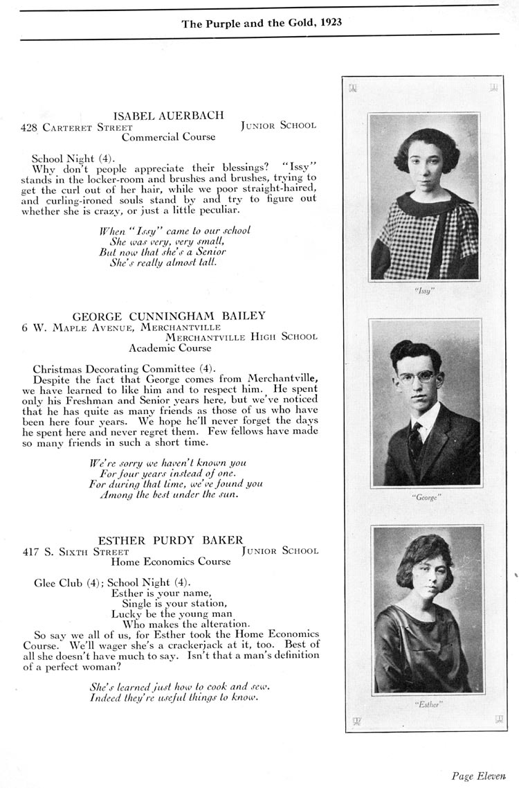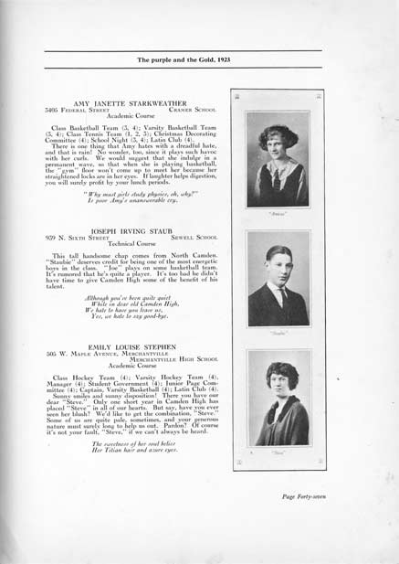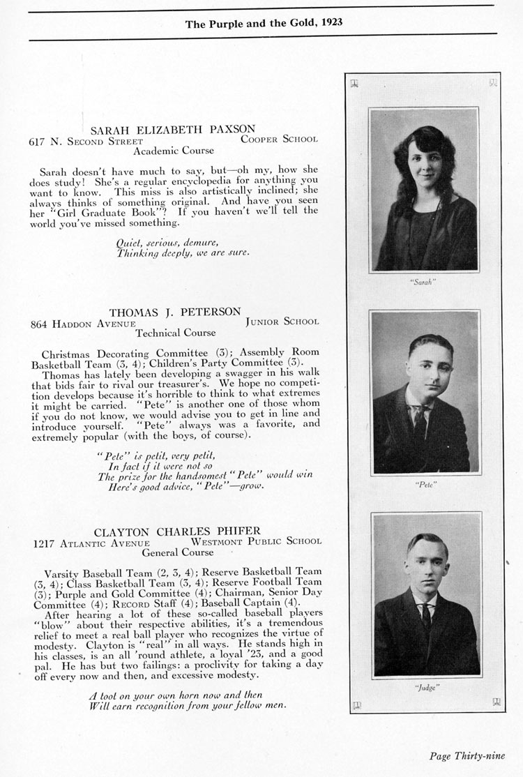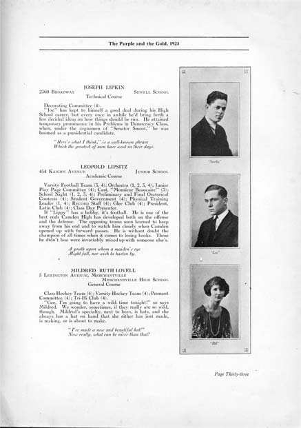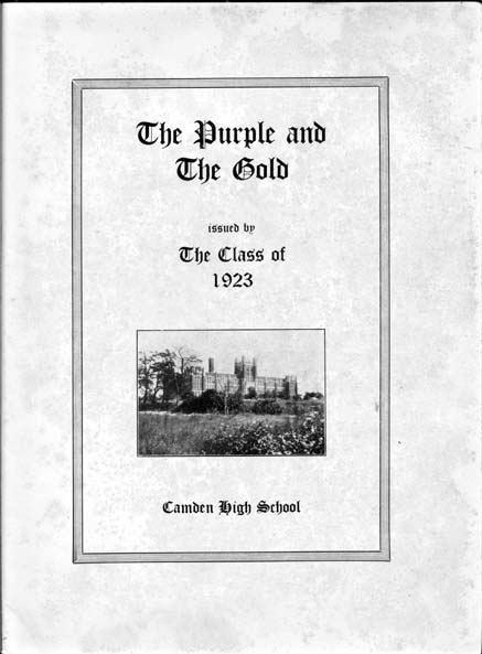 On March 3, 2009 I received from Helene Tull a copy of Camden High School's 1923 yearbook, The Purple and the Gold, which had belonged to her aunt, Anna G. Laibow, as well as graduation photos of the class from that year and from 1920 when they had graduated from the old Junior High School Number 1, located at Haddon and Newton Avenues, which was later renamed Clara S. Burrough Junior High School. The book is presented here in its entirety, with hyperlinks to pages within and outside of this website. If you have any comments or questions, please comment at the bottom of the page. Phil