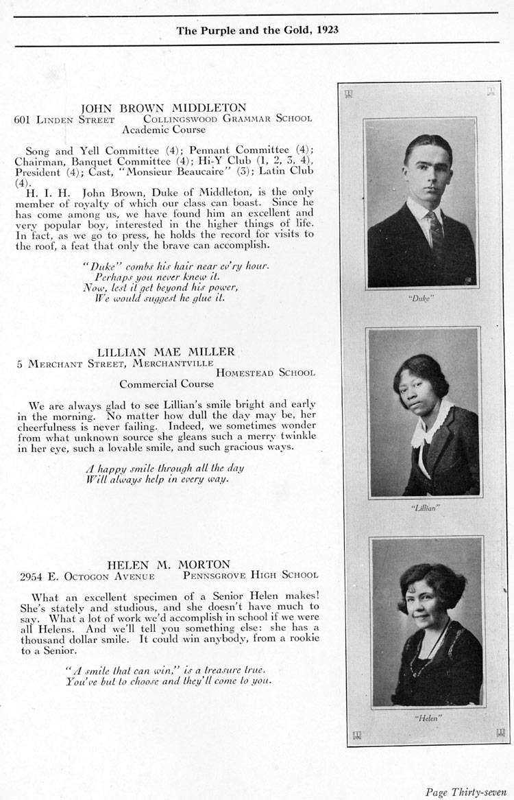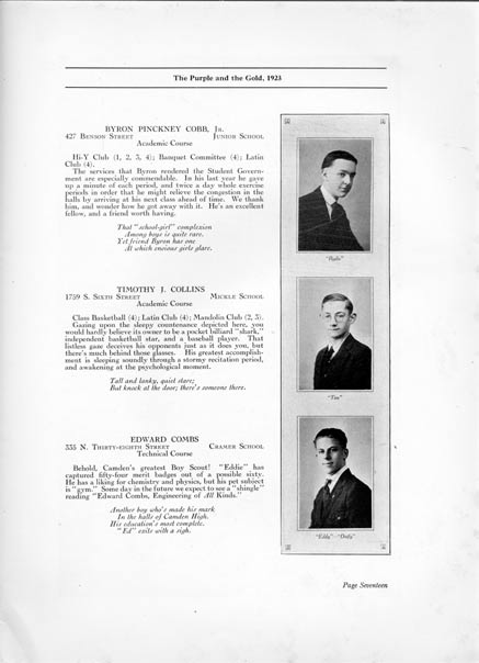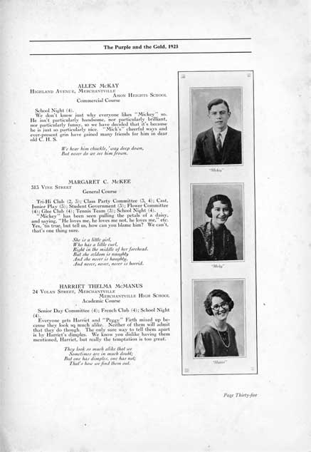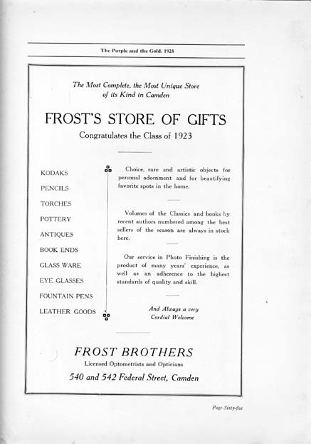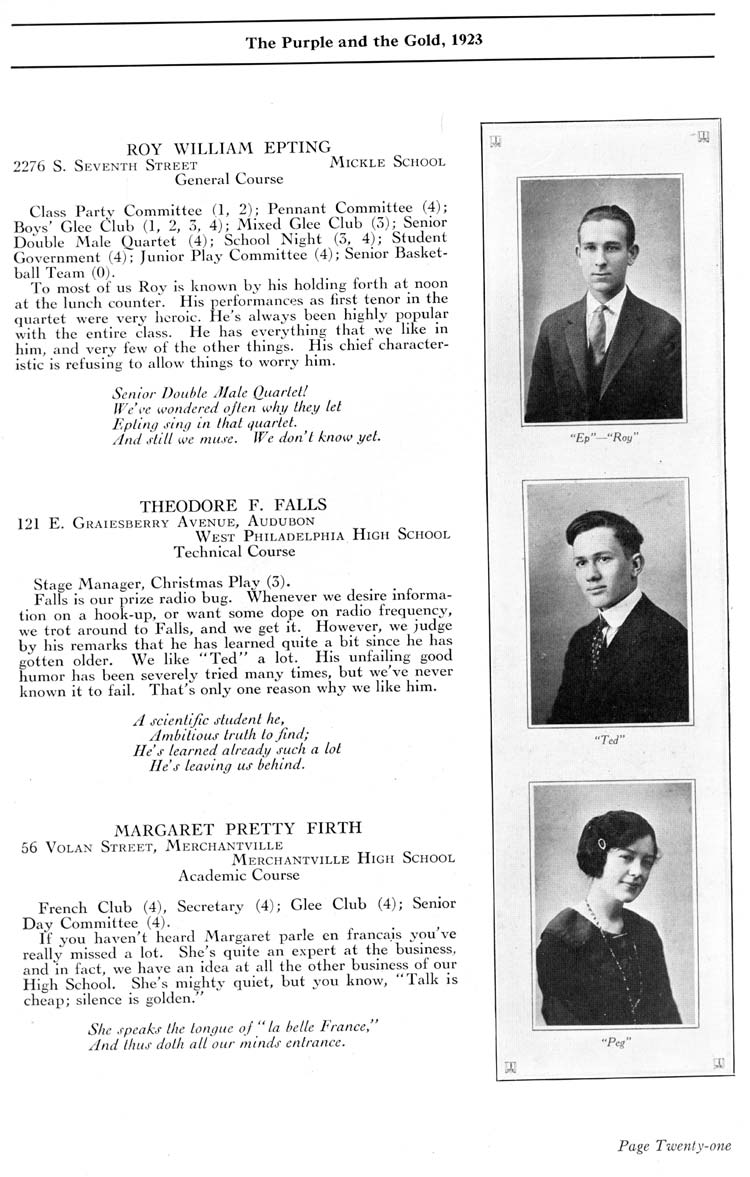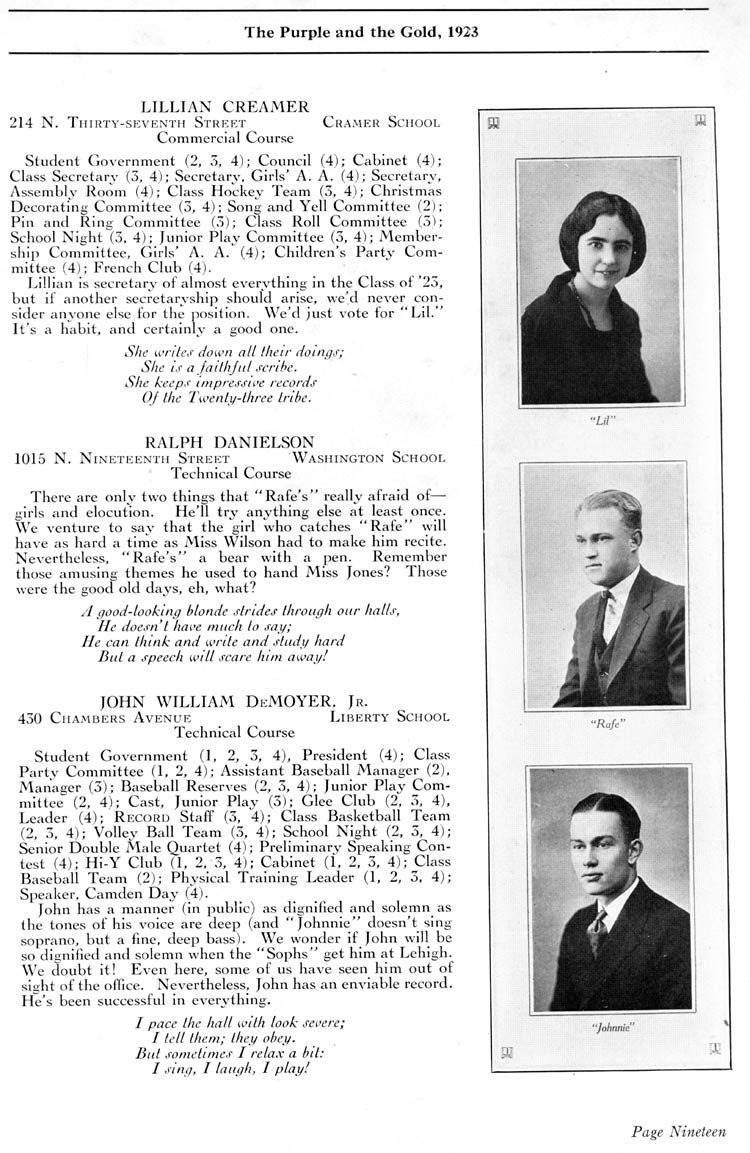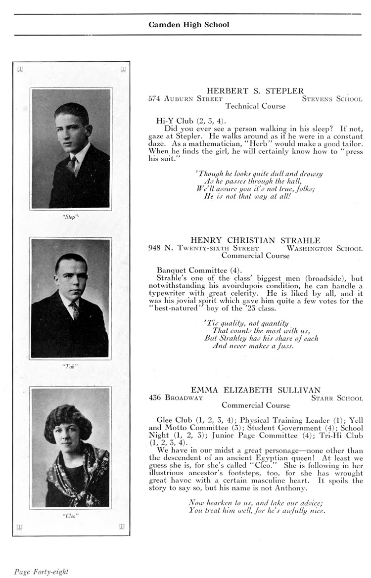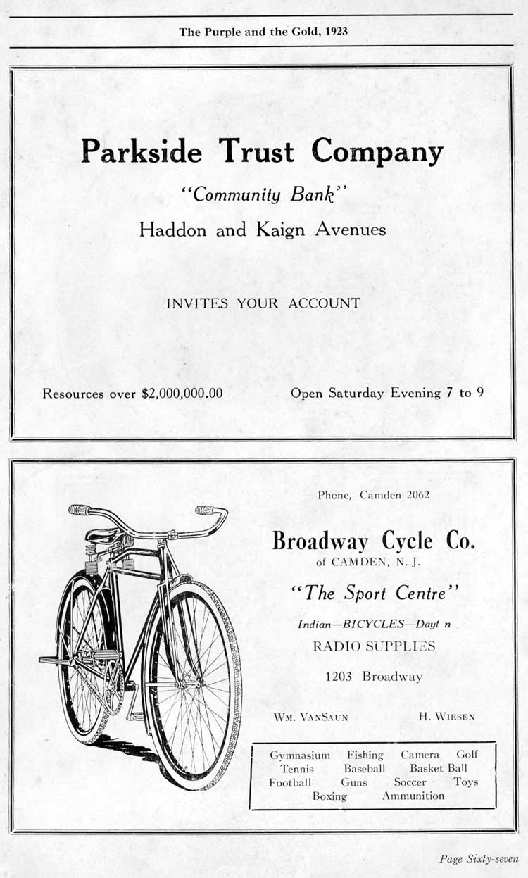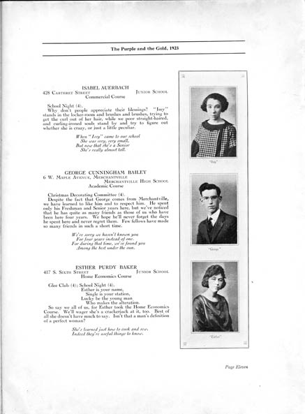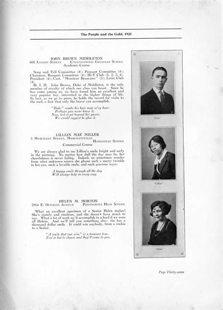 On March 3, 2009 I received from Helene Tull a copy of Camden High School's 1923 yearbook, The Purple and the Gold, which had belonged to her aunt, Anna G. Laibow, as well as graduation photos of the class from that year and from 1920 when they had graduated from the old Junior High School Number 1, located at Haddon and Newton Avenues, which was later renamed Clara S. Burrough Junior High School. The book is presented here in its entirety, with hyperlinks to pages within and outside of this website. If you have any comments or questions, please comment at the bottom of the page. Phil