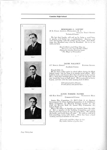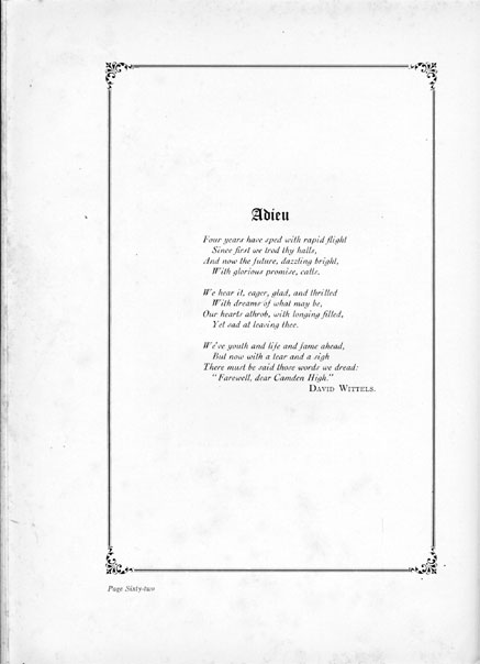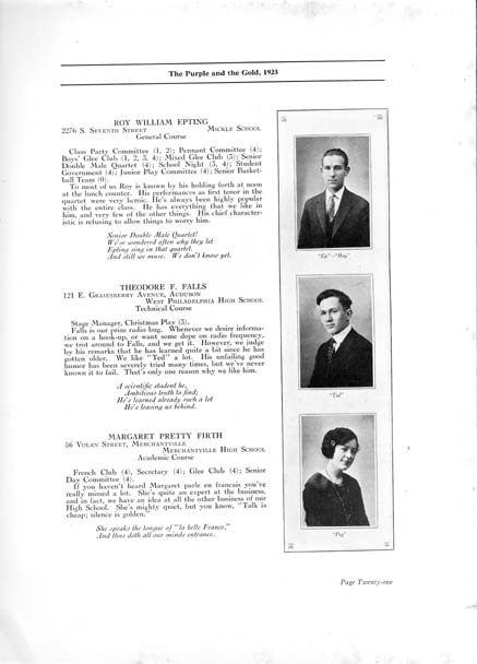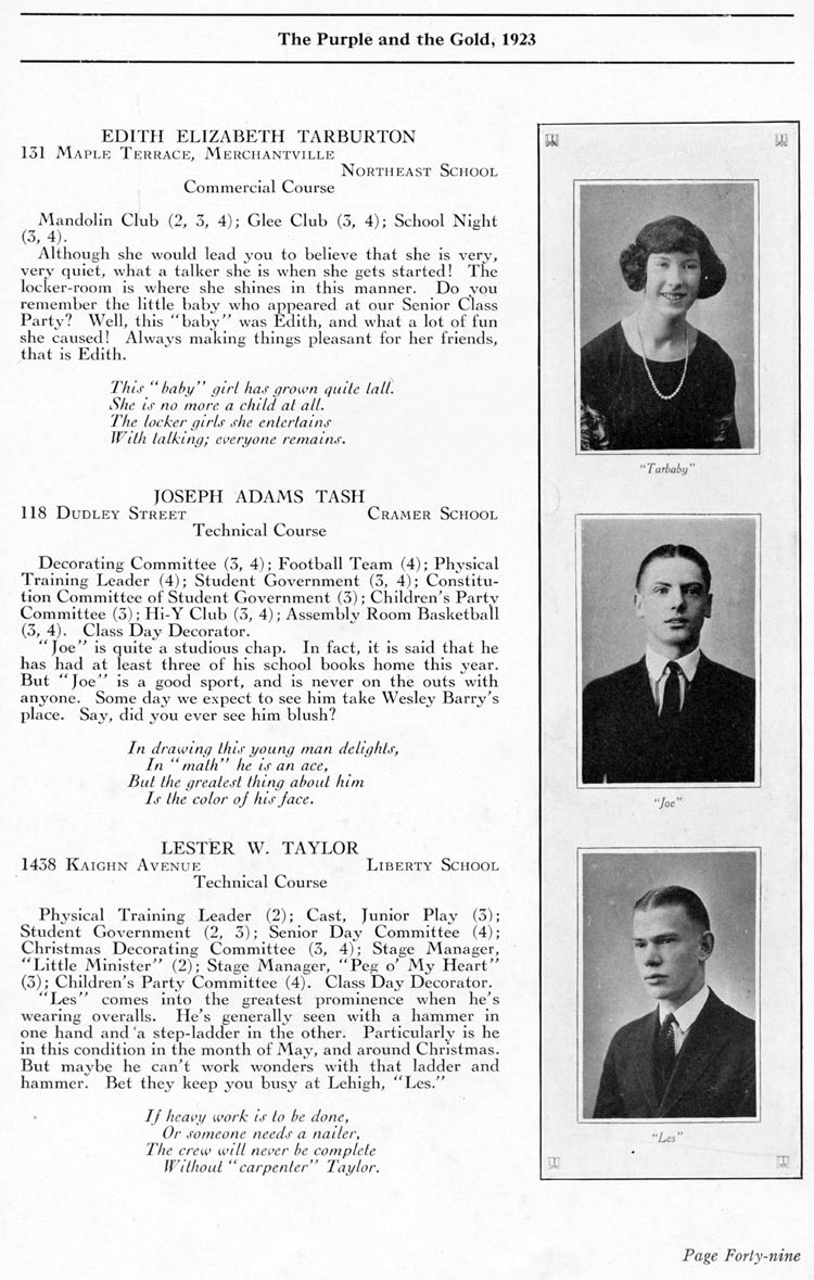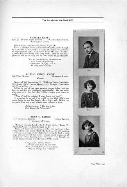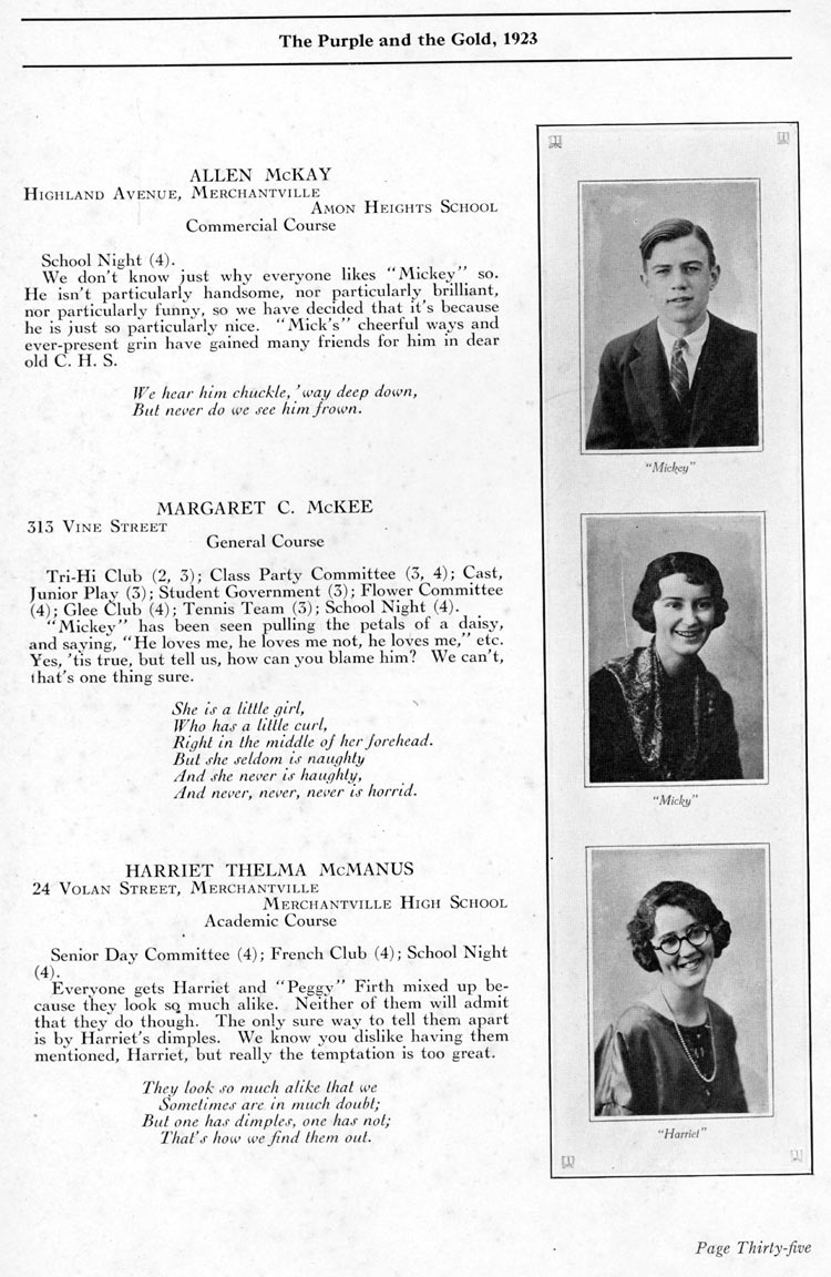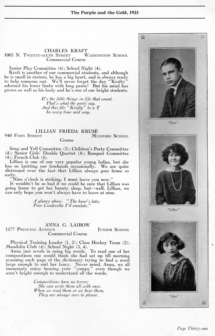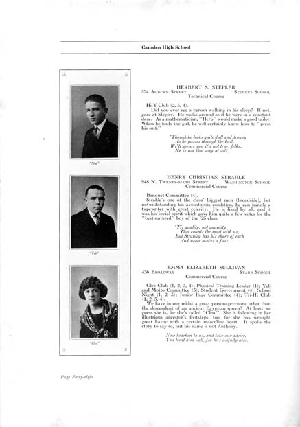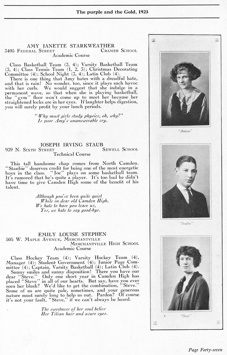 On March 3, 2009 I received from Helene Tull a copy of Camden High School's 1923 yearbook, The Purple and the Gold, which had belonged to her aunt, Anna G. Laibow, as well as graduation photos of the class from that year and from 1920 when they had graduated from the old Junior High School Number 1, located at Haddon and Newton Avenues, which was later renamed Clara S. Burrough Junior High School. The book is presented here in its entirety, with hyperlinks to pages within and outside of this website. If you have any comments or questions, please comment at the bottom of the page. Phil