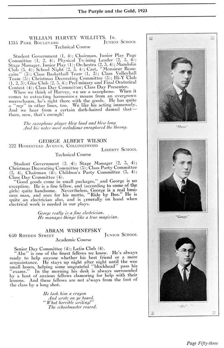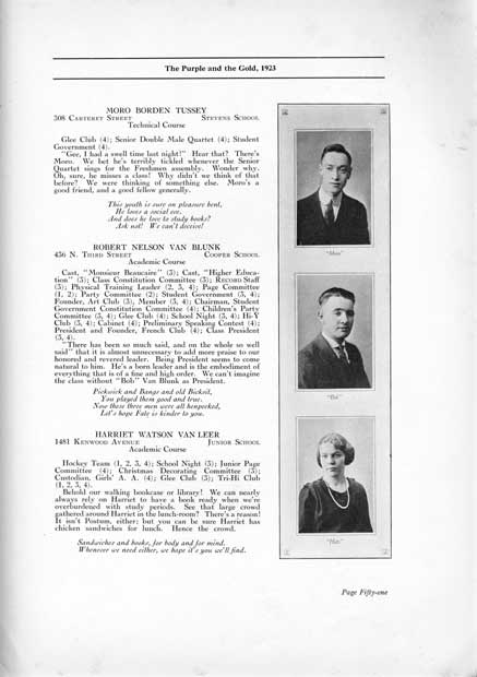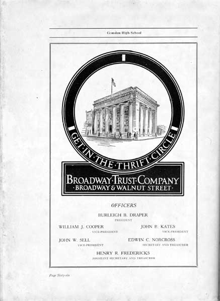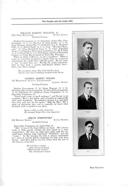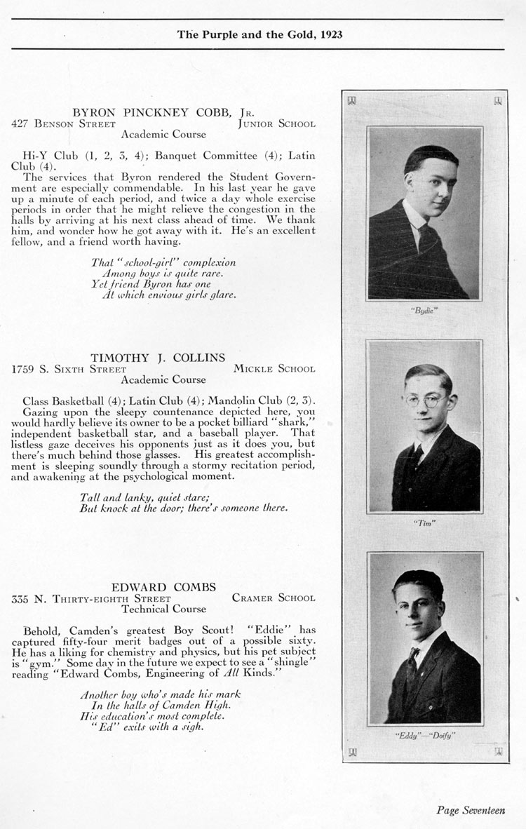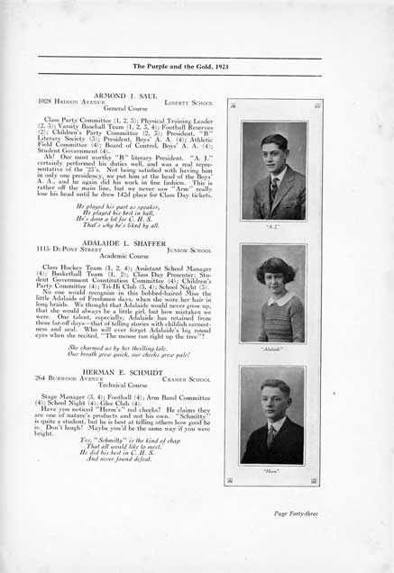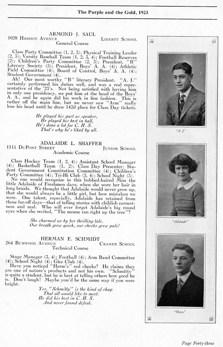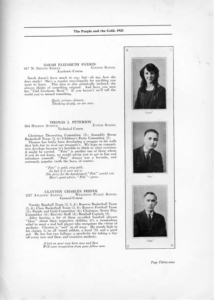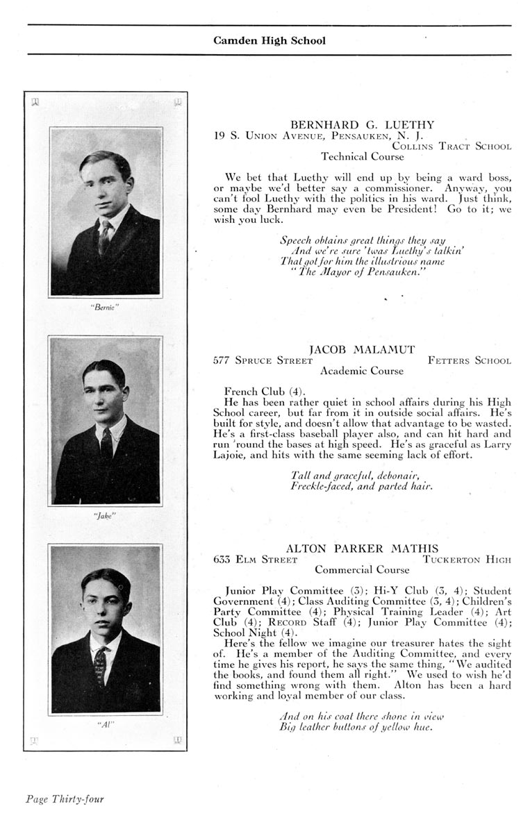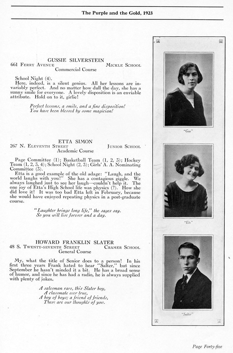 On March 3, 2009 I received from Helene Tull a copy of Camden High School's 1923 yearbook, The Purple and the Gold, which had belonged to her aunt, Anna G. Laibow, as well as graduation photos of the class from that year and from 1920 when they had graduated from the old Junior High School Number 1, located at Haddon and Newton Avenues, which was later renamed Clara S. Burrough Junior High School. The book is presented here in its entirety, with hyperlinks to pages within and outside of this website. If you have any comments or questions, please comment at the bottom of the page. Phil