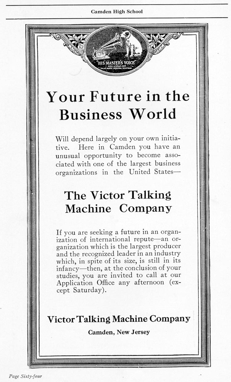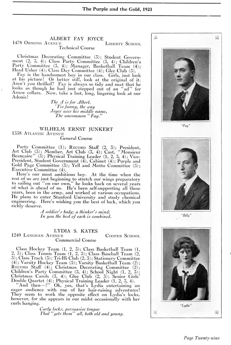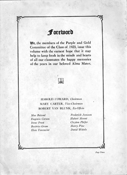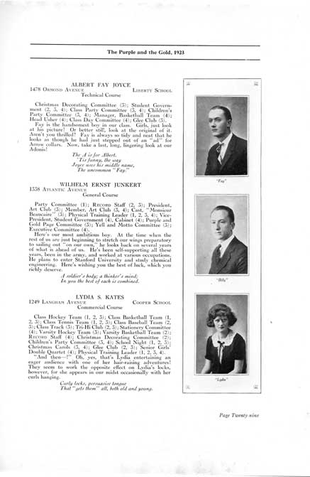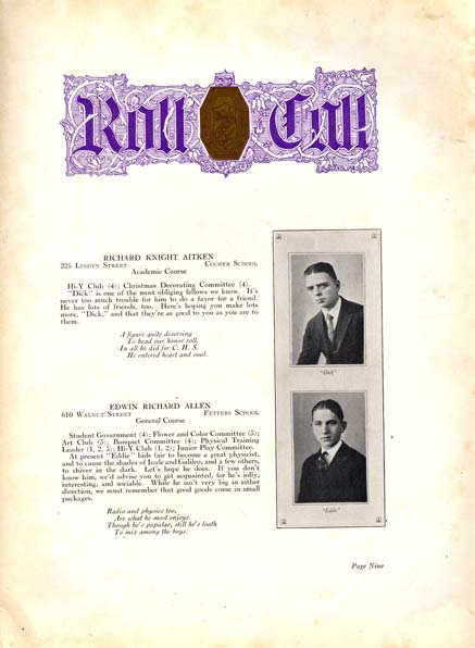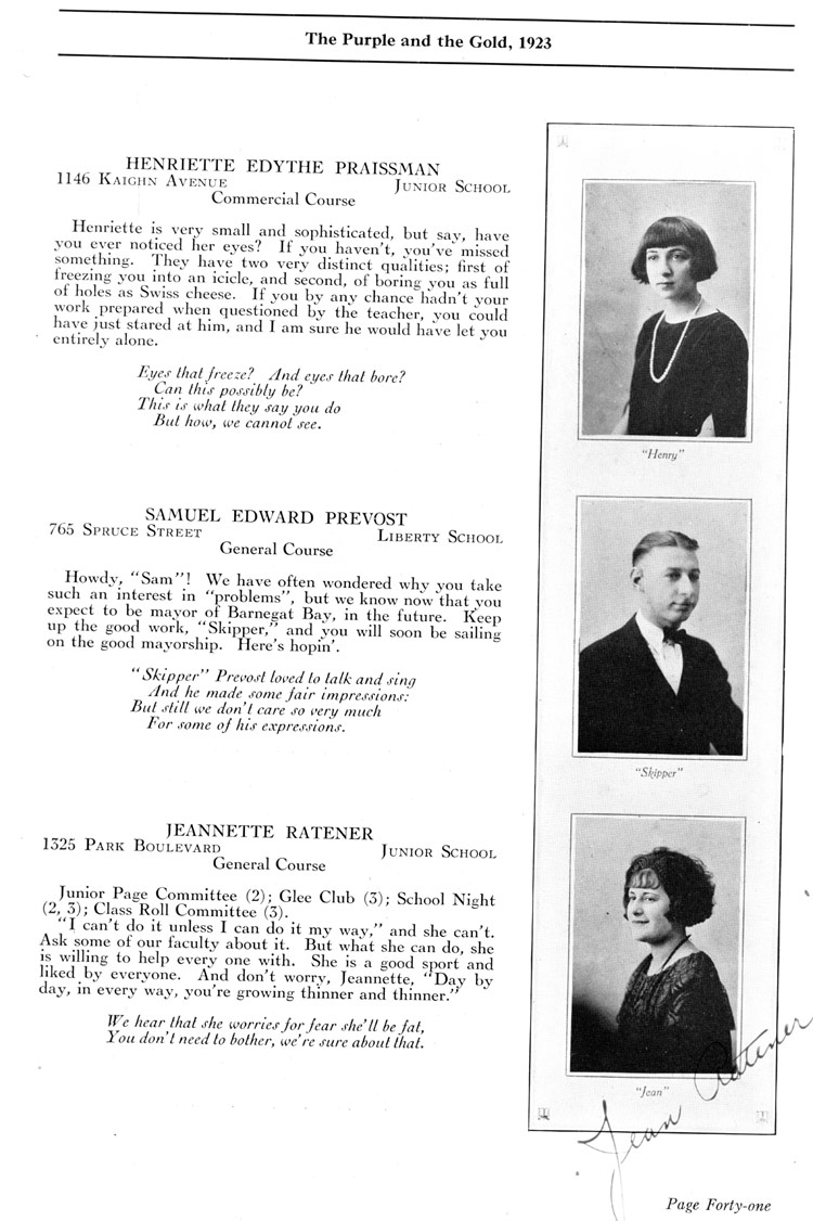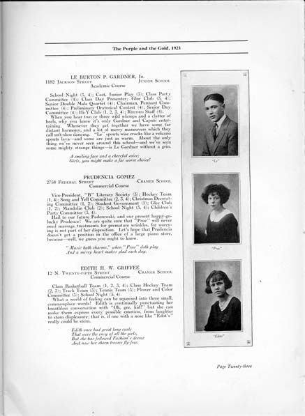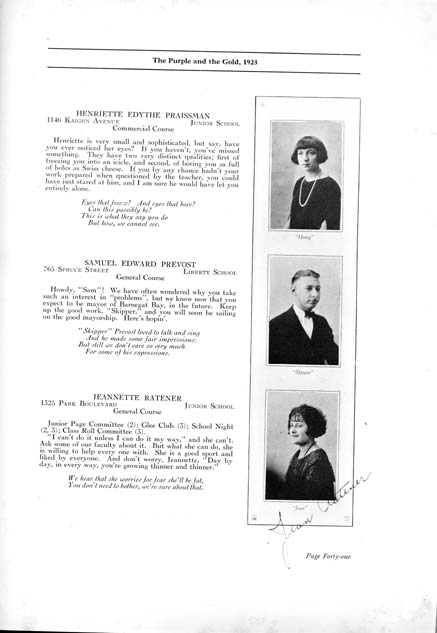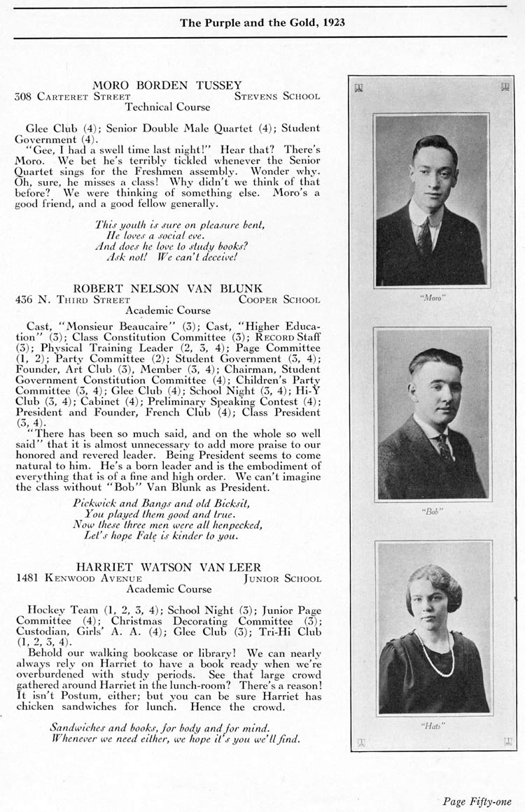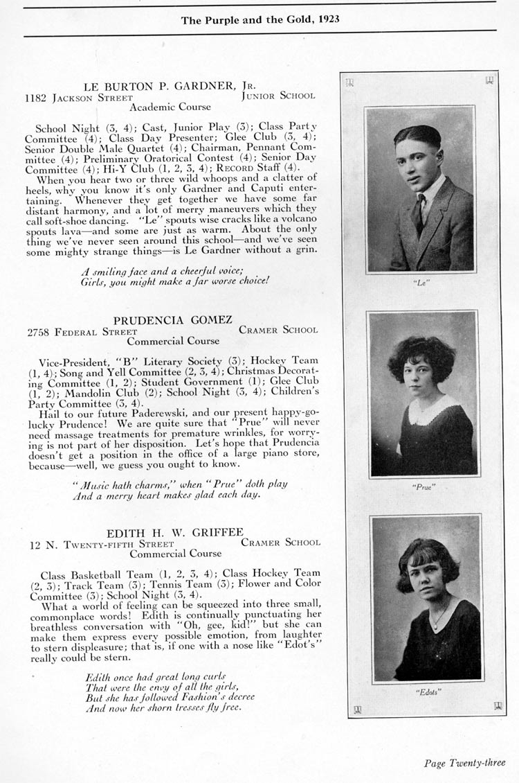 On March 3, 2009 I received from Helene Tull a copy of Camden High School's 1923 yearbook, The Purple and the Gold, which had belonged to her aunt, Anna G. Laibow, as well as graduation photos of the class from that year and from 1920 when they had graduated from the old Junior High School Number 1, located at Haddon and Newton Avenues, which was later renamed Clara S. Burrough Junior High School. The book is presented here in its entirety, with hyperlinks to pages within and outside of this website. If you have any comments or questions, please comment at the bottom of the page. Phil