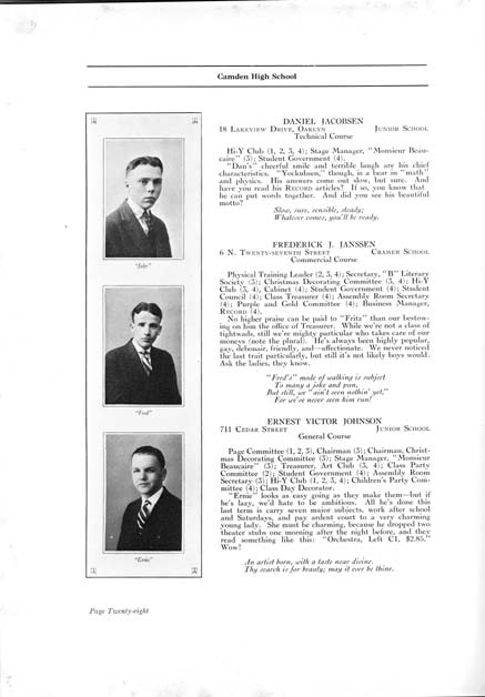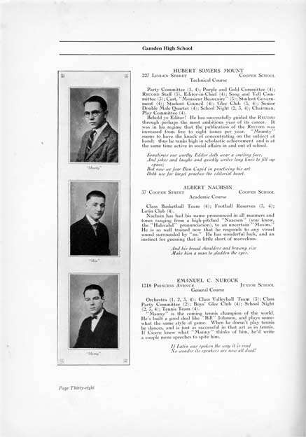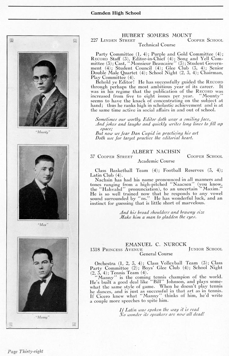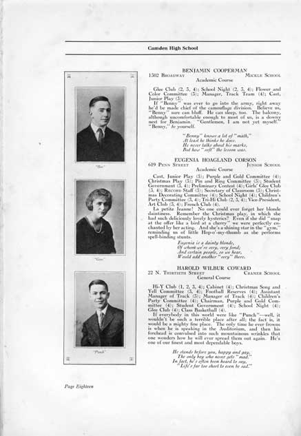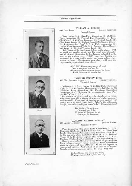 Camden High School has a long and distinguished history. Many of its graduates went on to careers in public service in the city, to success in business, sports, and in the arts. As time goes by, I will be adding pictures, news articles, and other material about Camden High School. If you have any material that you would like to see posted on this page, PLEASE contact me by e-mail. Phil Cohen |