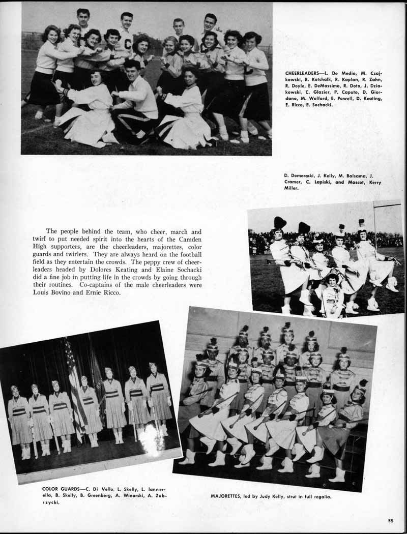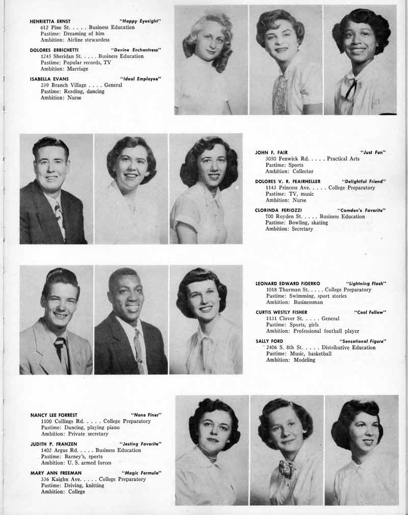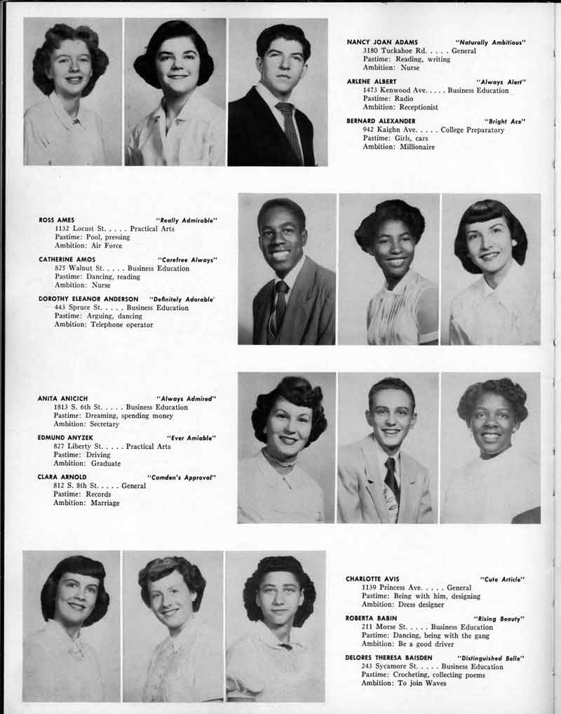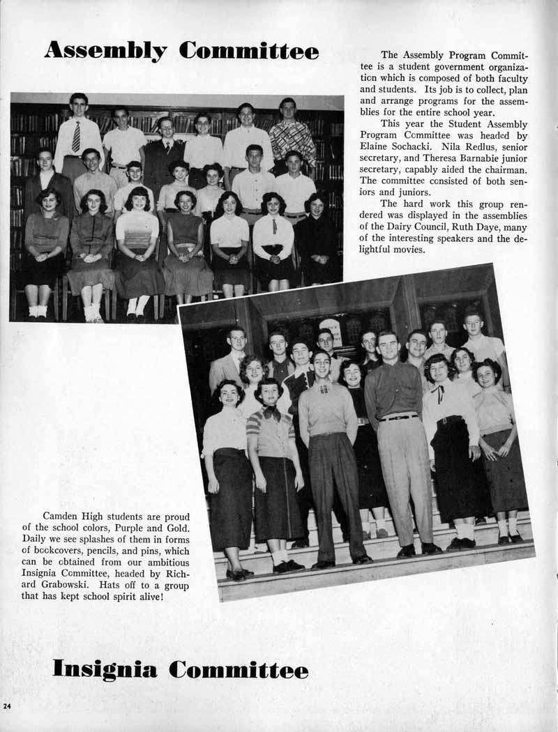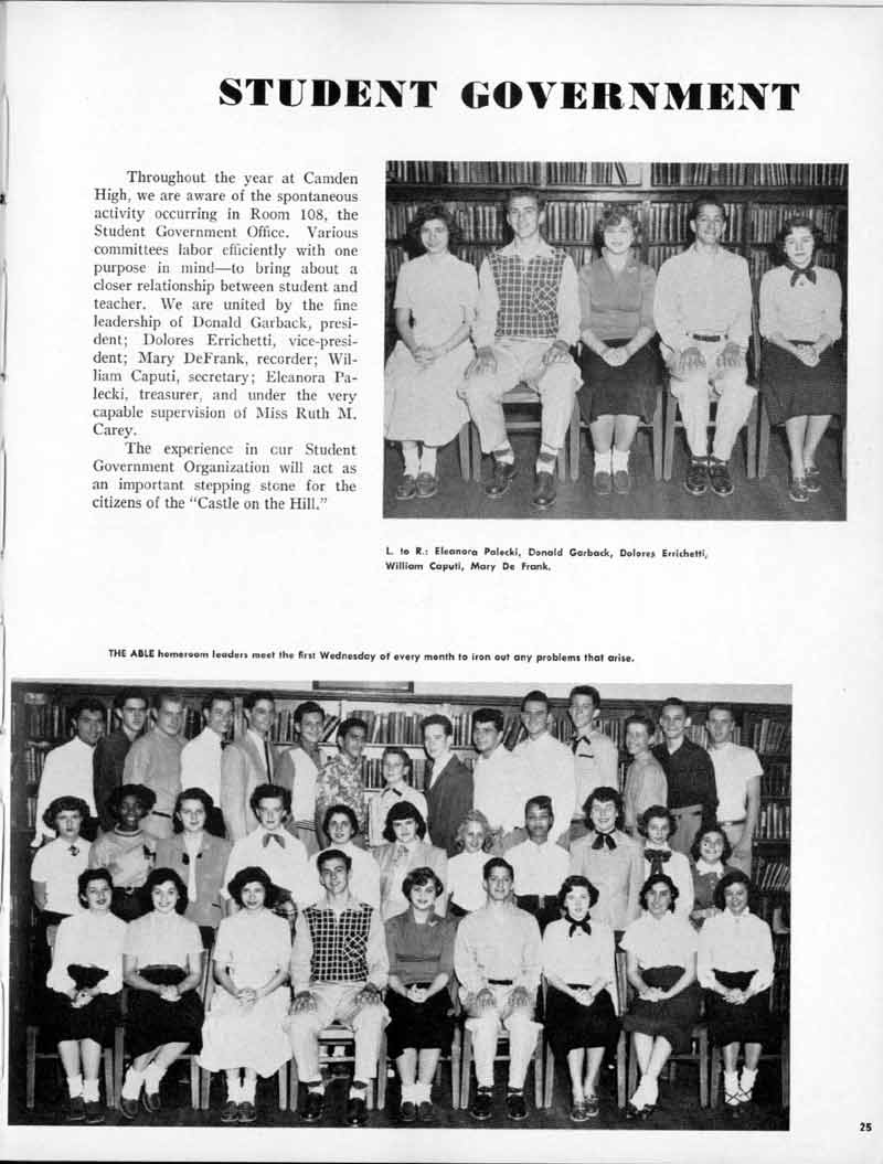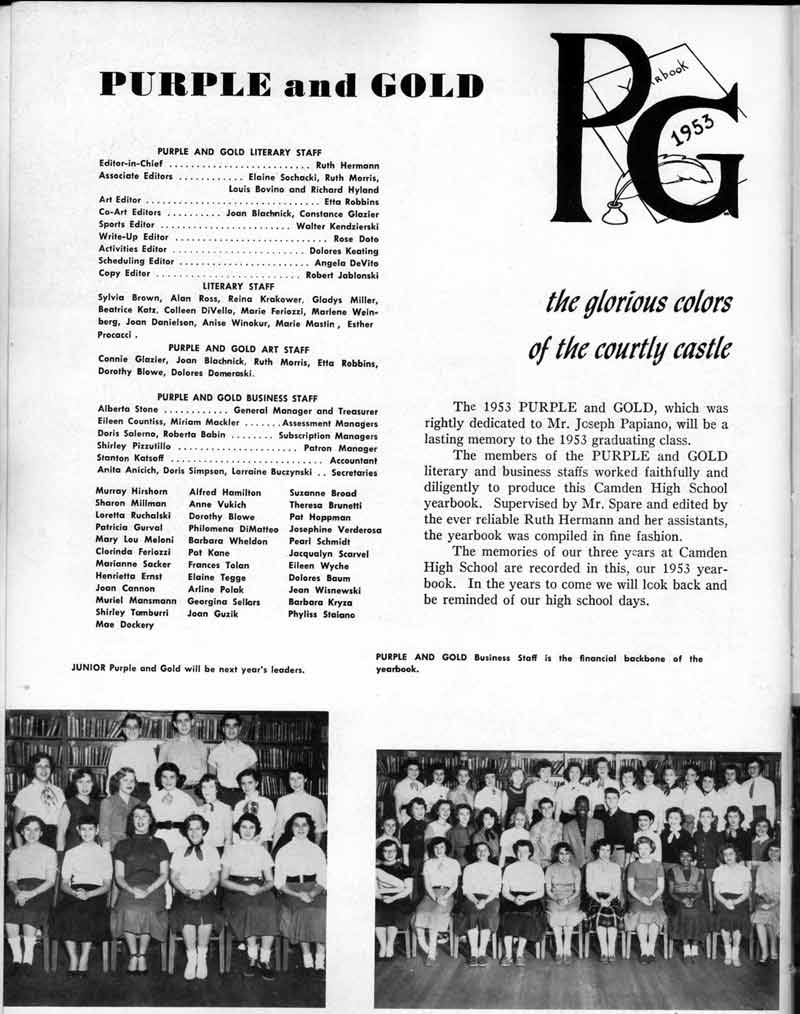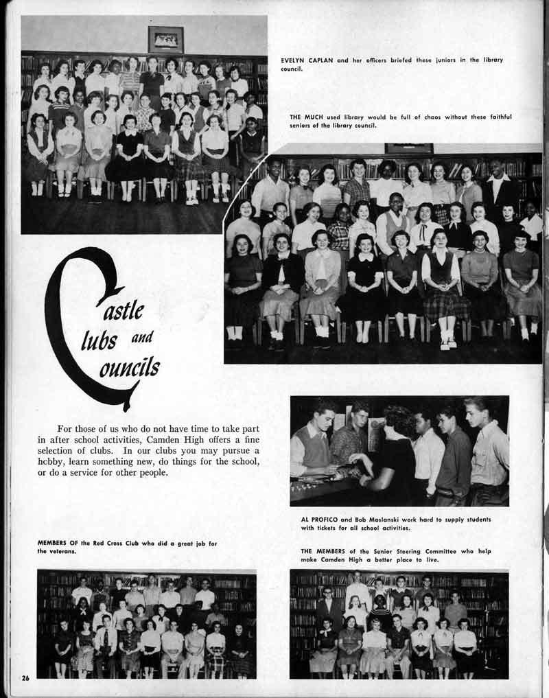 SENIOR ACTIVITIES NANCY ADAMS-Dance Club, Chess Club, Badminton, Purple and Gold Business Staff. ARLENE ALBERT-Crocheting Club, Girls' A.A., Dramatic Club, Charm and Fashion Club. BERNARD ALEXANDER-Psychology Club. ROSS AMES-Fix-It-Yourself Club, Hi-Y Club. CATHERINE AMOS-Twirling Club, Basketball, Archery, Hockey, Canasta Club, Typing Club, Home Room Leader. DOROTHY ANDERSON-Game Club, Art Club, Art Slides, Home Room Secretary, Typing Club, Nurse's Office,. Guidance Office. ANITA ANICICH-Dance Club, Purple and Gold Business Staff, Record Subscription Staff, Senior Prom Committee, Dr. Koppenhaver's Office. EDMUND ANYZEK-Contract Bridge Club, Red Cross Club, Red Cross Arts. CLARA ARNOLD-Game Club. Pantomime Club, Glee Club, Senior Steering Committee, Guidance Council, Nurse's Office, Big Sister, Refreshment Committee, Hostess for. Children's Home Party and National Honor Society Tea. CHARLOTTE AVIS-Typing Club, Red Cross Activity Club. ROBERTA BABIN-Crocheting Club, Basketball, Purple and Gold Business Staff, Manager of Purple and Gold Subscriptions, Senior Steering Committee. DELORES BAISDEN-Crocheting Club, Red Cross Club, Dra-matic Club, Intramural Sports. JOHN BALLINGHOFF-Red Cross Art Club. MILDRED BALSAMA-Lieutenant Varsity Majorettes, Maj.or-ette Club, Twirling Club, Record Distributing Staff, Senior Guidance Council. NINA BANKS--Pantomime Club, Knitting Club, Basketball, Advanced Typing Club. JOHN BASKERVILLE-President Hi-Y Club, Baseball, Foot-ball Club, Usher, Football, Traffic. LUTHER BATES-Hi-Y Club, Boys' Sports, Baseball. DELORES BAUM-Dance Club, Home Room Secretary, Purple and Gold Business Staff, Student Government, Home Room Leader, Library Council, Decorating Committee, Nurse's Office, Social Committee. ALFONSO BETHEA-Sports Club, Typing Club. JOAN BICKER-Chess and Checkers Club, Library Council, Charm and Fashion Club, Junior Decorating Committee, Nurse's Office, Dr. Koppenhaver's Office, Guidance Office, Big Sister, Senior Steering Committee. DIANE BIEDERMAN-Dance Club, Air Raid Aid, Red Cross Club .. JOAN BLACKNIAK-Art, Club, Classical Club, Halloween Painting, Red Cross Art Club, Junior Decorating Committee, Tennis, Badminton, Swimming Club, Camden Figh Calendar Art Staff, Associate Art Editor, Purple and Gold, Charm Club. SHELDON BODNER-Stamp Club, Pinochle Club, Psychology Club. BARBARA BONE-Home Room Leader, Record Salesman, Golf Club, Swimming, Assistant Manager Record Sales and Circula-tion, Student Government Office, Big Sister, Secretary-treasurer Chess and Checkers Club. CATHERINE BOYLAN-Twirling Club, Home Room Vice-President, Air Raid Aid, Typing Club, Nurse's Office, Record Sales and. Circulation, Swimming, G.A.A. Representative, Rep-resentative to Citizenship Institute. JOSEPHINE BORREGGINE-Fix-It-Yourself Club, Golf Club, Library Council, Traffic Club Office, Record Literary, Nurse's Office, Senior Class Show. BRUCE BORTNER---'-Hunting and Fishing Club, Psychology Club, Speech Assembly Program, Junior Class Play, Castle Crier Photography Editor, Record Photography Editor, Semi-Finalist Public Speaking Contest, Golf team. LOUIS BOVINO-Sports Club, Junior Class Play, Baseball, Pantomime Club, Home Room Leader, Finalist Public Speaking Contest, Co-Captain of Cheerleaders, Student Government, Chairman Brooks-Irving Trophy Committee, Purple and Gold Literary Staff, Associate Editor, Senior Class Treasurer, Big Brother; Decorating Committee .. DELLA BOYD-Public Speaking Club, Crocheting Club, Girls' A.A., Record Business and Advertising Staff. DONALD BRIGHT-Basketball, Baseball, Assembly Program Committee, Junior Decorating Committee, Junior Prom Committee, Basketball Club, Junior Class Show, "Good News," Senior Class Play, Senior Class Steering Committee, Chi"istmas Decorat-ing Committee, Big Brother. EARL BROWN-J.V. Football Team, Football Club, Canasta Club. ESTER BROWN-Future Teachers Program Chairman, Begin-ners Typing, Record Sales and Circulation, Library Council. HERBERT BROWN-Hi-Y Club, Boy's Sports Club, Track Team. SYLVIA BROWN-Gifts and Accessories, Classical Club, Arch-ery, Hockey, Basketball, Baseball, Psychology Club, Girls' A.A. Secretary, Library Council, Purple and Gold Literary Staff, Traffic, Senior Show, Big Sister. Quill and Scroll. LORRAINE BUCZYNSKI-Purple and Gold Social Activities, Checkers Club, Bowling, Purple and Gold Business Staff Secretary, Dr. Koppenhaver's Office. SAMUEL BUELL-Football Club. Football Team, Baseball, Ushers, Welfare Chest Committee, President Boys' A.A., Home Room Leader, Baseball Club. ANTHONY BUTCH-Football Manager, Fix-It-Yourself Club, Hunting and Fishing Club. DOROTHY COLLOPY-Red Cross Art, Record Art Staff, Home Room Secretary, Scenery Painter, Quill and Scroll, Purple and Gold Business Staff. HARRY CANDERA-Fix-It-Yourself Club, Art Slides, Red Cross Art. ROBERT CANTERMAN-Red Cross Art, Red Cross Art Club. RUTH CARR-Home Room Secretary, Dramatics Club, Home Room Leader, Red Cross Club. CYNTHIA CANNON-Twirlers Club, Knitting Club, Volley Ball, Charm and Fashion Club, Big Sister. JOAN CANNON-Gifts and Accessories Clubs, Basketball, Christmas Decorations, Purple and Gold Business Staff, Home Room Secretary. EVELYN CAPLAN-Red Cross Aids, Coral Reading, Spring Show, Red Cross Club, Library Council President, Music Office, "Good News," Red Cross Program Chairman, Welfare Chest Committee, National Honor Society. FRANK CARDUCCI-Classical Club, Hi-Y Club, Pantomime Club, Pinochle Club. LEWIS CARP-Fix-lit- Yourself Club, Christmas Play, Junior J,J.'s, Usher, Traffic, Student Government, Welfare Chest Committee, Golf Team. HARRY CARSON-Stamp Club, Fix-It-Yourself Club. GLADYS CHAPMAN-Game Club, Charm and Fashion Club, Color Guard Manager, Typing Club, Varsity Color Guard Club, Guidance Office. THOMAS CICCHITTI-Red Cross Art, French Club, Junior Play, Hi-Larities of '51, Junior Prom Committee, Band, Christ-mas Decorating, Senior Play Committee, Ticket Committee, Social Committee, Student Government, Stage Manager for