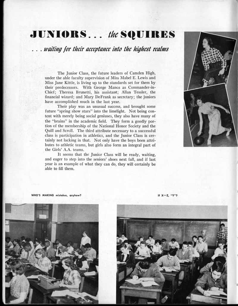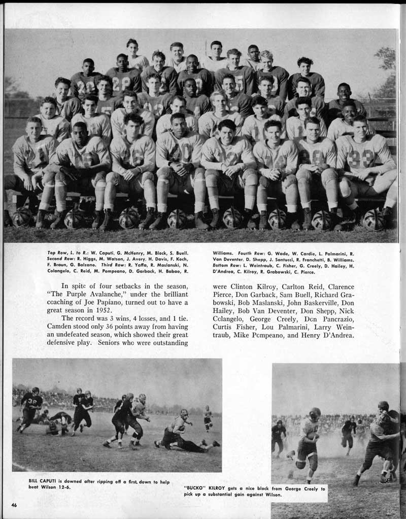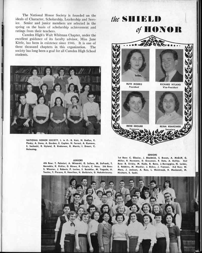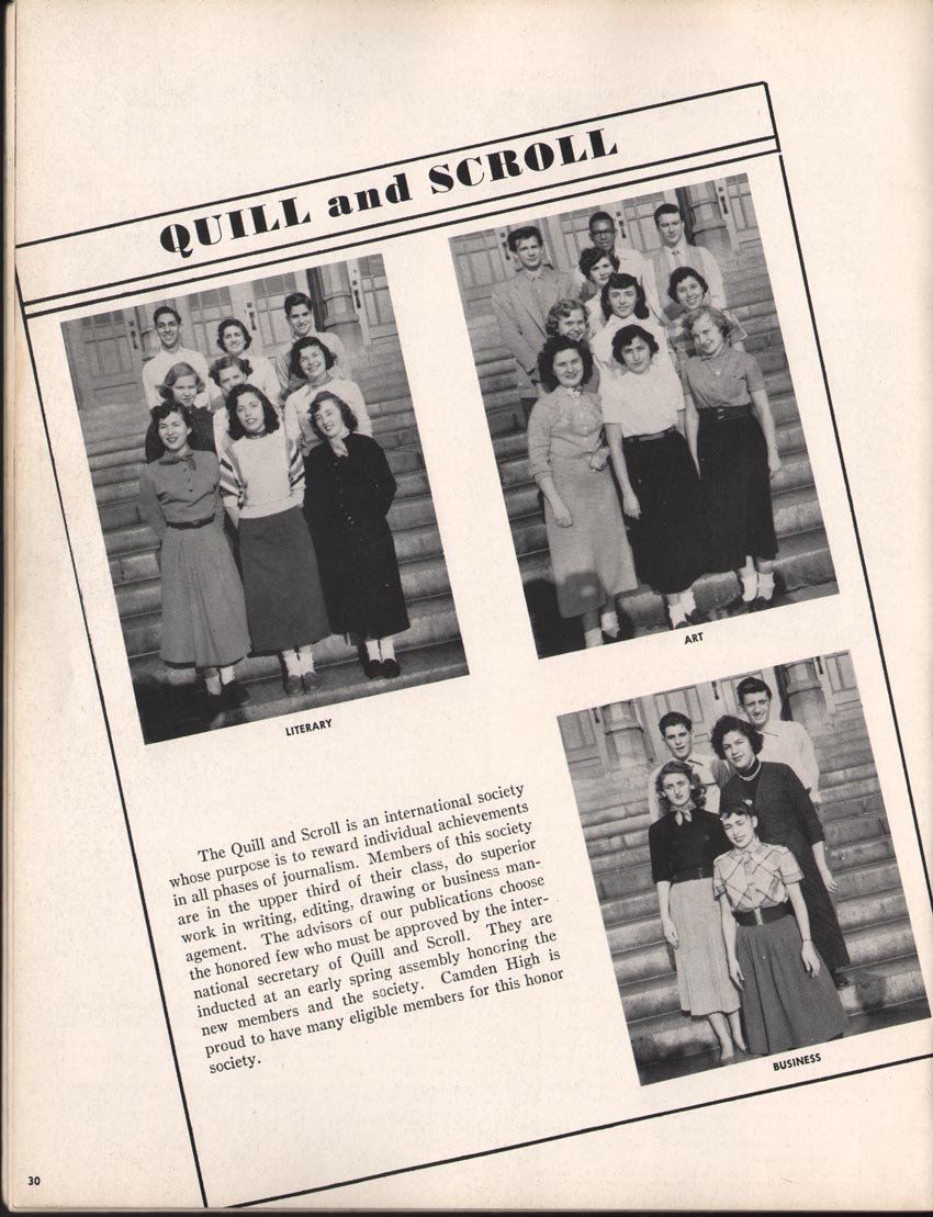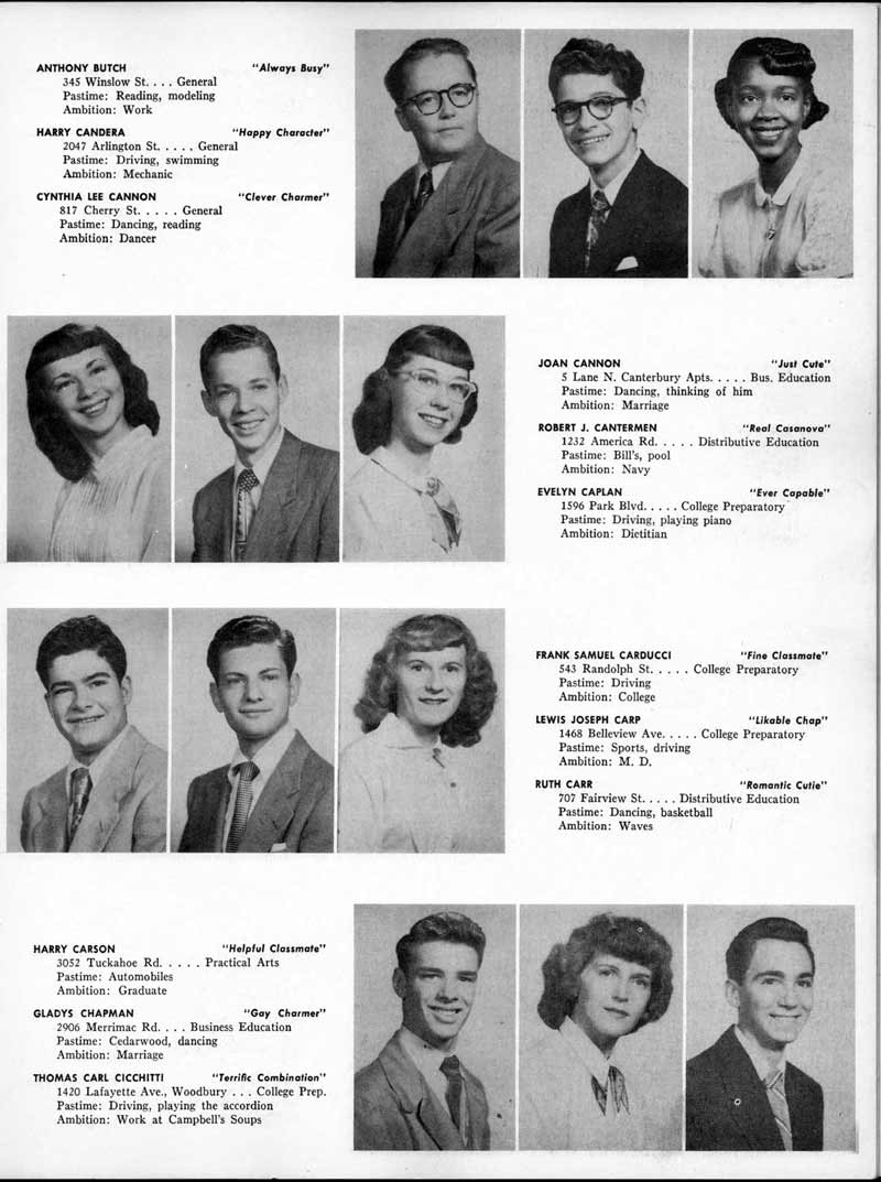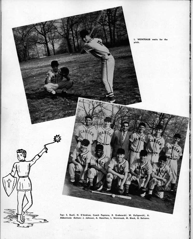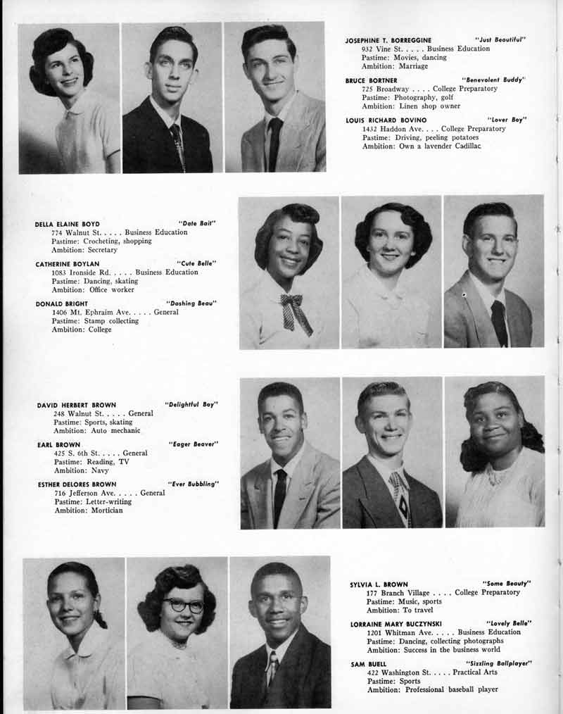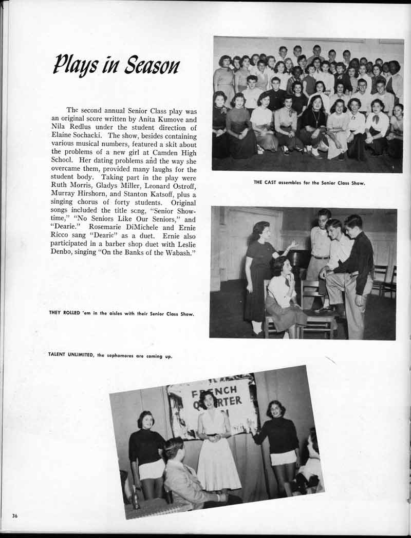 SENIOR ACTIVITIES NANCY ADAMS-Dance Club, Chess Club, Badminton, Purple and Gold Business Staff. ARLENE ALBERT-Crocheting Club, Girls' A.A., Dramatic Club, Charm and Fashion Club. BERNARD ALEXANDER-Psychology Club. ROSS AMES-Fix-It-Yourself Club, Hi-Y Club. CATHERINE AMOS-Twirling Club, Basketball, Archery, Hockey, Canasta Club, Typing Club, Home Room Leader. DOROTHY ANDERSON-Game Club, Art Club, Art Slides, Home Room Secretary, Typing Club, Nurse's Office,. Guidance Office. ANITA ANICICH-Dance Club, Purple and Gold Business Staff, Record Subscription Staff, Senior Prom Committee, Dr. Koppenhaver's Office. EDMUND ANYZEK-Contract Bridge Club, Red Cross Club, Red Cross Arts. CLARA ARNOLD-Game Club. Pantomime Club, Glee Club, Senior Steering Committee, Guidance Council, Nurse's Office, Big Sister, Refreshment Committee, Hostess for. Children's Home Party and National Honor Society Tea. CHARLOTTE AVIS-Typing Club, Red Cross Activity Club. ROBERTA BABIN-Crocheting Club, Basketball, Purple and Gold Business Staff, Manager of Purple and Gold Subscriptions, Senior Steering Committee. DELORES BAISDEN-Crocheting Club, Red Cross Club, Dra-matic Club, Intramural Sports. JOHN BALLINGHOFF-Red Cross Art Club. MILDRED BALSAMA-Lieutenant Varsity Majorettes, Maj.or-ette Club, Twirling Club, Record Distributing Staff, Senior Guidance Council. NINA BANKS--Pantomime Club, Knitting Club, Basketball, Advanced Typing Club. JOHN BASKERVILLE-President Hi-Y Club, Baseball, Foot-ball Club, Usher, Football, Traffic. LUTHER BATES-Hi-Y Club, Boys' Sports, Baseball. DELORES BAUM-Dance Club, Home Room Secretary, Purple and Gold Business Staff, Student Government, Home Room Leader, Library Council, Decorating Committee, Nurse's Office, Social Committee. ALFONSO BETHEA-Sports Club, Typing Club. JOAN BICKER-Chess and Checkers Club, Library Council, Charm and Fashion Club, Junior Decorating Committee, Nurse's Office, Dr. Koppenhaver's Office, Guidance Office, Big Sister, Senior Steering Committee. DIANE BIEDERMAN-Dance Club, Air Raid Aid, Red Cross Club .. JOAN BLACKNIAK-Art, Club, Classical Club, Halloween Painting, Red Cross Art Club, Junior Decorating Committee, Tennis, Badminton, Swimming Club, Camden Figh Calendar Art Staff, Associate Art Editor, Purple and Gold, Charm Club. SHELDON BODNER-Stamp Club, Pinochle Club, Psychology Club. BARBARA BONE-Home Room Leader, Record Salesman, Golf Club, Swimming, Assistant Manager Record Sales and Circula-tion, Student Government Office, Big Sister, Secretary-treasurer Chess and Checkers Club. CATHERINE BOYLAN-Twirling Club, Home Room Vice-President, Air Raid Aid, Typing Club, Nurse's Office, Record Sales and. Circulation, Swimming, G.A.A. Representative, Rep-resentative to Citizenship Institute. JOSEPHINE BORREGGINE-Fix-It-Yourself Club, Golf Club, Library Council, Traffic Club Office, Record Literary, Nurse's Office, Senior Class Show. BRUCE BORTNER---'-Hunting and Fishing Club, Psychology Club, Speech Assembly Program, Junior Class Play, Castle Crier Photography Editor, Record Photography Editor, Semi-Finalist Public Speaking Contest, Golf team. LOUIS BOVINO-Sports Club, Junior Class Play, Baseball, Pantomime Club, Home Room Leader, Finalist Public Speaking Contest, Co-Captain of Cheerleaders, Student Government, Chairman Brooks-Irving Trophy Committee, Purple and Gold Literary Staff, Associate Editor, Senior Class Treasurer, Big Brother; Decorating Committee .. DELLA BOYD-Public Speaking Club, Crocheting Club, Girls' A.A., Record Business and Advertising Staff. DONALD BRIGHT-Basketball, Baseball, Assembly Program Committee, Junior Decorating Committee, Junior Prom Committee, Basketball Club, Junior Class Show, "Good News," Senior Class Play, Senior Class Steering Committee, Chi"istmas Decorat-ing Committee, Big Brother. EARL BROWN-J.V. Football Team, Football Club, Canasta Club. ESTER BROWN-Future Teachers Program Chairman, Begin-ners Typing, Record Sales and Circulation, Library Council. HERBERT BROWN-Hi-Y Club, Boy's Sports Club, Track Team. SYLVIA BROWN-Gifts and Accessories, Classical Club, Arch-ery, Hockey, Basketball, Baseball, Psychology Club, Girls' A.A. Secretary, Library Council, Purple and Gold Literary Staff, Traffic, Senior Show, Big Sister. Quill and Scroll. LORRAINE BUCZYNSKI-Purple and Gold Social Activities, Checkers Club, Bowling, Purple and Gold Business Staff Secretary, Dr. Koppenhaver's Office. SAMUEL BUELL-Football Club. Football Team, Baseball, Ushers, Welfare Chest Committee, President Boys' A.A., Home Room Leader, Baseball Club. ANTHONY BUTCH-Football Manager, Fix-It-Yourself Club, Hunting and Fishing Club. DOROTHY COLLOPY-Red Cross Art, Record Art Staff, Home Room Secretary, Scenery Painter, Quill and Scroll, Purple and Gold Business Staff. HARRY CANDERA-Fix-It-Yourself Club, Art Slides, Red Cross Art. ROBERT CANTERMAN-Red Cross Art, Red Cross Art Club. RUTH CARR-Home Room Secretary, Dramatics Club, Home Room Leader, Red Cross Club. CYNTHIA CANNON-Twirlers Club, Knitting Club, Volley Ball, Charm and Fashion Club, Big Sister. JOAN CANNON-Gifts and Accessories Clubs, Basketball, Christmas Decorations, Purple and Gold Business Staff, Home Room Secretary. EVELYN CAPLAN-Red Cross Aids, Coral Reading, Spring Show, Red Cross Club, Library Council President, Music Office, "Good News," Red Cross Program Chairman, Welfare Chest Committee, National Honor Society. FRANK CARDUCCI-Classical Club, Hi-Y Club, Pantomime Club, Pinochle Club. LEWIS CARP-Fix-lit- Yourself Club, Christmas Play, Junior J,J.'s, Usher, Traffic, Student Government, Welfare Chest Committee, Golf Team. HARRY CARSON-Stamp Club, Fix-It-Yourself Club. GLADYS CHAPMAN-Game Club, Charm and Fashion Club, Color Guard Manager, Typing Club, Varsity Color Guard Club, Guidance Office. THOMAS CICCHITTI-Red Cross Art, French Club, Junior Play, Hi-Larities of '51, Junior Prom Committee, Band, Christ-mas Decorating, Senior Play Committee, Ticket Committee, Social Committee, Student Government, Stage Manager for
