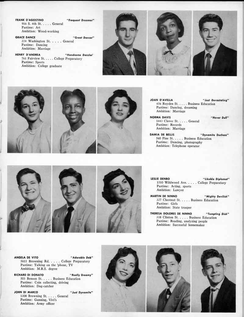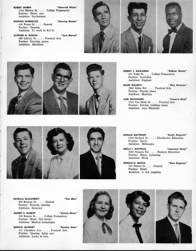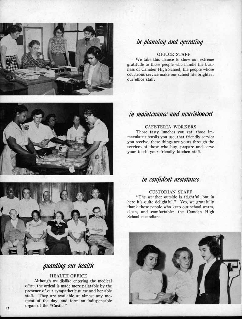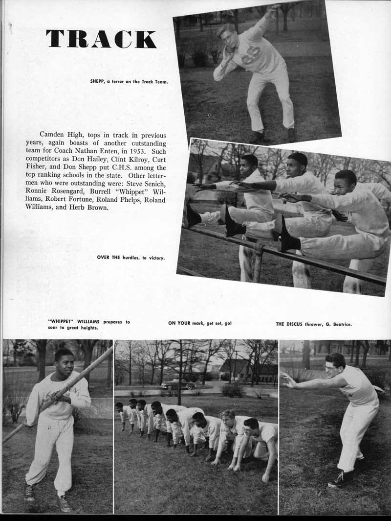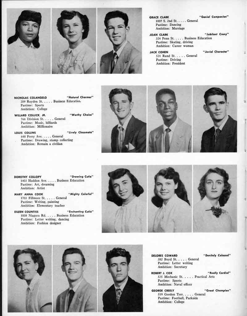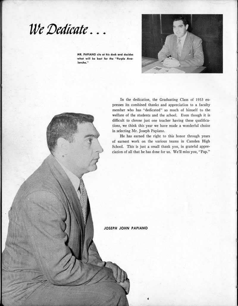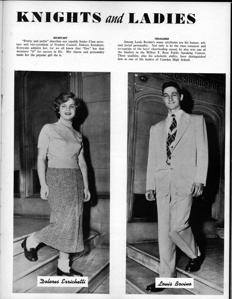 SENIOR ACTIVITIES NANCY ADAMS-Dance Club, Chess Club, Badminton, Purple and Gold Business Staff. ARLENE ALBERT-Crocheting Club, Girls' A.A., Dramatic Club, Charm and Fashion Club. BERNARD ALEXANDER-Psychology Club. ROSS AMES-Fix-It-Yourself Club, Hi-Y Club. CATHERINE AMOS-Twirling Club, Basketball, Archery, Hockey, Canasta Club, Typing Club, Home Room Leader. DOROTHY ANDERSON-Game Club, Art Club, Art Slides, Home Room Secretary, Typing Club, Nurse's Office,. Guidance Office. ANITA ANICICH-Dance Club, Purple and Gold Business Staff, Record Subscription Staff, Senior Prom Committee, Dr. Koppenhaver's Office. EDMUND ANYZEK-Contract Bridge Club, Red Cross Club, Red Cross Arts. CLARA ARNOLD-Game Club. Pantomime Club, Glee Club, Senior Steering Committee, Guidance Council, Nurse's Office, Big Sister, Refreshment Committee, Hostess for. Children's Home Party and National Honor Society Tea. CHARLOTTE AVIS-Typing Club, Red Cross Activity Club. ROBERTA BABIN-Crocheting Club, Basketball, Purple and Gold Business Staff, Manager of Purple and Gold Subscriptions, Senior Steering Committee. DELORES BAISDEN-Crocheting Club, Red Cross Club, Dra-matic Club, Intramural Sports. JOHN BALLINGHOFF-Red Cross Art Club. MILDRED BALSAMA-Lieutenant Varsity Majorettes, Maj.or-ette Club, Twirling Club, Record Distributing Staff, Senior Guidance Council. NINA BANKS--Pantomime Club, Knitting Club, Basketball, Advanced Typing Club. JOHN BASKERVILLE-President Hi-Y Club, Baseball, Foot-ball Club, Usher, Football, Traffic. LUTHER BATES-Hi-Y Club, Boys' Sports, Baseball. DELORES BAUM-Dance Club, Home Room Secretary, Purple and Gold Business Staff, Student Government, Home Room Leader, Library Council, Decorating Committee, Nurse's Office, Social Committee. ALFONSO BETHEA-Sports Club, Typing Club. JOAN BICKER-Chess and Checkers Club, Library Council, Charm and Fashion Club, Junior Decorating Committee, Nurse's Office, Dr. Koppenhaver's Office, Guidance Office, Big Sister, Senior Steering Committee. DIANE BIEDERMAN-Dance Club, Air Raid Aid, Red Cross Club .. JOAN BLACKNIAK-Art, Club, Classical Club, Halloween Painting, Red Cross Art Club, Junior Decorating Committee, Tennis, Badminton, Swimming Club, Camden Figh Calendar Art Staff, Associate Art Editor, Purple and Gold, Charm Club. SHELDON BODNER-Stamp Club, Pinochle Club, Psychology Club. BARBARA BONE-Home Room Leader, Record Salesman, Golf Club, Swimming, Assistant Manager Record Sales and Circula-tion, Student Government Office, Big Sister, Secretary-treasurer Chess and Checkers Club. CATHERINE BOYLAN-Twirling Club, Home Room Vice-President, Air Raid Aid, Typing Club, Nurse's Office, Record Sales and. Circulation, Swimming, G.A.A. Representative, Rep-resentative to Citizenship Institute. JOSEPHINE BORREGGINE-Fix-It-Yourself Club, Golf Club, Library Council, Traffic Club Office, Record Literary, Nurse's Office, Senior Class Show. BRUCE BORTNER---'-Hunting and Fishing Club, Psychology Club, Speech Assembly Program, Junior Class Play, Castle Crier Photography Editor, Record Photography Editor, Semi-Finalist Public Speaking Contest, Golf team. LOUIS BOVINO-Sports Club, Junior Class Play, Baseball, Pantomime Club, Home Room Leader, Finalist Public Speaking Contest, Co-Captain of Cheerleaders, Student Government, Chairman Brooks-Irving Trophy Committee, Purple and Gold Literary Staff, Associate Editor, Senior Class Treasurer, Big Brother; Decorating Committee .. DELLA BOYD-Public Speaking Club, Crocheting Club, Girls' A.A., Record Business and Advertising Staff. DONALD BRIGHT-Basketball, Baseball, Assembly Program Committee, Junior Decorating Committee, Junior Prom Committee, Basketball Club, Junior Class Show, "Good News," Senior Class Play, Senior Class Steering Committee, Chi"istmas Decorat-ing Committee, Big Brother. EARL BROWN-J.V. Football Team, Football Club, Canasta Club. ESTER BROWN-Future Teachers Program Chairman, Begin-ners Typing, Record Sales and Circulation, Library Council. HERBERT BROWN-Hi-Y Club, Boy's Sports Club, Track Team. SYLVIA BROWN-Gifts and Accessories, Classical Club, Arch-ery, Hockey, Basketball, Baseball, Psychology Club, Girls' A.A. Secretary, Library Council, Purple and Gold Literary Staff, Traffic, Senior Show, Big Sister. Quill and Scroll. LORRAINE BUCZYNSKI-Purple and Gold Social Activities, Checkers Club, Bowling, Purple and Gold Business Staff Secretary, Dr. Koppenhaver's Office. SAMUEL BUELL-Football Club. Football Team, Baseball, Ushers, Welfare Chest Committee, President Boys' A.A., Home Room Leader, Baseball Club. ANTHONY BUTCH-Football Manager, Fix-It-Yourself Club, Hunting and Fishing Club. DOROTHY COLLOPY-Red Cross Art, Record Art Staff, Home Room Secretary, Scenery Painter, Quill and Scroll, Purple and Gold Business Staff. HARRY CANDERA-Fix-It-Yourself Club, Art Slides, Red Cross Art. ROBERT CANTERMAN-Red Cross Art, Red Cross Art Club. RUTH CARR-Home Room Secretary, Dramatics Club, Home Room Leader, Red Cross Club. CYNTHIA CANNON-Twirlers Club, Knitting Club, Volley Ball, Charm and Fashion Club, Big Sister. JOAN CANNON-Gifts and Accessories Clubs, Basketball, Christmas Decorations, Purple and Gold Business Staff, Home Room Secretary. EVELYN CAPLAN-Red Cross Aids, Coral Reading, Spring Show, Red Cross Club, Library Council President, Music Office, "Good News," Red Cross Program Chairman, Welfare Chest Committee, National Honor Society. FRANK CARDUCCI-Classical Club, Hi-Y Club, Pantomime Club, Pinochle Club. LEWIS CARP-Fix-lit- Yourself Club, Christmas Play, Junior J,J.'s, Usher, Traffic, Student Government, Welfare Chest Committee, Golf Team. HARRY CARSON-Stamp Club, Fix-It-Yourself Club. GLADYS CHAPMAN-Game Club, Charm and Fashion Club, Color Guard Manager, Typing Club, Varsity Color Guard Club, Guidance Office. THOMAS CICCHITTI-Red Cross Art, French Club, Junior Play, Hi-Larities of '51, Junior Prom Committee, Band, Christ-mas Decorating, Senior Play Committee, Ticket Committee, Social Committee, Student Government, Stage Manager for