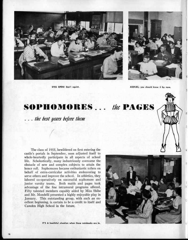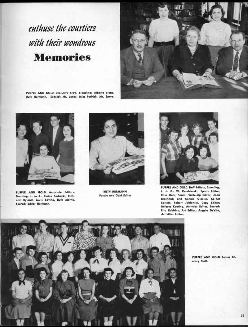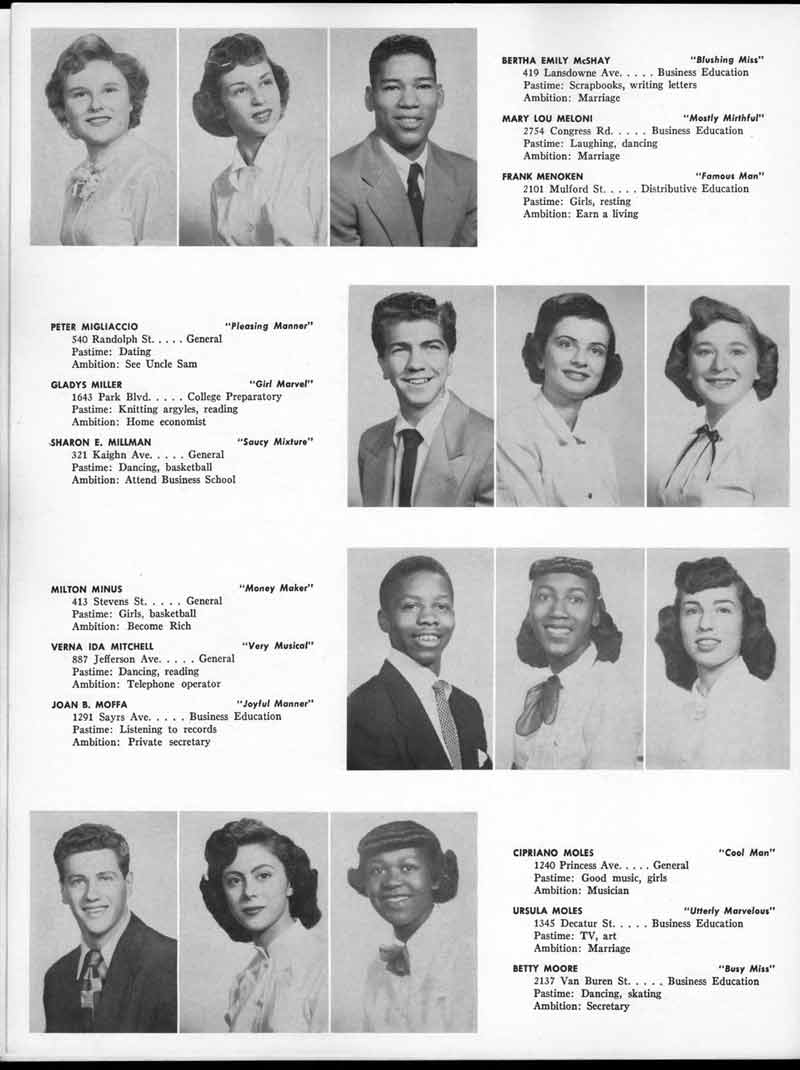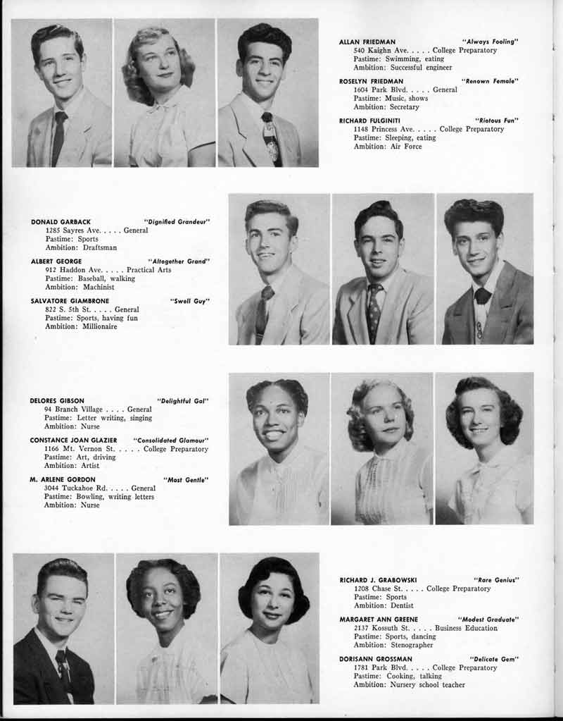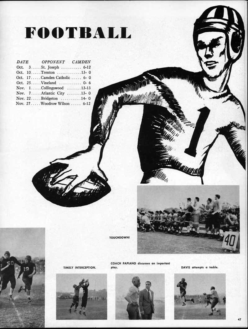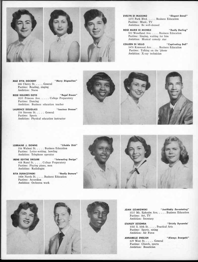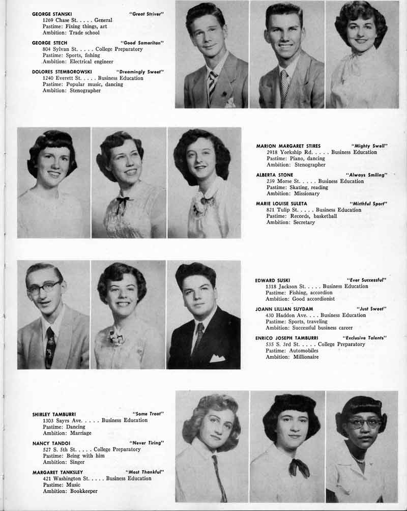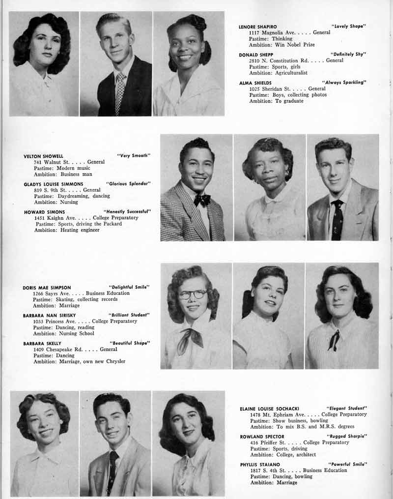 SENIOR ACTIVITIES NANCY ADAMS-Dance Club, Chess Club, Badminton, Purple and Gold Business Staff. ARLENE ALBERT-Crocheting Club, Girls' A.A., Dramatic Club, Charm and Fashion Club. BERNARD ALEXANDER-Psychology Club. ROSS AMES-Fix-It-Yourself Club, Hi-Y Club. CATHERINE AMOS-Twirling Club, Basketball, Archery, Hockey, Canasta Club, Typing Club, Home Room Leader. DOROTHY ANDERSON-Game Club, Art Club, Art Slides, Home Room Secretary, Typing Club, Nurse's Office,. Guidance Office. ANITA ANICICH-Dance Club, Purple and Gold Business Staff, Record Subscription Staff, Senior Prom Committee, Dr. Koppenhaver's Office. EDMUND ANYZEK-Contract Bridge Club, Red Cross Club, Red Cross Arts. CLARA ARNOLD-Game Club. Pantomime Club, Glee Club, Senior Steering Committee, Guidance Council, Nurse's Office, Big Sister, Refreshment Committee, Hostess for. Children's Home Party and National Honor Society Tea. CHARLOTTE AVIS-Typing Club, Red Cross Activity Club. ROBERTA BABIN-Crocheting Club, Basketball, Purple and Gold Business Staff, Manager of Purple and Gold Subscriptions, Senior Steering Committee. DELORES BAISDEN-Crocheting Club, Red Cross Club, Dra-matic Club, Intramural Sports. JOHN BALLINGHOFF-Red Cross Art Club. MILDRED BALSAMA-Lieutenant Varsity Majorettes, Maj.or-ette Club, Twirling Club, Record Distributing Staff, Senior Guidance Council. NINA BANKS--Pantomime Club, Knitting Club, Basketball, Advanced Typing Club. JOHN BASKERVILLE-President Hi-Y Club, Baseball, Foot-ball Club, Usher, Football, Traffic. LUTHER BATES-Hi-Y Club, Boys' Sports, Baseball. DELORES BAUM-Dance Club, Home Room Secretary, Purple and Gold Business Staff, Student Government, Home Room Leader, Library Council, Decorating Committee, Nurse's Office, Social Committee. ALFONSO BETHEA-Sports Club, Typing Club. JOAN BICKER-Chess and Checkers Club, Library Council, Charm and Fashion Club, Junior Decorating Committee, Nurse's Office, Dr. Koppenhaver's Office, Guidance Office, Big Sister, Senior Steering Committee. DIANE BIEDERMAN-Dance Club, Air Raid Aid, Red Cross Club .. JOAN BLACKNIAK-Art, Club, Classical Club, Halloween Painting, Red Cross Art Club, Junior Decorating Committee, Tennis, Badminton, Swimming Club, Camden Figh Calendar Art Staff, Associate Art Editor, Purple and Gold, Charm Club. SHELDON BODNER-Stamp Club, Pinochle Club, Psychology Club. BARBARA BONE-Home Room Leader, Record Salesman, Golf Club, Swimming, Assistant Manager Record Sales and Circula-tion, Student Government Office, Big Sister, Secretary-treasurer Chess and Checkers Club. CATHERINE BOYLAN-Twirling Club, Home Room Vice-President, Air Raid Aid, Typing Club, Nurse's Office, Record Sales and. Circulation, Swimming, G.A.A. Representative, Rep-resentative to Citizenship Institute. JOSEPHINE BORREGGINE-Fix-It-Yourself Club, Golf Club, Library Council, Traffic Club Office, Record Literary, Nurse's Office, Senior Class Show. BRUCE BORTNER---'-Hunting and Fishing Club, Psychology Club, Speech Assembly Program, Junior Class Play, Castle Crier Photography Editor, Record Photography Editor, Semi-Finalist Public Speaking Contest, Golf team. LOUIS BOVINO-Sports Club, Junior Class Play, Baseball, Pantomime Club, Home Room Leader, Finalist Public Speaking Contest, Co-Captain of Cheerleaders, Student Government, Chairman Brooks-Irving Trophy Committee, Purple and Gold Literary Staff, Associate Editor, Senior Class Treasurer, Big Brother; Decorating Committee .. DELLA BOYD-Public Speaking Club, Crocheting Club, Girls' A.A., Record Business and Advertising Staff. DONALD BRIGHT-Basketball, Baseball, Assembly Program Committee, Junior Decorating Committee, Junior Prom Committee, Basketball Club, Junior Class Show, "Good News," Senior Class Play, Senior Class Steering Committee, Chi"istmas Decorat-ing Committee, Big Brother. EARL BROWN-J.V. Football Team, Football Club, Canasta Club. ESTER BROWN-Future Teachers Program Chairman, Begin-ners Typing, Record Sales and Circulation, Library Council. HERBERT BROWN-Hi-Y Club, Boy's Sports Club, Track Team. SYLVIA BROWN-Gifts and Accessories, Classical Club, Arch-ery, Hockey, Basketball, Baseball, Psychology Club, Girls' A.A. Secretary, Library Council, Purple and Gold Literary Staff, Traffic, Senior Show, Big Sister. Quill and Scroll. LORRAINE BUCZYNSKI-Purple and Gold Social Activities, Checkers Club, Bowling, Purple and Gold Business Staff Secretary, Dr. Koppenhaver's Office. SAMUEL BUELL-Football Club. Football Team, Baseball, Ushers, Welfare Chest Committee, President Boys' A.A., Home Room Leader, Baseball Club. ANTHONY BUTCH-Football Manager, Fix-It-Yourself Club, Hunting and Fishing Club. DOROTHY COLLOPY-Red Cross Art, Record Art Staff, Home Room Secretary, Scenery Painter, Quill and Scroll, Purple and Gold Business Staff. HARRY CANDERA-Fix-It-Yourself Club, Art Slides, Red Cross Art. ROBERT CANTERMAN-Red Cross Art, Red Cross Art Club. RUTH CARR-Home Room Secretary, Dramatics Club, Home Room Leader, Red Cross Club. CYNTHIA CANNON-Twirlers Club, Knitting Club, Volley Ball, Charm and Fashion Club, Big Sister. JOAN CANNON-Gifts and Accessories Clubs, Basketball, Christmas Decorations, Purple and Gold Business Staff, Home Room Secretary. EVELYN CAPLAN-Red Cross Aids, Coral Reading, Spring Show, Red Cross Club, Library Council President, Music Office, "Good News," Red Cross Program Chairman, Welfare Chest Committee, National Honor Society. FRANK CARDUCCI-Classical Club, Hi-Y Club, Pantomime Club, Pinochle Club. LEWIS CARP-Fix-lit- Yourself Club, Christmas Play, Junior J,J.'s, Usher, Traffic, Student Government, Welfare Chest Committee, Golf Team. HARRY CARSON-Stamp Club, Fix-It-Yourself Club. GLADYS CHAPMAN-Game Club, Charm and Fashion Club, Color Guard Manager, Typing Club, Varsity Color Guard Club, Guidance Office. THOMAS CICCHITTI-Red Cross Art, French Club, Junior Play, Hi-Larities of '51, Junior Prom Committee, Band, Christ-mas Decorating, Senior Play Committee, Ticket Committee, Social Committee, Student Government, Stage Manager for