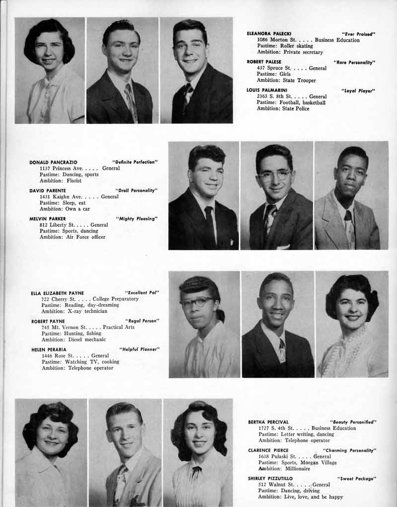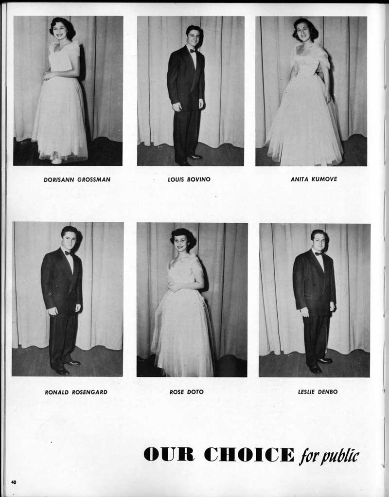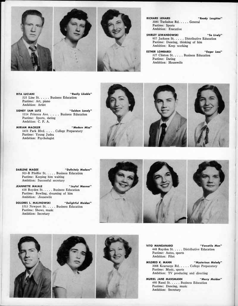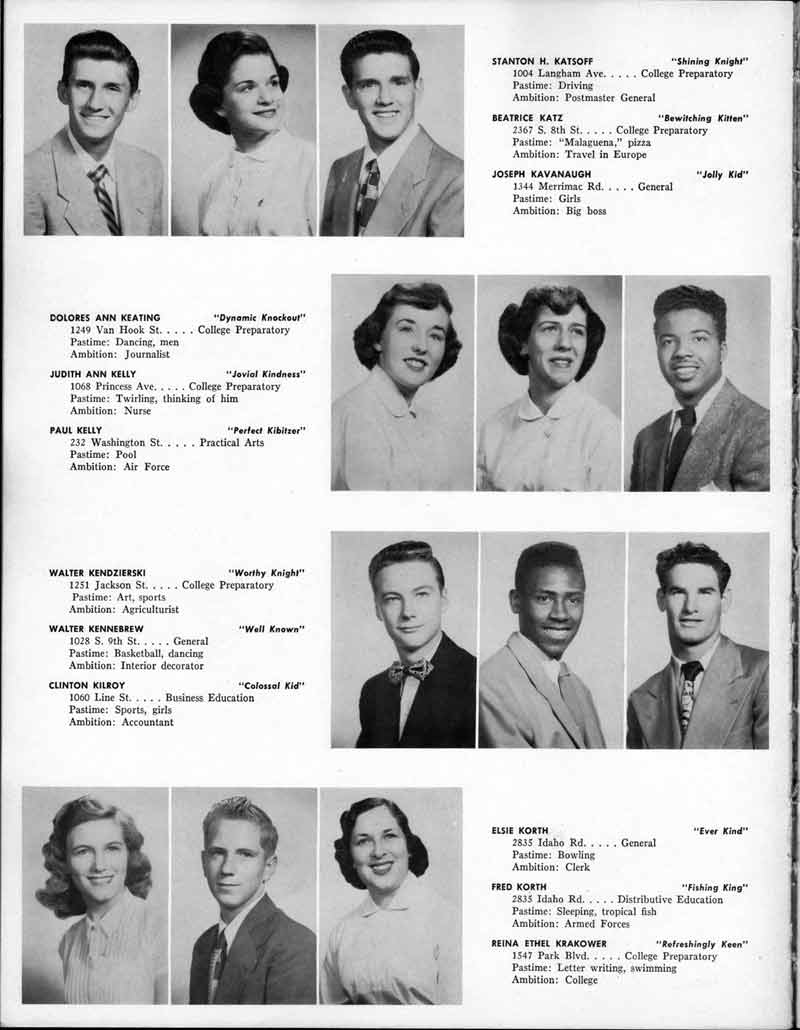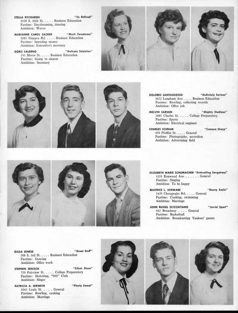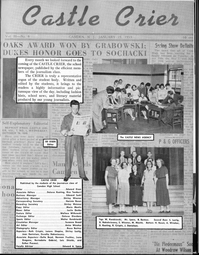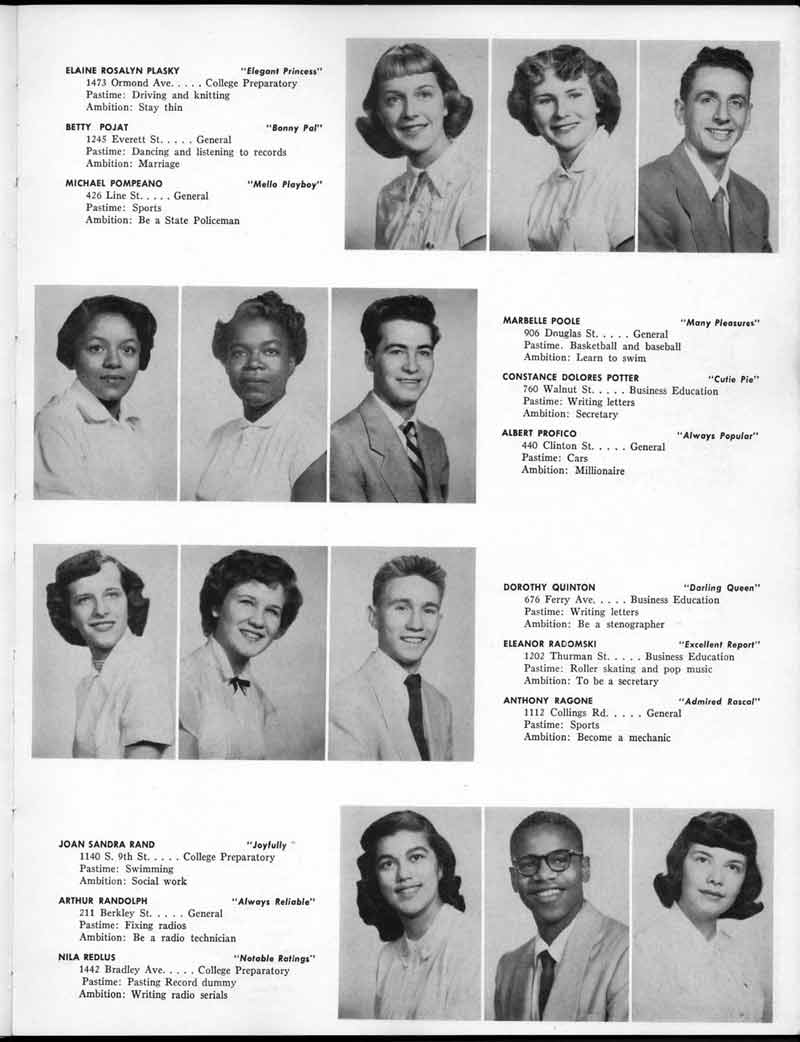 SENIOR ACTIVITIES NANCY ADAMS-Dance Club, Chess Club, Badminton, Purple and Gold Business Staff. ARLENE ALBERT-Crocheting Club, Girls' A.A., Dramatic Club, Charm and Fashion Club. BERNARD ALEXANDER-Psychology Club. ROSS AMES-Fix-It-Yourself Club, Hi-Y Club. CATHERINE AMOS-Twirling Club, Basketball, Archery, Hockey, Canasta Club, Typing Club, Home Room Leader. DOROTHY ANDERSON-Game Club, Art Club, Art Slides, Home Room Secretary, Typing Club, Nurse's Office,. Guidance Office. ANITA ANICICH-Dance Club, Purple and Gold Business Staff, Record Subscription Staff, Senior Prom Committee, Dr. Koppenhaver's Office. EDMUND ANYZEK-Contract Bridge Club, Red Cross Club, Red Cross Arts. CLARA ARNOLD-Game Club. Pantomime Club, Glee Club, Senior Steering Committee, Guidance Council, Nurse's Office, Big Sister, Refreshment Committee, Hostess for. Children's Home Party and National Honor Society Tea. CHARLOTTE AVIS-Typing Club, Red Cross Activity Club. ROBERTA BABIN-Crocheting Club, Basketball, Purple and Gold Business Staff, Manager of Purple and Gold Subscriptions, Senior Steering Committee. DELORES BAISDEN-Crocheting Club, Red Cross Club, Dra-matic Club, Intramural Sports. JOHN BALLINGHOFF-Red Cross Art Club. MILDRED BALSAMA-Lieutenant Varsity Majorettes, Maj.or-ette Club, Twirling Club, Record Distributing Staff, Senior Guidance Council. NINA BANKS--Pantomime Club, Knitting Club, Basketball, Advanced Typing Club. JOHN BASKERVILLE-President Hi-Y Club, Baseball, Foot-ball Club, Usher, Football, Traffic. LUTHER BATES-Hi-Y Club, Boys' Sports, Baseball. DELORES BAUM-Dance Club, Home Room Secretary, Purple and Gold Business Staff, Student Government, Home Room Leader, Library Council, Decorating Committee, Nurse's Office, Social Committee. ALFONSO BETHEA-Sports Club, Typing Club. JOAN BICKER-Chess and Checkers Club, Library Council, Charm and Fashion Club, Junior Decorating Committee, Nurse's Office, Dr. Koppenhaver's Office, Guidance Office, Big Sister, Senior Steering Committee. DIANE BIEDERMAN-Dance Club, Air Raid Aid, Red Cross Club .. JOAN BLACKNIAK-Art, Club, Classical Club, Halloween Painting, Red Cross Art Club, Junior Decorating Committee, Tennis, Badminton, Swimming Club, Camden Figh Calendar Art Staff, Associate Art Editor, Purple and Gold, Charm Club. SHELDON BODNER-Stamp Club, Pinochle Club, Psychology Club. BARBARA BONE-Home Room Leader, Record Salesman, Golf Club, Swimming, Assistant Manager Record Sales and Circula-tion, Student Government Office, Big Sister, Secretary-treasurer Chess and Checkers Club. CATHERINE BOYLAN-Twirling Club, Home Room Vice-President, Air Raid Aid, Typing Club, Nurse's Office, Record Sales and. Circulation, Swimming, G.A.A. Representative, Rep-resentative to Citizenship Institute. JOSEPHINE BORREGGINE-Fix-It-Yourself Club, Golf Club, Library Council, Traffic Club Office, Record Literary, Nurse's Office, Senior Class Show. BRUCE BORTNER---'-Hunting and Fishing Club, Psychology Club, Speech Assembly Program, Junior Class Play, Castle Crier Photography Editor, Record Photography Editor, Semi-Finalist Public Speaking Contest, Golf team. LOUIS BOVINO-Sports Club, Junior Class Play, Baseball, Pantomime Club, Home Room Leader, Finalist Public Speaking Contest, Co-Captain of Cheerleaders, Student Government, Chairman Brooks-Irving Trophy Committee, Purple and Gold Literary Staff, Associate Editor, Senior Class Treasurer, Big Brother; Decorating Committee .. DELLA BOYD-Public Speaking Club, Crocheting Club, Girls' A.A., Record Business and Advertising Staff. DONALD BRIGHT-Basketball, Baseball, Assembly Program Committee, Junior Decorating Committee, Junior Prom Committee, Basketball Club, Junior Class Show, "Good News," Senior Class Play, Senior Class Steering Committee, Chi"istmas Decorat-ing Committee, Big Brother. EARL BROWN-J.V. Football Team, Football Club, Canasta Club. ESTER BROWN-Future Teachers Program Chairman, Begin-ners Typing, Record Sales and Circulation, Library Council. HERBERT BROWN-Hi-Y Club, Boy's Sports Club, Track Team. SYLVIA BROWN-Gifts and Accessories, Classical Club, Arch-ery, Hockey, Basketball, Baseball, Psychology Club, Girls' A.A. Secretary, Library Council, Purple and Gold Literary Staff, Traffic, Senior Show, Big Sister. Quill and Scroll. LORRAINE BUCZYNSKI-Purple and Gold Social Activities, Checkers Club, Bowling, Purple and Gold Business Staff Secretary, Dr. Koppenhaver's Office. SAMUEL BUELL-Football Club. Football Team, Baseball, Ushers, Welfare Chest Committee, President Boys' A.A., Home Room Leader, Baseball Club. ANTHONY BUTCH-Football Manager, Fix-It-Yourself Club, Hunting and Fishing Club. DOROTHY COLLOPY-Red Cross Art, Record Art Staff, Home Room Secretary, Scenery Painter, Quill and Scroll, Purple and Gold Business Staff. HARRY CANDERA-Fix-It-Yourself Club, Art Slides, Red Cross Art. ROBERT CANTERMAN-Red Cross Art, Red Cross Art Club. RUTH CARR-Home Room Secretary, Dramatics Club, Home Room Leader, Red Cross Club. CYNTHIA CANNON-Twirlers Club, Knitting Club, Volley Ball, Charm and Fashion Club, Big Sister. JOAN CANNON-Gifts and Accessories Clubs, Basketball, Christmas Decorations, Purple and Gold Business Staff, Home Room Secretary. EVELYN CAPLAN-Red Cross Aids, Coral Reading, Spring Show, Red Cross Club, Library Council President, Music Office, "Good News," Red Cross Program Chairman, Welfare Chest Committee, National Honor Society. FRANK CARDUCCI-Classical Club, Hi-Y Club, Pantomime Club, Pinochle Club. LEWIS CARP-Fix-lit- Yourself Club, Christmas Play, Junior J,J.'s, Usher, Traffic, Student Government, Welfare Chest Committee, Golf Team. HARRY CARSON-Stamp Club, Fix-It-Yourself Club. GLADYS CHAPMAN-Game Club, Charm and Fashion Club, Color Guard Manager, Typing Club, Varsity Color Guard Club, Guidance Office. THOMAS CICCHITTI-Red Cross Art, French Club, Junior Play, Hi-Larities of '51, Junior Prom Committee, Band, Christ-mas Decorating, Senior Play Committee, Ticket Committee, Social Committee, Student Government, Stage Manager for