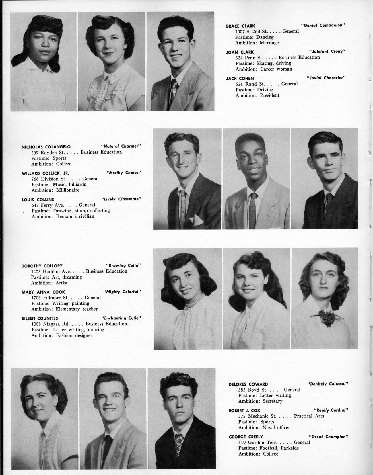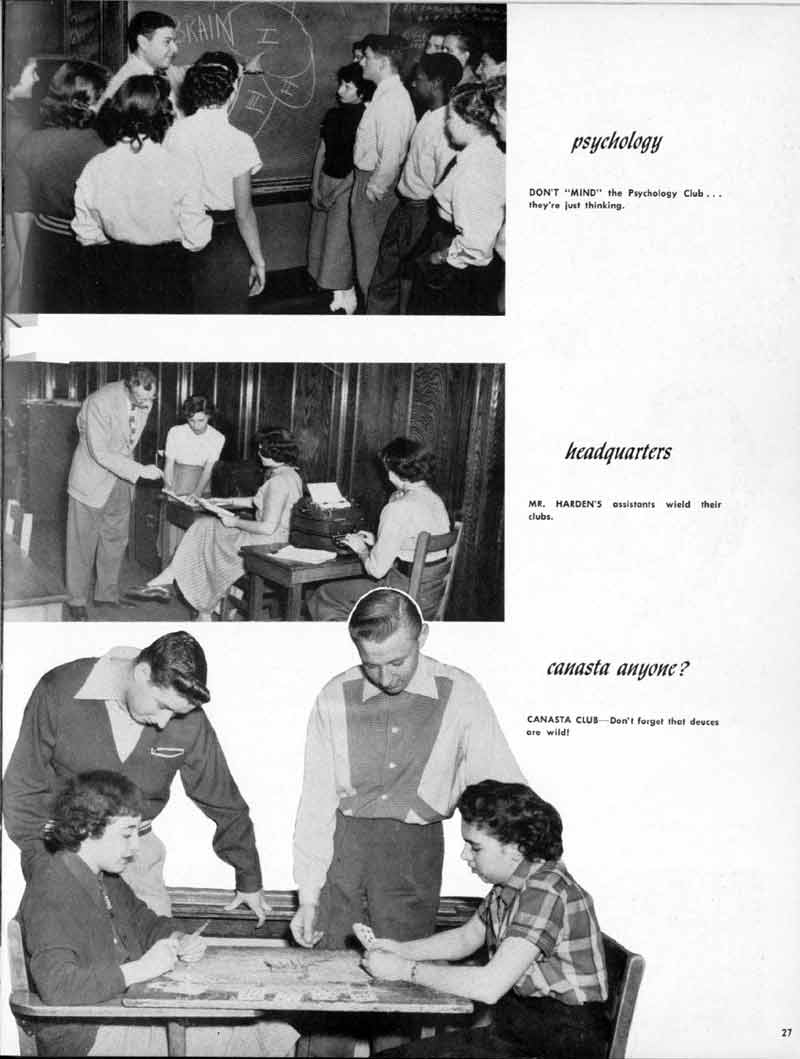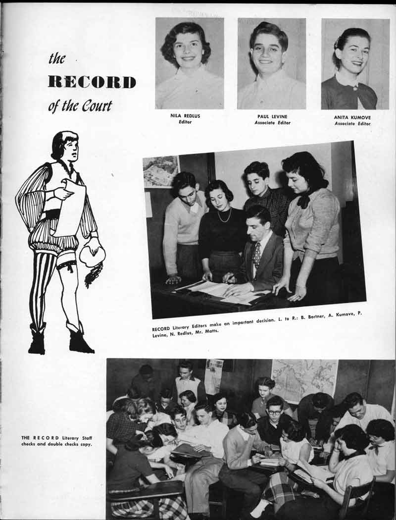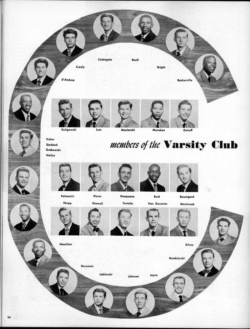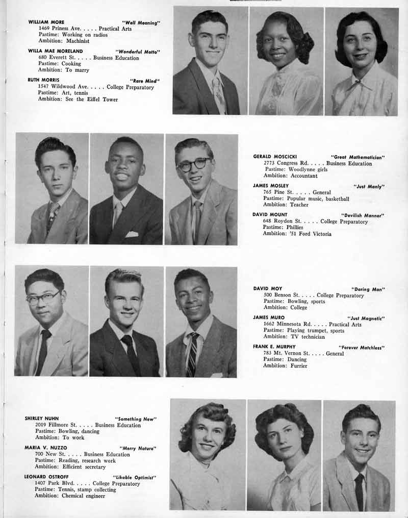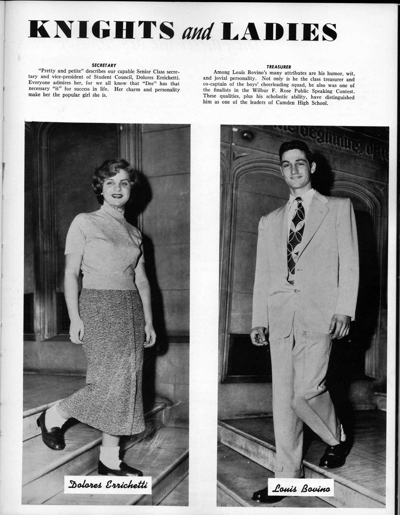 SENIOR ACTIVITIES NANCY ADAMS-Dance Club, Chess Club, Badminton, Purple and Gold Business Staff. ARLENE ALBERT-Crocheting Club, Girls' A.A., Dramatic Club, Charm and Fashion Club. BERNARD ALEXANDER-Psychology Club. ROSS AMES-Fix-It-Yourself Club, Hi-Y Club. CATHERINE AMOS-Twirling Club, Basketball, Archery, Hockey, Canasta Club, Typing Club, Home Room Leader. DOROTHY ANDERSON-Game Club, Art Club, Art Slides, Home Room Secretary, Typing Club, Nurse's Office,. Guidance Office. ANITA ANICICH-Dance Club, Purple and Gold Business Staff, Record Subscription Staff, Senior Prom Committee, Dr. Koppenhaver's Office. EDMUND ANYZEK-Contract Bridge Club, Red Cross Club, Red Cross Arts. CLARA ARNOLD-Game Club. Pantomime Club, Glee Club, Senior Steering Committee, Guidance Council, Nurse's Office, Big Sister, Refreshment Committee, Hostess for. Children's Home Party and National Honor Society Tea. CHARLOTTE AVIS-Typing Club, Red Cross Activity Club. ROBERTA BABIN-Crocheting Club, Basketball, Purple and Gold Business Staff, Manager of Purple and Gold Subscriptions, Senior Steering Committee. DELORES BAISDEN-Crocheting Club, Red Cross Club, Dra-matic Club, Intramural Sports. JOHN BALLINGHOFF-Red Cross Art Club. MILDRED BALSAMA-Lieutenant Varsity Majorettes, Maj.or-ette Club, Twirling Club, Record Distributing Staff, Senior Guidance Council. NINA BANKS--Pantomime Club, Knitting Club, Basketball, Advanced Typing Club. JOHN BASKERVILLE-President Hi-Y Club, Baseball, Foot-ball Club, Usher, Football, Traffic. LUTHER BATES-Hi-Y Club, Boys' Sports, Baseball. DELORES BAUM-Dance Club, Home Room Secretary, Purple and Gold Business Staff, Student Government, Home Room Leader, Library Council, Decorating Committee, Nurse's Office, Social Committee. ALFONSO BETHEA-Sports Club, Typing Club. JOAN BICKER-Chess and Checkers Club, Library Council, Charm and Fashion Club, Junior Decorating Committee, Nurse's Office, Dr. Koppenhaver's Office, Guidance Office, Big Sister, Senior Steering Committee. DIANE BIEDERMAN-Dance Club, Air Raid Aid, Red Cross Club .. JOAN BLACKNIAK-Art, Club, Classical Club, Halloween Painting, Red Cross Art Club, Junior Decorating Committee, Tennis, Badminton, Swimming Club, Camden Figh Calendar Art Staff, Associate Art Editor, Purple and Gold, Charm Club. SHELDON BODNER-Stamp Club, Pinochle Club, Psychology Club. BARBARA BONE-Home Room Leader, Record Salesman, Golf Club, Swimming, Assistant Manager Record Sales and Circula-tion, Student Government Office, Big Sister, Secretary-treasurer Chess and Checkers Club. CATHERINE BOYLAN-Twirling Club, Home Room Vice-President, Air Raid Aid, Typing Club, Nurse's Office, Record Sales and. Circulation, Swimming, G.A.A. Representative, Rep-resentative to Citizenship Institute. JOSEPHINE BORREGGINE-Fix-It-Yourself Club, Golf Club, Library Council, Traffic Club Office, Record Literary, Nurse's Office, Senior Class Show. BRUCE BORTNER---'-Hunting and Fishing Club, Psychology Club, Speech Assembly Program, Junior Class Play, Castle Crier Photography Editor, Record Photography Editor, Semi-Finalist Public Speaking Contest, Golf team. LOUIS BOVINO-Sports Club, Junior Class Play, Baseball, Pantomime Club, Home Room Leader, Finalist Public Speaking Contest, Co-Captain of Cheerleaders, Student Government, Chairman Brooks-Irving Trophy Committee, Purple and Gold Literary Staff, Associate Editor, Senior Class Treasurer, Big Brother; Decorating Committee .. DELLA BOYD-Public Speaking Club, Crocheting Club, Girls' A.A., Record Business and Advertising Staff. DONALD BRIGHT-Basketball, Baseball, Assembly Program Committee, Junior Decorating Committee, Junior Prom Committee, Basketball Club, Junior Class Show, "Good News," Senior Class Play, Senior Class Steering Committee, Chi"istmas Decorat-ing Committee, Big Brother. EARL BROWN-J.V. Football Team, Football Club, Canasta Club. ESTER BROWN-Future Teachers Program Chairman, Begin-ners Typing, Record Sales and Circulation, Library Council. HERBERT BROWN-Hi-Y Club, Boy's Sports Club, Track Team. SYLVIA BROWN-Gifts and Accessories, Classical Club, Arch-ery, Hockey, Basketball, Baseball, Psychology Club, Girls' A.A. Secretary, Library Council, Purple and Gold Literary Staff, Traffic, Senior Show, Big Sister. Quill and Scroll. LORRAINE BUCZYNSKI-Purple and Gold Social Activities, Checkers Club, Bowling, Purple and Gold Business Staff Secretary, Dr. Koppenhaver's Office. SAMUEL BUELL-Football Club. Football Team, Baseball, Ushers, Welfare Chest Committee, President Boys' A.A., Home Room Leader, Baseball Club. ANTHONY BUTCH-Football Manager, Fix-It-Yourself Club, Hunting and Fishing Club. DOROTHY COLLOPY-Red Cross Art, Record Art Staff, Home Room Secretary, Scenery Painter, Quill and Scroll, Purple and Gold Business Staff. HARRY CANDERA-Fix-It-Yourself Club, Art Slides, Red Cross Art. ROBERT CANTERMAN-Red Cross Art, Red Cross Art Club. RUTH CARR-Home Room Secretary, Dramatics Club, Home Room Leader, Red Cross Club. CYNTHIA CANNON-Twirlers Club, Knitting Club, Volley Ball, Charm and Fashion Club, Big Sister. JOAN CANNON-Gifts and Accessories Clubs, Basketball, Christmas Decorations, Purple and Gold Business Staff, Home Room Secretary. EVELYN CAPLAN-Red Cross Aids, Coral Reading, Spring Show, Red Cross Club, Library Council President, Music Office, "Good News," Red Cross Program Chairman, Welfare Chest Committee, National Honor Society. FRANK CARDUCCI-Classical Club, Hi-Y Club, Pantomime Club, Pinochle Club. LEWIS CARP-Fix-lit- Yourself Club, Christmas Play, Junior J,J.'s, Usher, Traffic, Student Government, Welfare Chest Committee, Golf Team. HARRY CARSON-Stamp Club, Fix-It-Yourself Club. GLADYS CHAPMAN-Game Club, Charm and Fashion Club, Color Guard Manager, Typing Club, Varsity Color Guard Club, Guidance Office. THOMAS CICCHITTI-Red Cross Art, French Club, Junior Play, Hi-Larities of '51, Junior Prom Committee, Band, Christ-mas Decorating, Senior Play Committee, Ticket Committee, Social Committee, Student Government, Stage Manager for