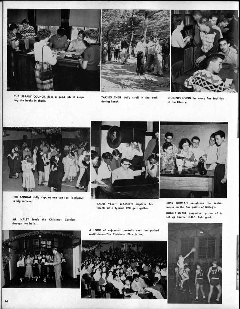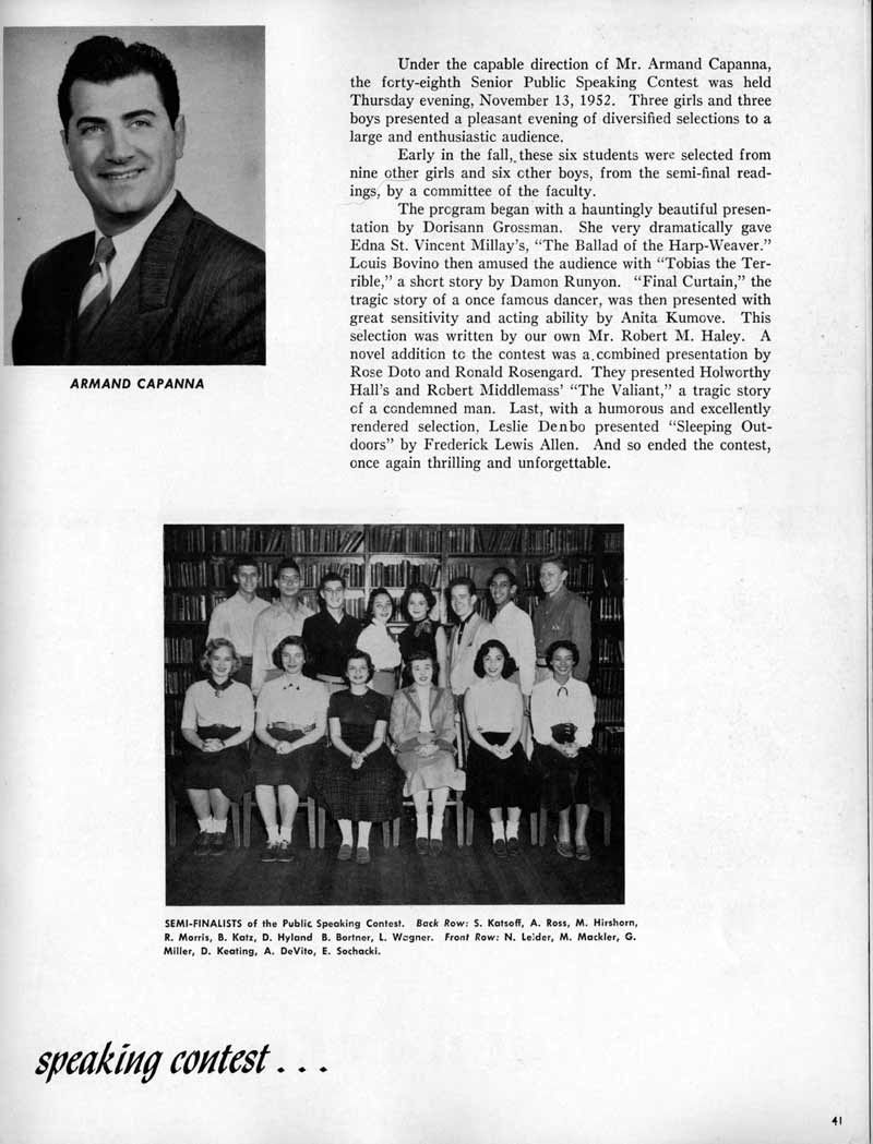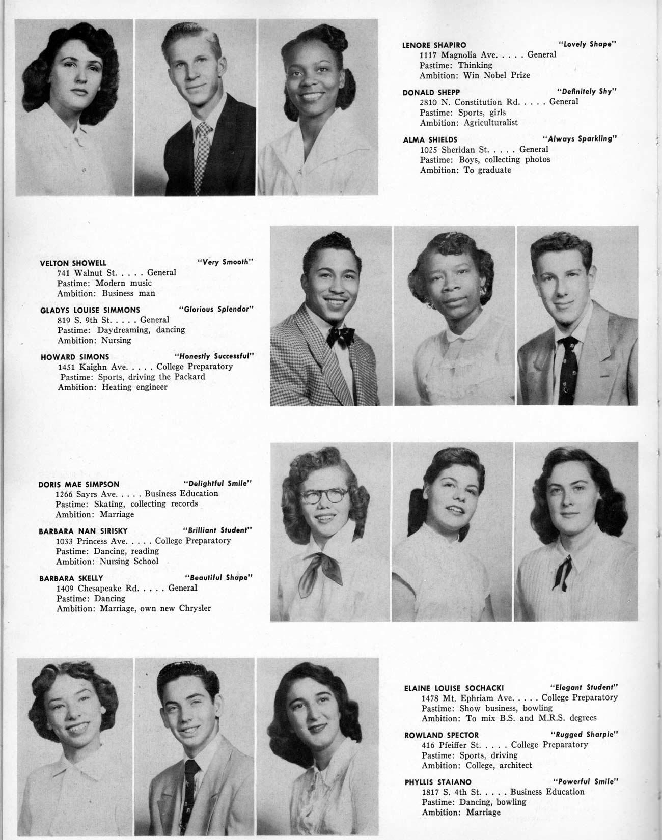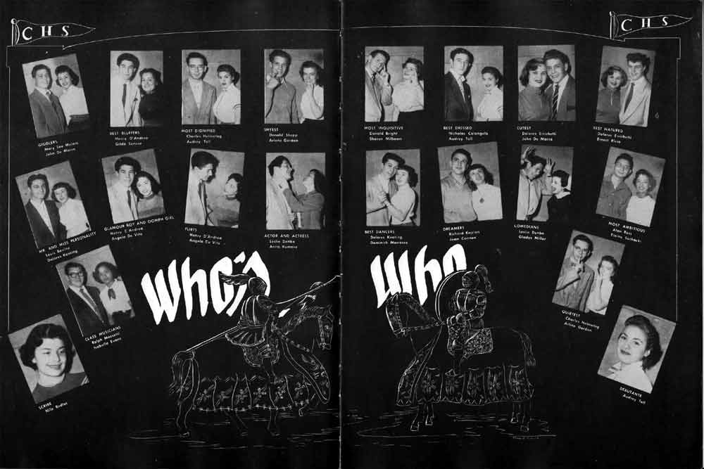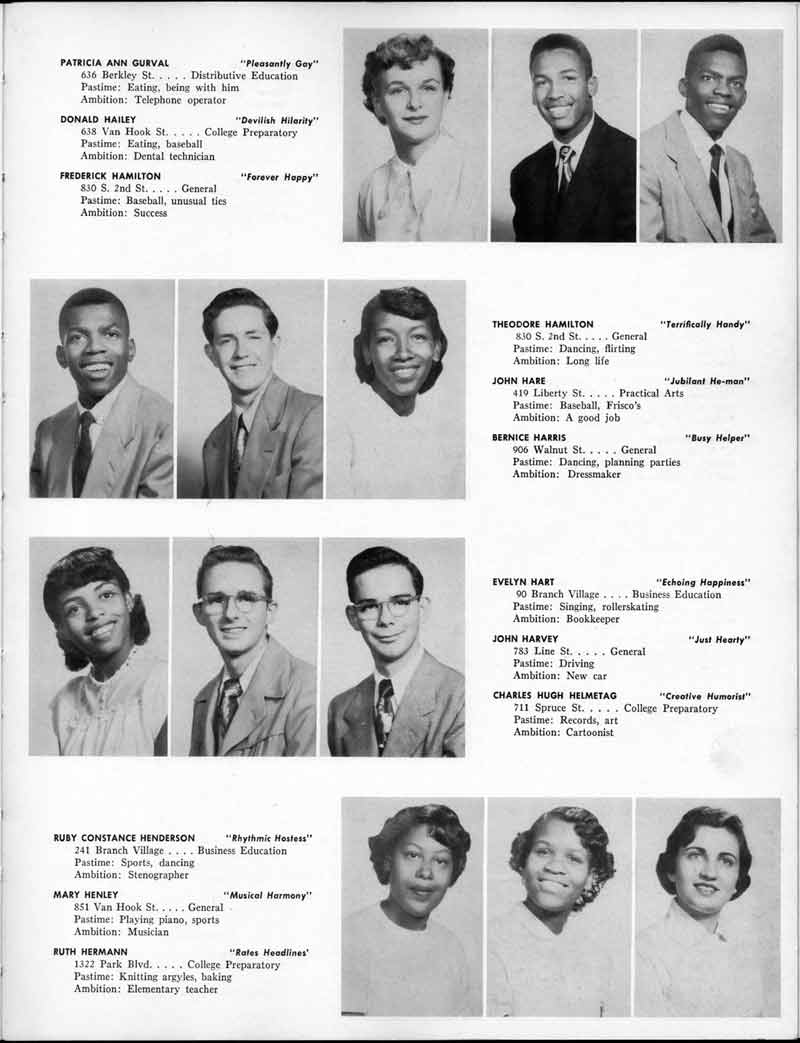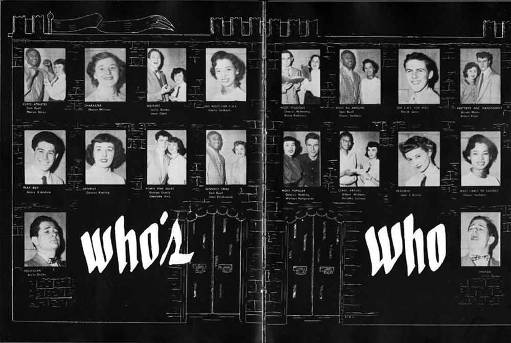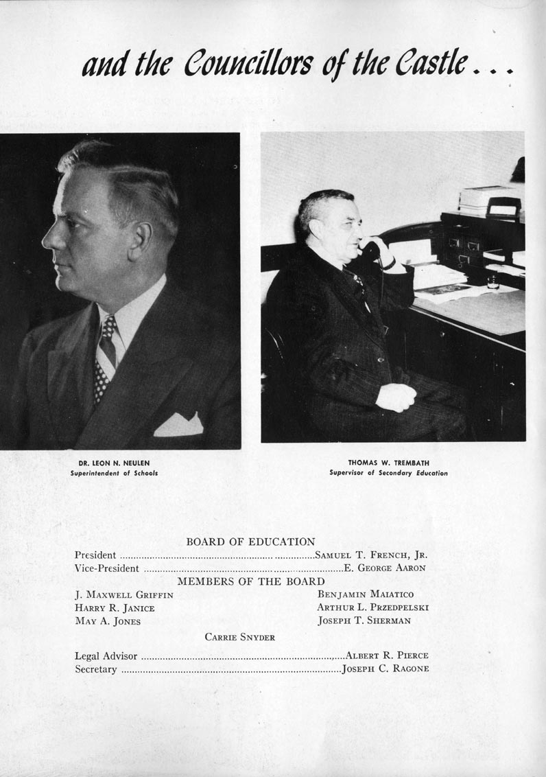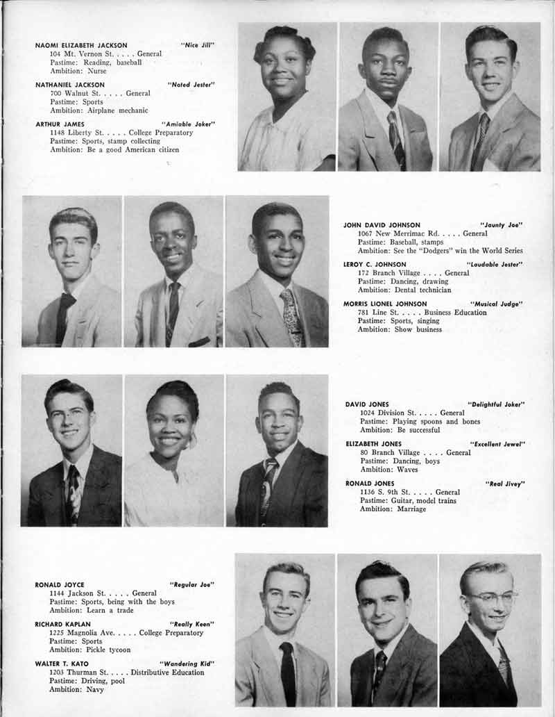 SENIOR ACTIVITIES NANCY ADAMS-Dance Club, Chess Club, Badminton, Purple and Gold Business Staff. ARLENE ALBERT-Crocheting Club, Girls' A.A., Dramatic Club, Charm and Fashion Club. BERNARD ALEXANDER-Psychology Club. ROSS AMES-Fix-It-Yourself Club, Hi-Y Club. CATHERINE AMOS-Twirling Club, Basketball, Archery, Hockey, Canasta Club, Typing Club, Home Room Leader. DOROTHY ANDERSON-Game Club, Art Club, Art Slides, Home Room Secretary, Typing Club, Nurse's Office,. Guidance Office. ANITA ANICICH-Dance Club, Purple and Gold Business Staff, Record Subscription Staff, Senior Prom Committee, Dr. Koppenhaver's Office. EDMUND ANYZEK-Contract Bridge Club, Red Cross Club, Red Cross Arts. CLARA ARNOLD-Game Club. Pantomime Club, Glee Club, Senior Steering Committee, Guidance Council, Nurse's Office, Big Sister, Refreshment Committee, Hostess for. Children's Home Party and National Honor Society Tea. CHARLOTTE AVIS-Typing Club, Red Cross Activity Club. ROBERTA BABIN-Crocheting Club, Basketball, Purple and Gold Business Staff, Manager of Purple and Gold Subscriptions, Senior Steering Committee. DELORES BAISDEN-Crocheting Club, Red Cross Club, Dra-matic Club, Intramural Sports. JOHN BALLINGHOFF-Red Cross Art Club. MILDRED BALSAMA-Lieutenant Varsity Majorettes, Maj.or-ette Club, Twirling Club, Record Distributing Staff, Senior Guidance Council. NINA BANKS--Pantomime Club, Knitting Club, Basketball, Advanced Typing Club. JOHN BASKERVILLE-President Hi-Y Club, Baseball, Foot-ball Club, Usher, Football, Traffic. LUTHER BATES-Hi-Y Club, Boys' Sports, Baseball. DELORES BAUM-Dance Club, Home Room Secretary, Purple and Gold Business Staff, Student Government, Home Room Leader, Library Council, Decorating Committee, Nurse's Office, Social Committee. ALFONSO BETHEA-Sports Club, Typing Club. JOAN BICKER-Chess and Checkers Club, Library Council, Charm and Fashion Club, Junior Decorating Committee, Nurse's Office, Dr. Koppenhaver's Office, Guidance Office, Big Sister, Senior Steering Committee. DIANE BIEDERMAN-Dance Club, Air Raid Aid, Red Cross Club .. JOAN BLACKNIAK-Art, Club, Classical Club, Halloween Painting, Red Cross Art Club, Junior Decorating Committee, Tennis, Badminton, Swimming Club, Camden Figh Calendar Art Staff, Associate Art Editor, Purple and Gold, Charm Club. SHELDON BODNER-Stamp Club, Pinochle Club, Psychology Club. BARBARA BONE-Home Room Leader, Record Salesman, Golf Club, Swimming, Assistant Manager Record Sales and Circula-tion, Student Government Office, Big Sister, Secretary-treasurer Chess and Checkers Club. CATHERINE BOYLAN-Twirling Club, Home Room Vice-President, Air Raid Aid, Typing Club, Nurse's Office, Record Sales and. Circulation, Swimming, G.A.A. Representative, Rep-resentative to Citizenship Institute. JOSEPHINE BORREGGINE-Fix-It-Yourself Club, Golf Club, Library Council, Traffic Club Office, Record Literary, Nurse's Office, Senior Class Show. BRUCE BORTNER---'-Hunting and Fishing Club, Psychology Club, Speech Assembly Program, Junior Class Play, Castle Crier Photography Editor, Record Photography Editor, Semi-Finalist Public Speaking Contest, Golf team. LOUIS BOVINO-Sports Club, Junior Class Play, Baseball, Pantomime Club, Home Room Leader, Finalist Public Speaking Contest, Co-Captain of Cheerleaders, Student Government, Chairman Brooks-Irving Trophy Committee, Purple and Gold Literary Staff, Associate Editor, Senior Class Treasurer, Big Brother; Decorating Committee .. DELLA BOYD-Public Speaking Club, Crocheting Club, Girls' A.A., Record Business and Advertising Staff. DONALD BRIGHT-Basketball, Baseball, Assembly Program Committee, Junior Decorating Committee, Junior Prom Committee, Basketball Club, Junior Class Show, "Good News," Senior Class Play, Senior Class Steering Committee, Chi"istmas Decorat-ing Committee, Big Brother. EARL BROWN-J.V. Football Team, Football Club, Canasta Club. ESTER BROWN-Future Teachers Program Chairman, Begin-ners Typing, Record Sales and Circulation, Library Council. HERBERT BROWN-Hi-Y Club, Boy's Sports Club, Track Team. SYLVIA BROWN-Gifts and Accessories, Classical Club, Arch-ery, Hockey, Basketball, Baseball, Psychology Club, Girls' A.A. Secretary, Library Council, Purple and Gold Literary Staff, Traffic, Senior Show, Big Sister. Quill and Scroll. LORRAINE BUCZYNSKI-Purple and Gold Social Activities, Checkers Club, Bowling, Purple and Gold Business Staff Secretary, Dr. Koppenhaver's Office. SAMUEL BUELL-Football Club. Football Team, Baseball, Ushers, Welfare Chest Committee, President Boys' A.A., Home Room Leader, Baseball Club. ANTHONY BUTCH-Football Manager, Fix-It-Yourself Club, Hunting and Fishing Club. DOROTHY COLLOPY-Red Cross Art, Record Art Staff, Home Room Secretary, Scenery Painter, Quill and Scroll, Purple and Gold Business Staff. HARRY CANDERA-Fix-It-Yourself Club, Art Slides, Red Cross Art. ROBERT CANTERMAN-Red Cross Art, Red Cross Art Club. RUTH CARR-Home Room Secretary, Dramatics Club, Home Room Leader, Red Cross Club. CYNTHIA CANNON-Twirlers Club, Knitting Club, Volley Ball, Charm and Fashion Club, Big Sister. JOAN CANNON-Gifts and Accessories Clubs, Basketball, Christmas Decorations, Purple and Gold Business Staff, Home Room Secretary. EVELYN CAPLAN-Red Cross Aids, Coral Reading, Spring Show, Red Cross Club, Library Council President, Music Office, "Good News," Red Cross Program Chairman, Welfare Chest Committee, National Honor Society. FRANK CARDUCCI-Classical Club, Hi-Y Club, Pantomime Club, Pinochle Club. LEWIS CARP-Fix-lit- Yourself Club, Christmas Play, Junior J,J.'s, Usher, Traffic, Student Government, Welfare Chest Committee, Golf Team. HARRY CARSON-Stamp Club, Fix-It-Yourself Club. GLADYS CHAPMAN-Game Club, Charm and Fashion Club, Color Guard Manager, Typing Club, Varsity Color Guard Club, Guidance Office. THOMAS CICCHITTI-Red Cross Art, French Club, Junior Play, Hi-Larities of '51, Junior Prom Committee, Band, Christ-mas Decorating, Senior Play Committee, Ticket Committee, Social Committee, Student Government, Stage Manager for