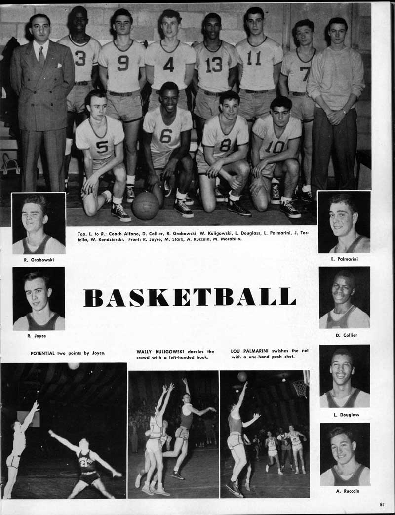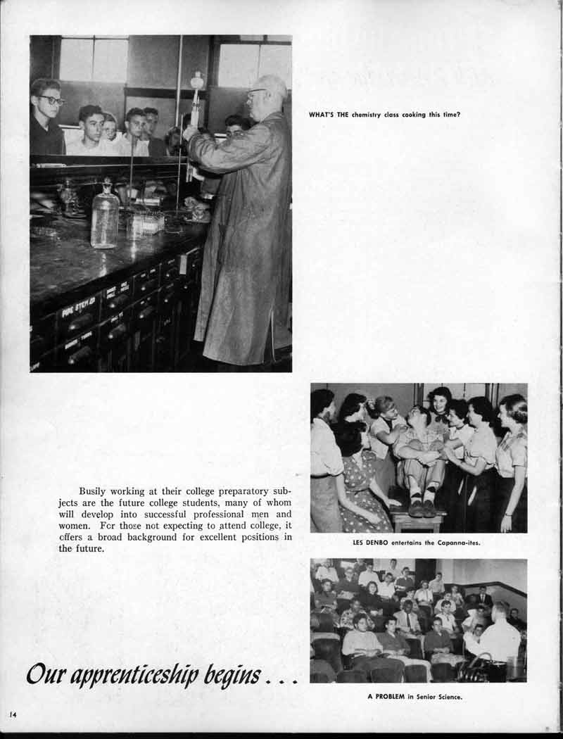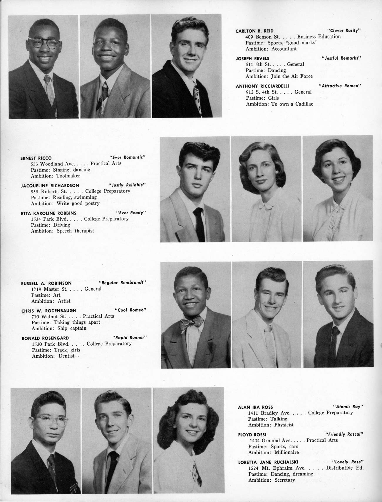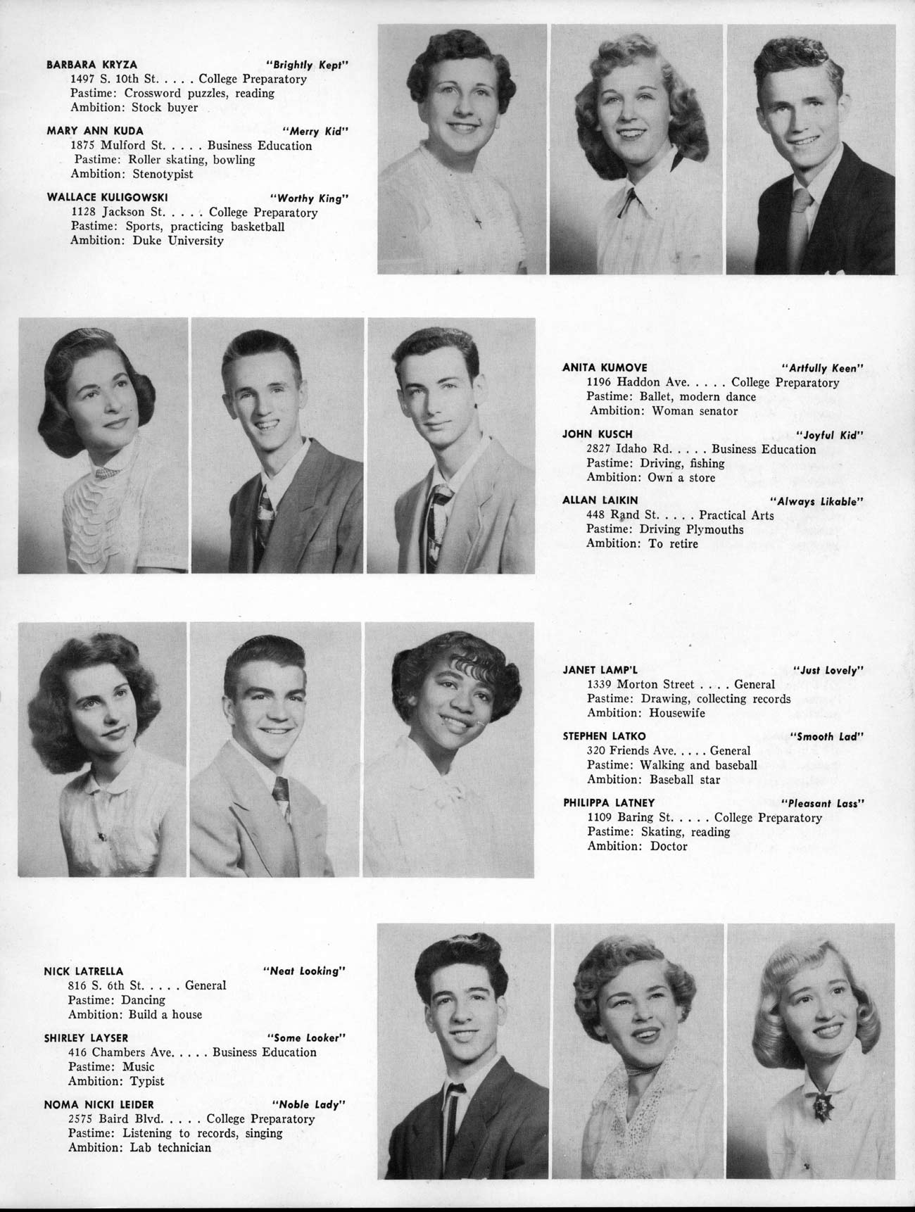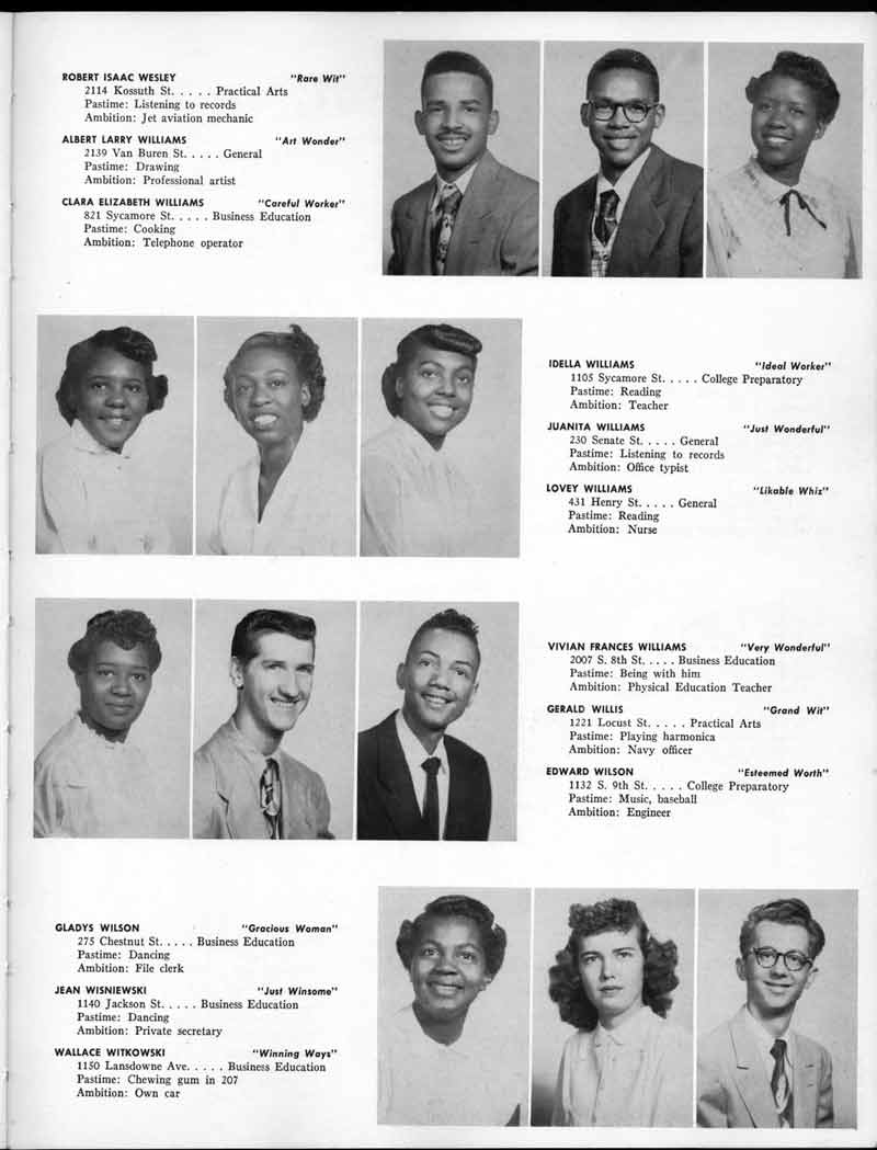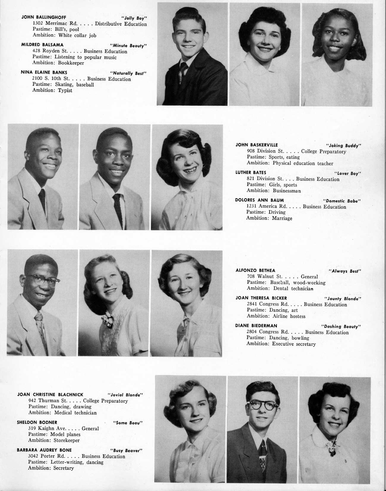 SENIOR ACTIVITIES NANCY ADAMS-Dance Club, Chess Club, Badminton, Purple and Gold Business Staff. ARLENE ALBERT-Crocheting Club, Girls' A.A., Dramatic Club, Charm and Fashion Club. BERNARD ALEXANDER-Psychology Club. ROSS AMES-Fix-It-Yourself Club, Hi-Y Club. CATHERINE AMOS-Twirling Club, Basketball, Archery, Hockey, Canasta Club, Typing Club, Home Room Leader. DOROTHY ANDERSON-Game Club, Art Club, Art Slides, Home Room Secretary, Typing Club, Nurse's Office,. Guidance Office. ANITA ANICICH-Dance Club, Purple and Gold Business Staff, Record Subscription Staff, Senior Prom Committee, Dr. Koppenhaver's Office. EDMUND ANYZEK-Contract Bridge Club, Red Cross Club, Red Cross Arts. CLARA ARNOLD-Game Club. Pantomime Club, Glee Club, Senior Steering Committee, Guidance Council, Nurse's Office, Big Sister, Refreshment Committee, Hostess for. Children's Home Party and National Honor Society Tea. CHARLOTTE AVIS-Typing Club, Red Cross Activity Club. ROBERTA BABIN-Crocheting Club, Basketball, Purple and Gold Business Staff, Manager of Purple and Gold Subscriptions, Senior Steering Committee. DELORES BAISDEN-Crocheting Club, Red Cross Club, Dra-matic Club, Intramural Sports. JOHN BALLINGHOFF-Red Cross Art Club. MILDRED BALSAMA-Lieutenant Varsity Majorettes, Maj.or-ette Club, Twirling Club, Record Distributing Staff, Senior Guidance Council. NINA BANKS--Pantomime Club, Knitting Club, Basketball, Advanced Typing Club. JOHN BASKERVILLE-President Hi-Y Club, Baseball, Foot-ball Club, Usher, Football, Traffic. LUTHER BATES-Hi-Y Club, Boys' Sports, Baseball. DELORES BAUM-Dance Club, Home Room Secretary, Purple and Gold Business Staff, Student Government, Home Room Leader, Library Council, Decorating Committee, Nurse's Office, Social Committee. ALFONSO BETHEA-Sports Club, Typing Club. JOAN BICKER-Chess and Checkers Club, Library Council, Charm and Fashion Club, Junior Decorating Committee, Nurse's Office, Dr. Koppenhaver's Office, Guidance Office, Big Sister, Senior Steering Committee. DIANE BIEDERMAN-Dance Club, Air Raid Aid, Red Cross Club .. JOAN BLACKNIAK-Art, Club, Classical Club, Halloween Painting, Red Cross Art Club, Junior Decorating Committee, Tennis, Badminton, Swimming Club, Camden Figh Calendar Art Staff, Associate Art Editor, Purple and Gold, Charm Club. SHELDON BODNER-Stamp Club, Pinochle Club, Psychology Club. BARBARA BONE-Home Room Leader, Record Salesman, Golf Club, Swimming, Assistant Manager Record Sales and Circula-tion, Student Government Office, Big Sister, Secretary-treasurer Chess and Checkers Club. CATHERINE BOYLAN-Twirling Club, Home Room Vice-President, Air Raid Aid, Typing Club, Nurse's Office, Record Sales and. Circulation, Swimming, G.A.A. Representative, Rep-resentative to Citizenship Institute. JOSEPHINE BORREGGINE-Fix-It-Yourself Club, Golf Club, Library Council, Traffic Club Office, Record Literary, Nurse's Office, Senior Class Show. BRUCE BORTNER---'-Hunting and Fishing Club, Psychology Club, Speech Assembly Program, Junior Class Play, Castle Crier Photography Editor, Record Photography Editor, Semi-Finalist Public Speaking Contest, Golf team. LOUIS BOVINO-Sports Club, Junior Class Play, Baseball, Pantomime Club, Home Room Leader, Finalist Public Speaking Contest, Co-Captain of Cheerleaders, Student Government, Chairman Brooks-Irving Trophy Committee, Purple and Gold Literary Staff, Associate Editor, Senior Class Treasurer, Big Brother; Decorating Committee .. DELLA BOYD-Public Speaking Club, Crocheting Club, Girls' A.A., Record Business and Advertising Staff. DONALD BRIGHT-Basketball, Baseball, Assembly Program Committee, Junior Decorating Committee, Junior Prom Committee, Basketball Club, Junior Class Show, "Good News," Senior Class Play, Senior Class Steering Committee, Chi"istmas Decorat-ing Committee, Big Brother. EARL BROWN-J.V. Football Team, Football Club, Canasta Club. ESTER BROWN-Future Teachers Program Chairman, Begin-ners Typing, Record Sales and Circulation, Library Council. HERBERT BROWN-Hi-Y Club, Boy's Sports Club, Track Team. SYLVIA BROWN-Gifts and Accessories, Classical Club, Arch-ery, Hockey, Basketball, Baseball, Psychology Club, Girls' A.A. Secretary, Library Council, Purple and Gold Literary Staff, Traffic, Senior Show, Big Sister. Quill and Scroll. LORRAINE BUCZYNSKI-Purple and Gold Social Activities, Checkers Club, Bowling, Purple and Gold Business Staff Secretary, Dr. Koppenhaver's Office. SAMUEL BUELL-Football Club. Football Team, Baseball, Ushers, Welfare Chest Committee, President Boys' A.A., Home Room Leader, Baseball Club. ANTHONY BUTCH-Football Manager, Fix-It-Yourself Club, Hunting and Fishing Club. DOROTHY COLLOPY-Red Cross Art, Record Art Staff, Home Room Secretary, Scenery Painter, Quill and Scroll, Purple and Gold Business Staff. HARRY CANDERA-Fix-It-Yourself Club, Art Slides, Red Cross Art. ROBERT CANTERMAN-Red Cross Art, Red Cross Art Club. RUTH CARR-Home Room Secretary, Dramatics Club, Home Room Leader, Red Cross Club. CYNTHIA CANNON-Twirlers Club, Knitting Club, Volley Ball, Charm and Fashion Club, Big Sister. JOAN CANNON-Gifts and Accessories Clubs, Basketball, Christmas Decorations, Purple and Gold Business Staff, Home Room Secretary. EVELYN CAPLAN-Red Cross Aids, Coral Reading, Spring Show, Red Cross Club, Library Council President, Music Office, "Good News," Red Cross Program Chairman, Welfare Chest Committee, National Honor Society. FRANK CARDUCCI-Classical Club, Hi-Y Club, Pantomime Club, Pinochle Club. LEWIS CARP-Fix-lit- Yourself Club, Christmas Play, Junior J,J.'s, Usher, Traffic, Student Government, Welfare Chest Committee, Golf Team. HARRY CARSON-Stamp Club, Fix-It-Yourself Club. GLADYS CHAPMAN-Game Club, Charm and Fashion Club, Color Guard Manager, Typing Club, Varsity Color Guard Club, Guidance Office. THOMAS CICCHITTI-Red Cross Art, French Club, Junior Play, Hi-Larities of '51, Junior Prom Committee, Band, Christ-mas Decorating, Senior Play Committee, Ticket Committee, Social Committee, Student Government, Stage Manager for