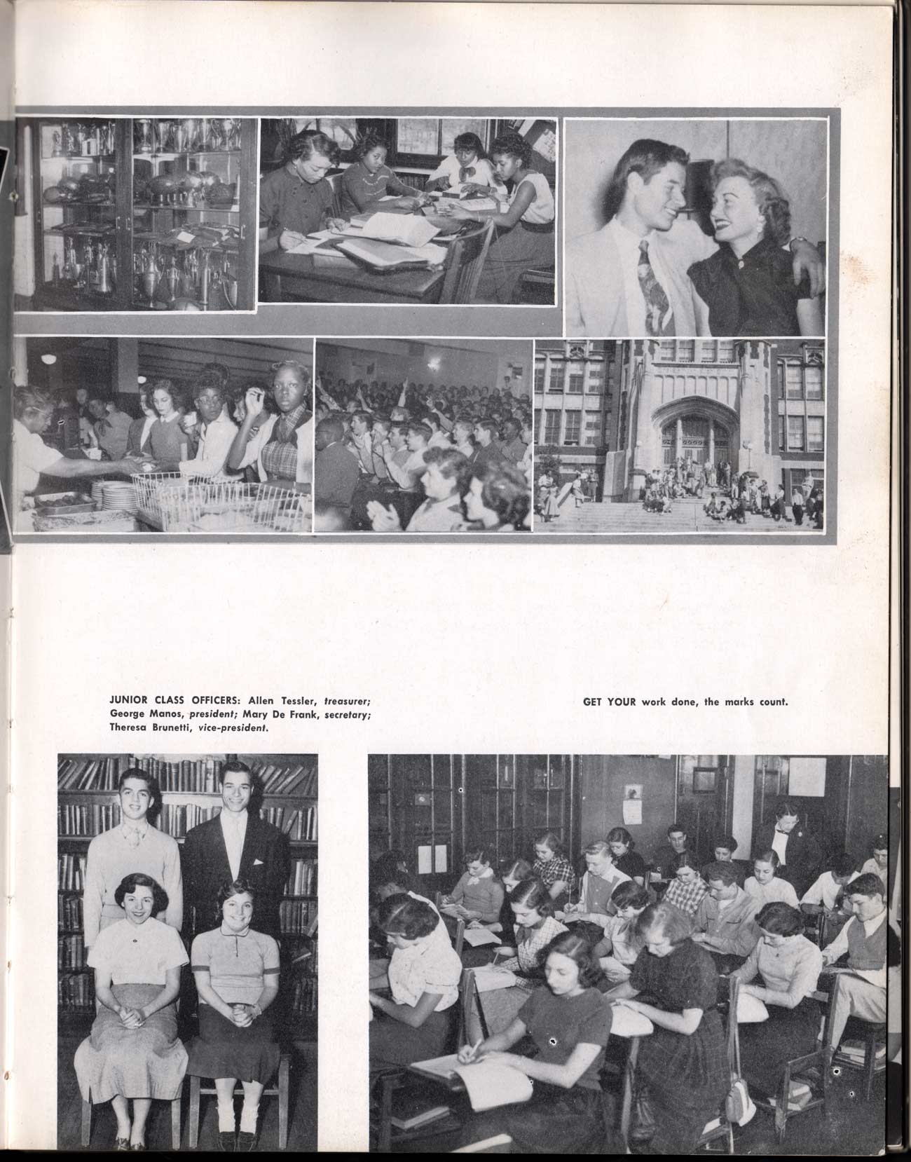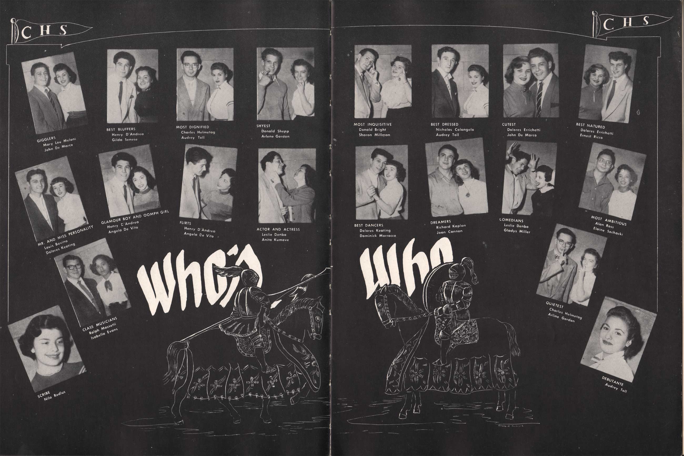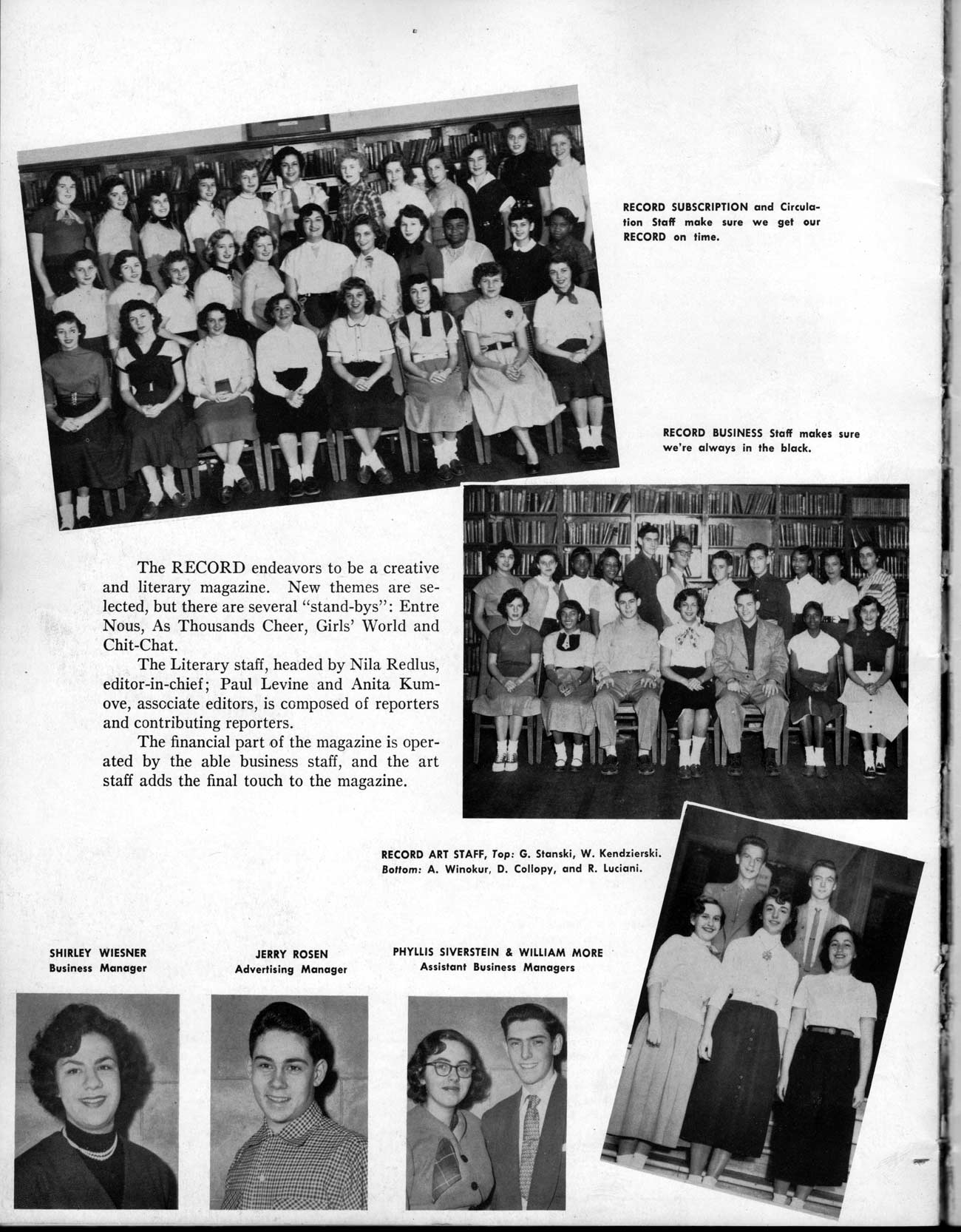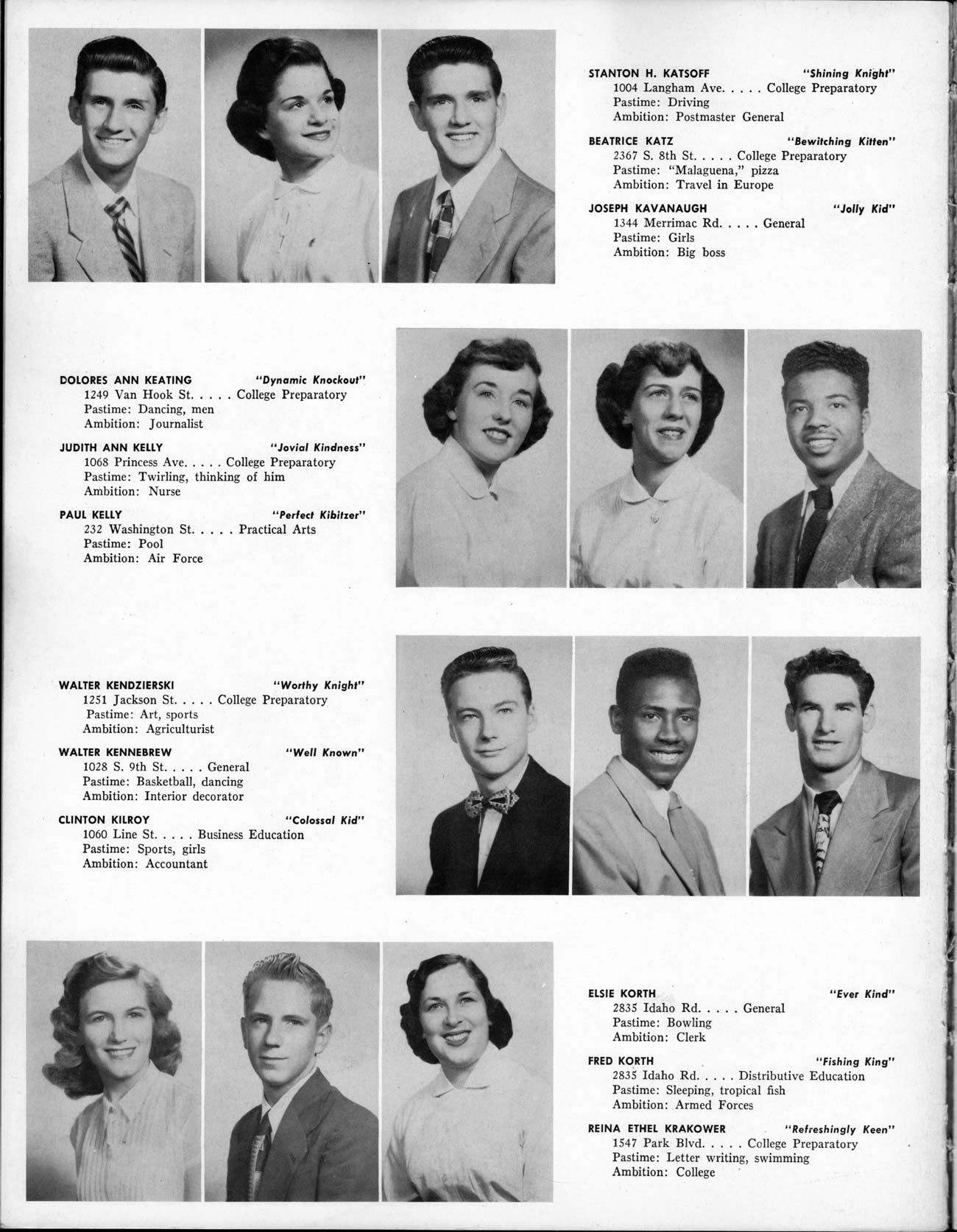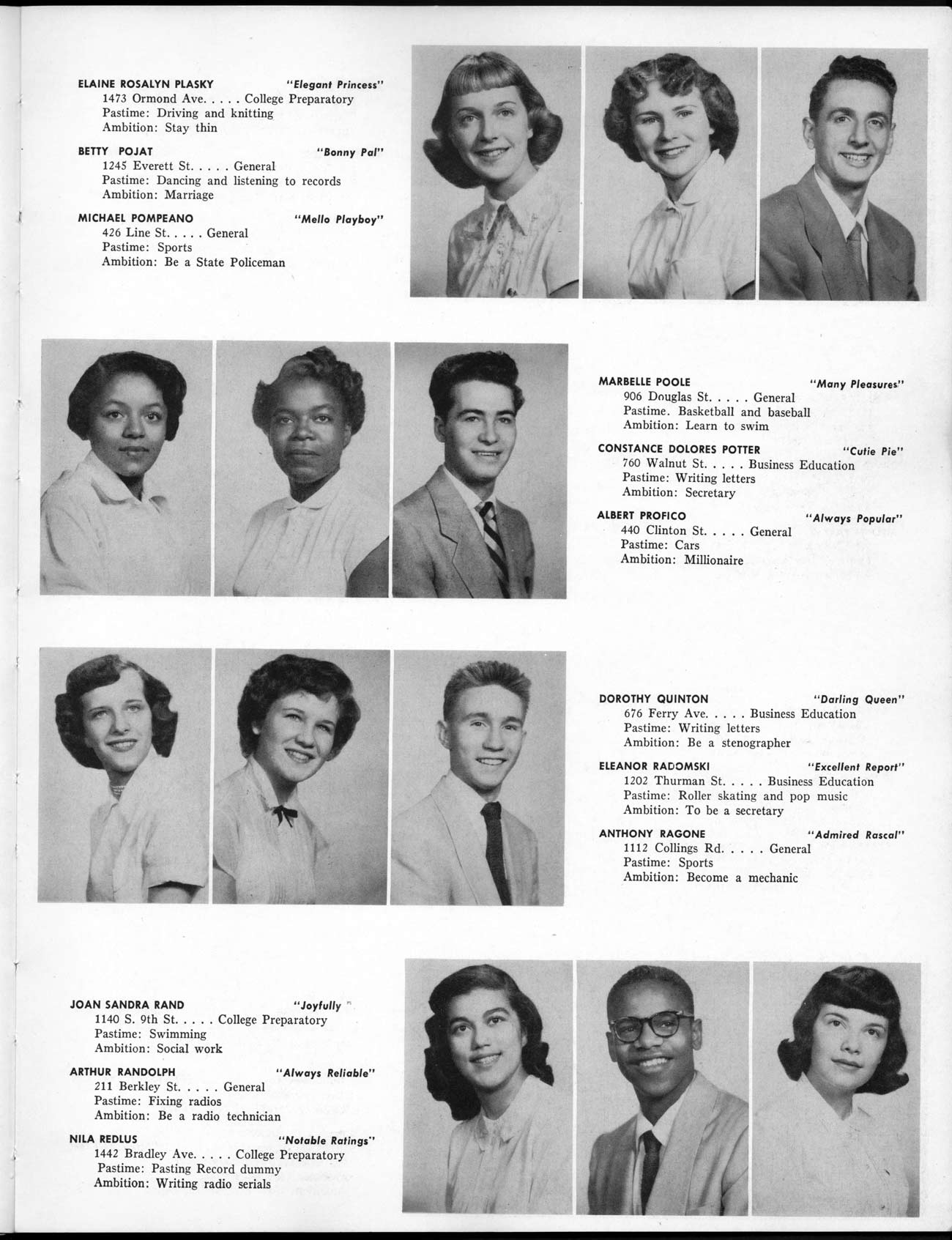 SENIOR ACTIVITIES NANCY ADAMS-Dance Club, Chess Club, Badminton, Purple and Gold Business Staff. ARLENE ALBERT-Crocheting Club, Girls' A.A., Dramatic Club, Charm and Fashion Club. BERNARD ALEXANDER-Psychology Club. ROSS AMES-Fix-It-Yourself Club, Hi-Y Club. CATHERINE AMOS-Twirling Club, Basketball, Archery, Hockey, Canasta Club, Typing Club, Home Room Leader. DOROTHY ANDERSON-Game Club, Art Club, Art Slides, Home Room Secretary, Typing Club, Nurse's Office,. Guidance Office. ANITA ANICICH-Dance Club, Purple and Gold Business Staff, Record Subscription Staff, Senior Prom Committee, Dr. Koppenhaver's Office. EDMUND ANYZEK-Contract Bridge Club, Red Cross Club, Red Cross Arts. CLARA ARNOLD-Game Club. Pantomime Club, Glee Club, Senior Steering Committee, Guidance Council, Nurse's Office, Big Sister, Refreshment Committee, Hostess for. Children's Home Party and National Honor Society Tea. CHARLOTTE AVIS-Typing Club, Red Cross Activity Club. ROBERTA BABIN-Crocheting Club, Basketball, Purple and Gold Business Staff, Manager of Purple and Gold Subscriptions, Senior Steering Committee. DELORES BAISDEN-Crocheting Club, Red Cross Club, Dra-matic Club, Intramural Sports. JOHN BALLINGHOFF-Red Cross Art Club. MILDRED BALSAMA-Lieutenant Varsity Majorettes, Maj.or-ette Club, Twirling Club, Record Distributing Staff, Senior Guidance Council. NINA BANKS--Pantomime Club, Knitting Club, Basketball, Advanced Typing Club. JOHN BASKERVILLE-President Hi-Y Club, Baseball, Foot-ball Club, Usher, Football, Traffic. LUTHER BATES-Hi-Y Club, Boys' Sports, Baseball. DELORES BAUM-Dance Club, Home Room Secretary, Purple and Gold Business Staff, Student Government, Home Room Leader, Library Council, Decorating Committee, Nurse's Office, Social Committee. ALFONSO BETHEA-Sports Club, Typing Club. JOAN BICKER-Chess and Checkers Club, Library Council, Charm and Fashion Club, Junior Decorating Committee, Nurse's Office, Dr. Koppenhaver's Office, Guidance Office, Big Sister, Senior Steering Committee. DIANE BIEDERMAN-Dance Club, Air Raid Aid, Red Cross Club .. JOAN BLACKNIAK-Art, Club, Classical Club, Halloween Painting, Red Cross Art Club, Junior Decorating Committee, Tennis, Badminton, Swimming Club, Camden Figh Calendar Art Staff, Associate Art Editor, Purple and Gold, Charm Club. SHELDON BODNER-Stamp Club, Pinochle Club, Psychology Club. BARBARA BONE-Home Room Leader, Record Salesman, Golf Club, Swimming, Assistant Manager Record Sales and Circula-tion, Student Government Office, Big Sister, Secretary-treasurer Chess and Checkers Club. CATHERINE BOYLAN-Twirling Club, Home Room Vice-President, Air Raid Aid, Typing Club, Nurse's Office, Record Sales and. Circulation, Swimming, G.A.A. Representative, Rep-resentative to Citizenship Institute. JOSEPHINE BORREGGINE-Fix-It-Yourself Club, Golf Club, Library Council, Traffic Club Office, Record Literary, Nurse's Office, Senior Class Show. BRUCE BORTNER---'-Hunting and Fishing Club, Psychology Club, Speech Assembly Program, Junior Class Play, Castle Crier Photography Editor, Record Photography Editor, Semi-Finalist Public Speaking Contest, Golf team. LOUIS BOVINO-Sports Club, Junior Class Play, Baseball, Pantomime Club, Home Room Leader, Finalist Public Speaking Contest, Co-Captain of Cheerleaders, Student Government, Chairman Brooks-Irving Trophy Committee, Purple and Gold Literary Staff, Associate Editor, Senior Class Treasurer, Big Brother; Decorating Committee .. DELLA BOYD-Public Speaking Club, Crocheting Club, Girls' A.A., Record Business and Advertising Staff. DONALD BRIGHT-Basketball, Baseball, Assembly Program Committee, Junior Decorating Committee, Junior Prom Committee, Basketball Club, Junior Class Show, "Good News," Senior Class Play, Senior Class Steering Committee, Chi"istmas Decorat-ing Committee, Big Brother. EARL BROWN-J.V. Football Team, Football Club, Canasta Club. ESTER BROWN-Future Teachers Program Chairman, Begin-ners Typing, Record Sales and Circulation, Library Council. HERBERT BROWN-Hi-Y Club, Boy's Sports Club, Track Team. SYLVIA BROWN-Gifts and Accessories, Classical Club, Arch-ery, Hockey, Basketball, Baseball, Psychology Club, Girls' A.A. Secretary, Library Council, Purple and Gold Literary Staff, Traffic, Senior Show, Big Sister. Quill and Scroll. LORRAINE BUCZYNSKI-Purple and Gold Social Activities, Checkers Club, Bowling, Purple and Gold Business Staff Secretary, Dr. Koppenhaver's Office. SAMUEL BUELL-Football Club. Football Team, Baseball, Ushers, Welfare Chest Committee, President Boys' A.A., Home Room Leader, Baseball Club. ANTHONY BUTCH-Football Manager, Fix-It-Yourself Club, Hunting and Fishing Club. DOROTHY COLLOPY-Red Cross Art, Record Art Staff, Home Room Secretary, Scenery Painter, Quill and Scroll, Purple and Gold Business Staff. HARRY CANDERA-Fix-It-Yourself Club, Art Slides, Red Cross Art. ROBERT CANTERMAN-Red Cross Art, Red Cross Art Club. RUTH CARR-Home Room Secretary, Dramatics Club, Home Room Leader, Red Cross Club. CYNTHIA CANNON-Twirlers Club, Knitting Club, Volley Ball, Charm and Fashion Club, Big Sister. JOAN CANNON-Gifts and Accessories Clubs, Basketball, Christmas Decorations, Purple and Gold Business Staff, Home Room Secretary. EVELYN CAPLAN-Red Cross Aids, Coral Reading, Spring Show, Red Cross Club, Library Council President, Music Office, "Good News," Red Cross Program Chairman, Welfare Chest Committee, National Honor Society. FRANK CARDUCCI-Classical Club, Hi-Y Club, Pantomime Club, Pinochle Club. LEWIS CARP-Fix-lit- Yourself Club, Christmas Play, Junior J,J.'s, Usher, Traffic, Student Government, Welfare Chest Committee, Golf Team. HARRY CARSON-Stamp Club, Fix-It-Yourself Club. GLADYS CHAPMAN-Game Club, Charm and Fashion Club, Color Guard Manager, Typing Club, Varsity Color Guard Club, Guidance Office. THOMAS CICCHITTI-Red Cross Art, French Club, Junior Play, Hi-Larities of '51, Junior Prom Committee, Band, Christ-mas Decorating, Senior Play Committee, Ticket Committee, Social Committee, Student Government, Stage Manager for