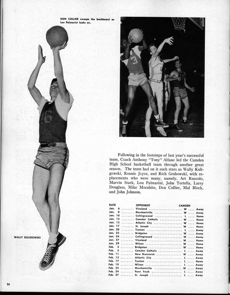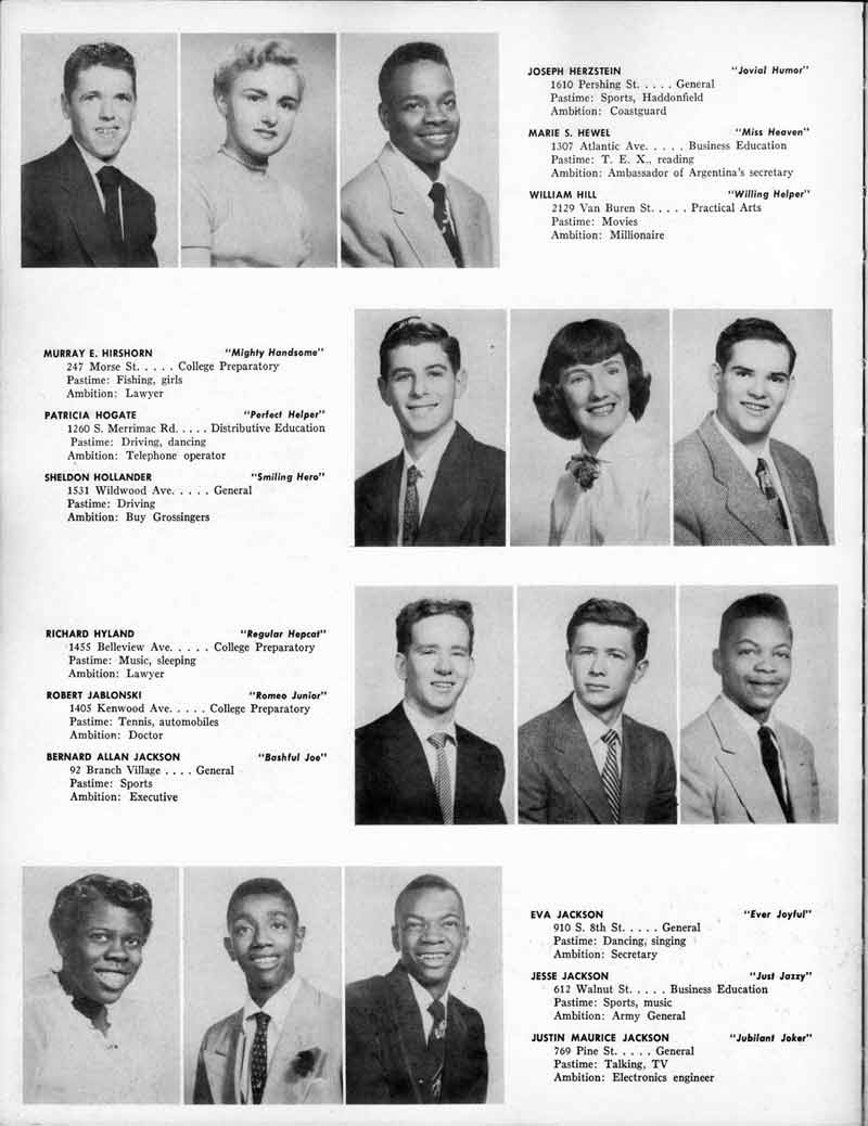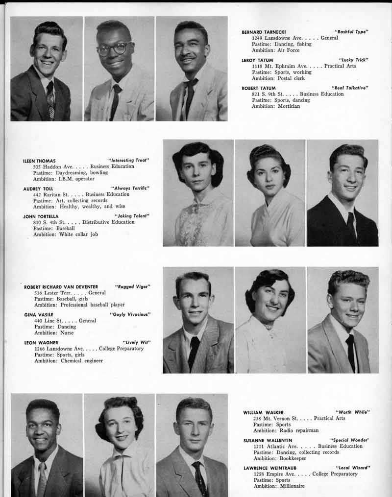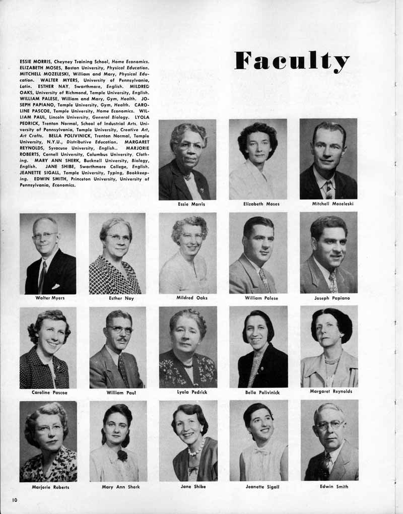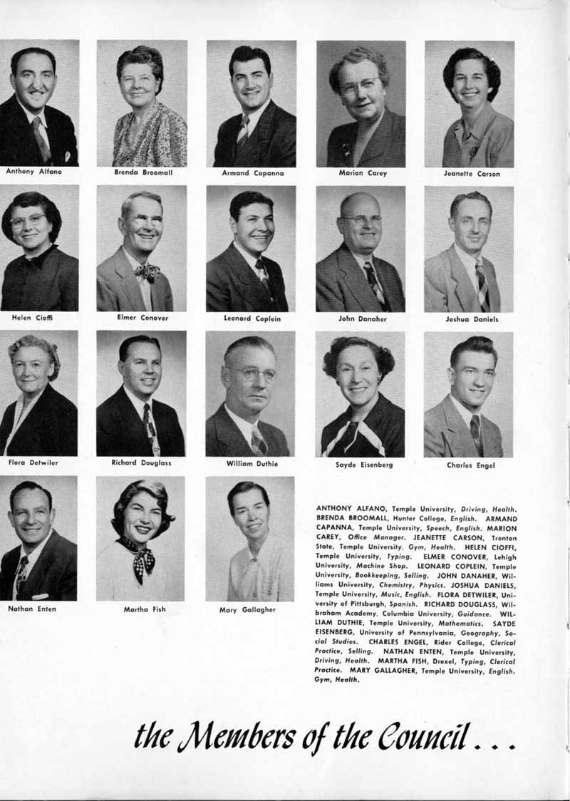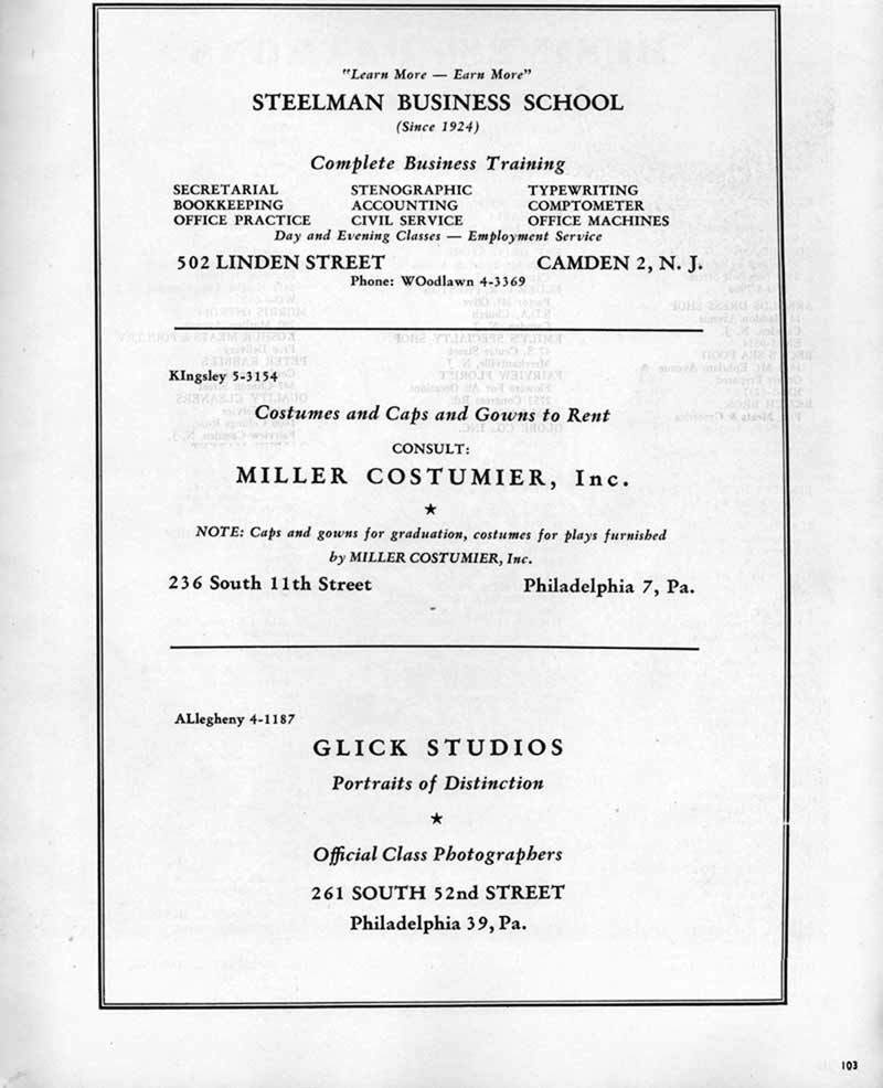 COAL CO. Camden, N. J. Yard Phone WO-3-5808 DINO FILIPPONI, '50 and ELAINE SCHWABE, '52 THE EARLE SHOE STORE 2511 Federal Street Camden. N. J. EBY DRUG STORE 1520 Mt. Ephriam Avenue Camden, N. J. ELDER L. R. PRESTON Pastor Mt. Olive S.D.A. Church Camden, N. J. EMILY'S SPECIALTY SHOP 47 S. Centre Street Merchantville, N. J. FAIRVIEW FLORIST Flowers For All Occasions 2752 Congress Rd. EM-5-1823 GLOBE CO., INC. 941 Broadway Furniture & Appliances WO-4-4482 NIP GREENBURG MEN'S WEAR 1744 Broadway Camden, N. J. HAYMAN JEWELERS We do our own watch repairs 1234 Kaighn Avenue HUSKEY'S RESTAURANT For a good place to eat 1179 Haddon Avenue JACKSON SEA FOOD STORE 803 Van Hook Street JIM