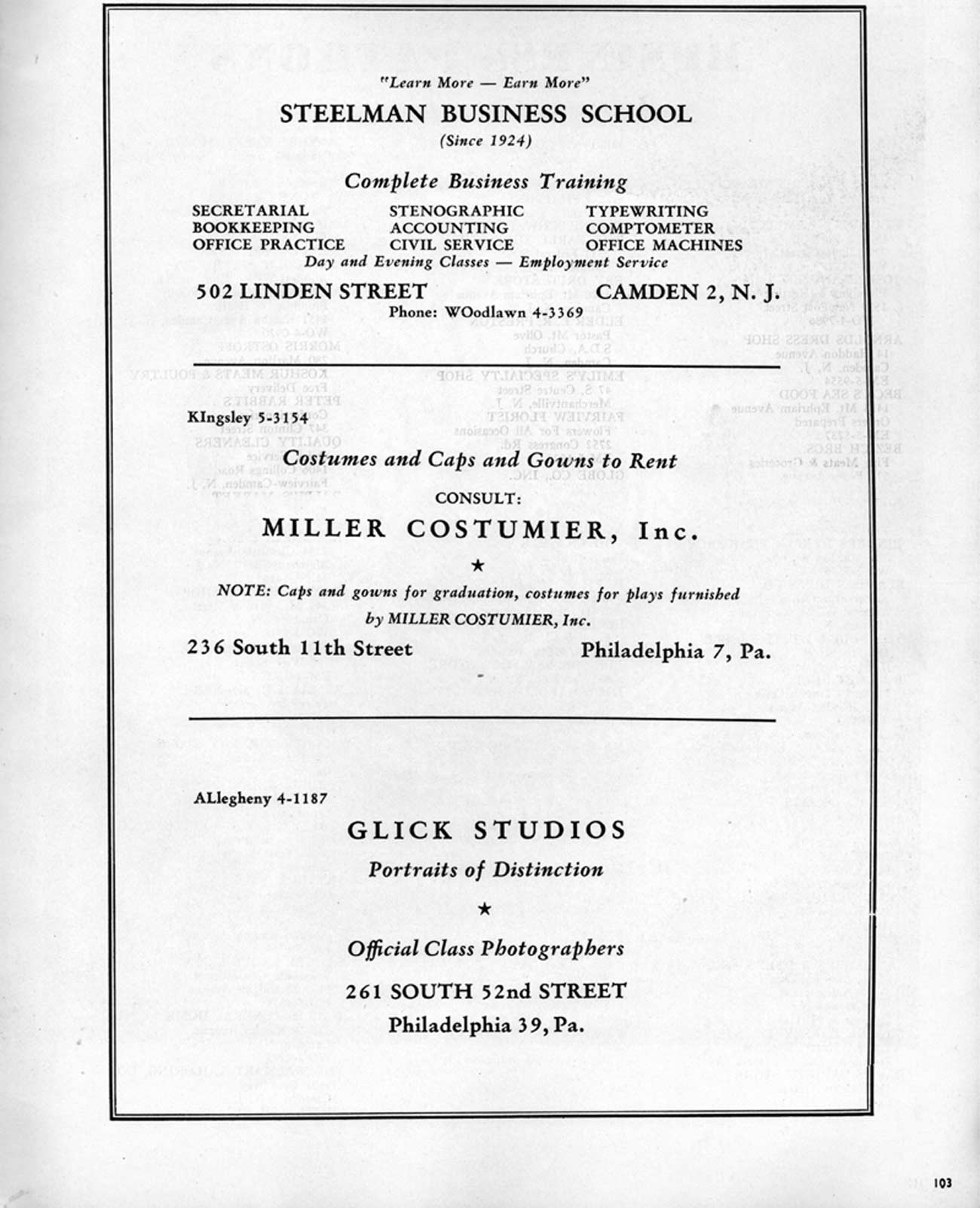 PHOTO SERVICE 1041 Mechanic Street EM-5-3387 JOS. J. LaMARRA Plumbing, Heating & Oil Burners 453-55 Line Street WO-3-1821 LEWIN'S Distinctive Accessories 1204 Haddon Avenue EM-5-5262 MAC McCLOSKY Dancette Club Ballroom MAYER'S