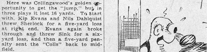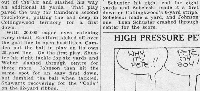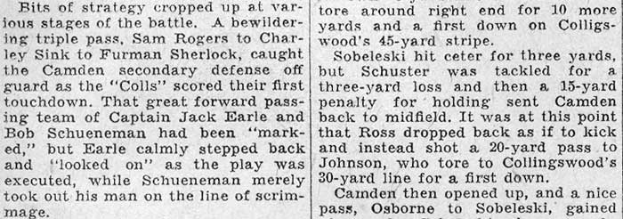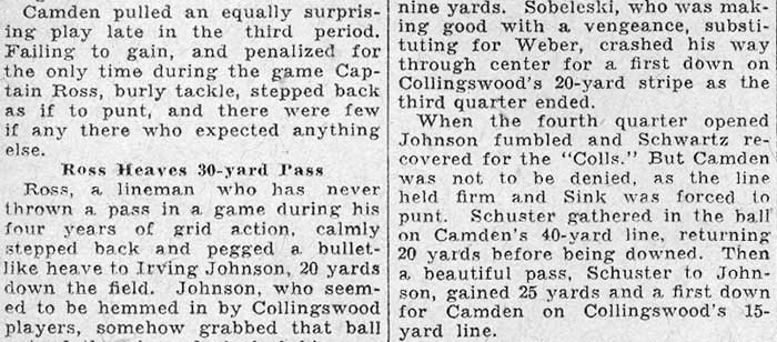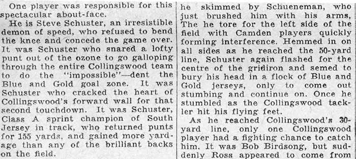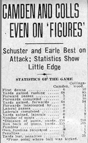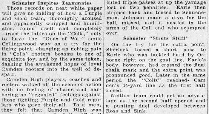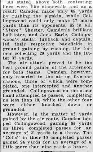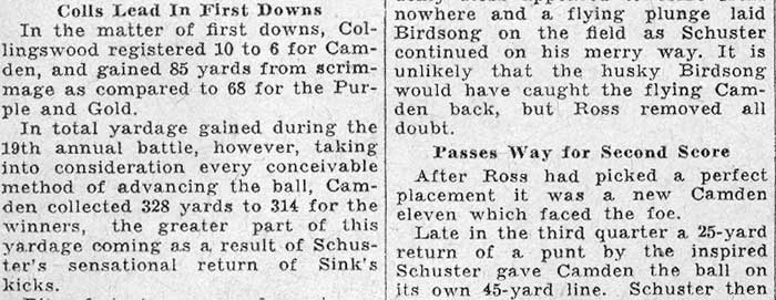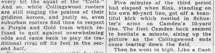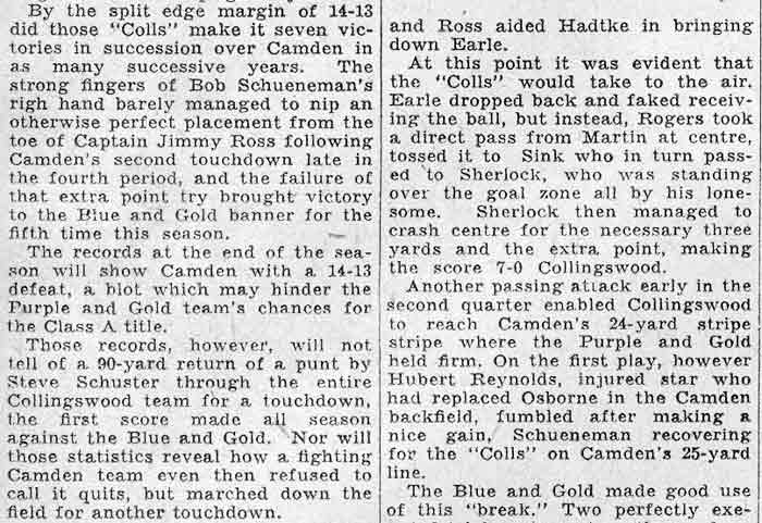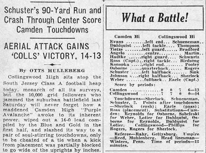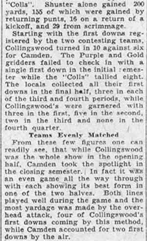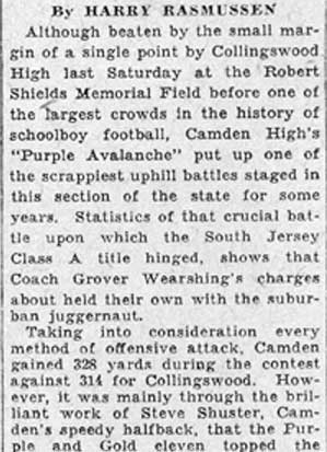 Arguably one of the greatest high school football ever games played in South Jersey, on October 24, 1931 Camden High faced Collingswood High School, then a football power in South Jersey. The Purple Avalanche, coached by Grover 'Worm' Wearshing, came up short by a point that day, losing 14-13. A blocked extra point spoiled a dramatic comeback, giving Collingswood the victory. |