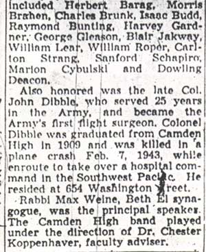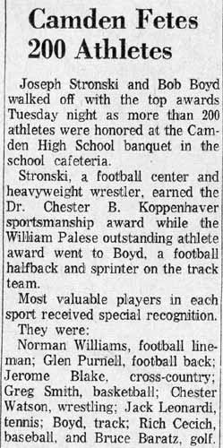 GIVEN CAMDEN HI PUPILS Honor, merit and scholarship certificates have been awarded students at Camden High School by Carleton Hopkins, principal of the school. Presentations took place during the school assembly on Monday. Certificates were also awarded orchestra and band members. Pins were presented to members of the Girls' Athletic Association who had accrued necessary points. Camden High monograms were awarded to six girls of the association. Honor certificates were presented to the following: Philip Levin, scholarship and student activity; Arthur Dorfman, scholarship; June Meunier, scholarship; Sara Cutler, scholarship; George Koehler, scholarship and student activity; Angelina Spina, scholarship; Carl Weyland, scholarship and student activity; Jacob Katzen, scholarship and student activity; Sydney Bush, Marie Richardson, student activity; Betty Alden, student activity, art: Clara Paglione, student activity; James Wynn, student activity: Reuben Block, student activity, publications; Harriet Rupertus, student activity; Charles Ross, student activity; Walter Sobolewski, punctuality and attendance. Merit certificates were awarded to Jack Gantz, student activity; Mary Mori, Student activity; Betty Wittig, student activity; Mildred Bailey, John Visceglia, student activity; Laura Mutzer, student activity, art; Richard Barry, student activity; William Smith, student activity; Doris Krattenmaker, punctuality; David Babnew, attendance; Anthony Perrotti, attendance. Scholarship certificates were given to June Abbot, Sylvia Cohen, Thelma Donohoe, Margaret Giannini, Betty Server, Joseph Armstrong, Wayne Howard, Nathan Shectman, Caroline Giordano, Bertram Ruttenberg, Frank Cecich, Clara Rubin, Laura Blank, Clara Cecich, Natalie Covert, Miriam Galloppi, Bernice Relkin, Ruth Steinberg, John Barnard, Robert Darlington, William Mandel, Eugene Schultz. Orchestra members who received awards were: White certificates, Robert Lowden, Grayson Lutz, Edna King, Robert Darlington. Boone Clyborne. Howard Barrar, Robert Batten. Jack Abbott; red certificates, Joseph Zampino, Clara Rubin; purple certificates, Arnold Safran; gold certificates, Carl Weyland, James Riviello, George Pukas. Band members were: Red certificate, Lynn Hewitt; gold certificate, Robert Lowden. Awards made to members of the Girls' Athletic Association included: Gold pin (60 points) Lillian Talbot; silver pin (50 points). Harriet Rupertus: big C's (50 points), Patricia Barnet, Naomi Fritz, Dorothy Gehret, Marie Leitch, Dorothy Marthinson, Doris Stepler, Filomenia Zampino; C. H. S. monogram (25 points) Anna Hoffman, Grace Lamon, June Link, Virginia Raeuber, Betty Thomas, Gladys Cohen. |