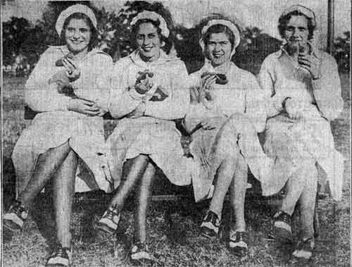 No, this is not an ad advising people to eat a certain kind of “hot dog." These fair damsels lead the Camden High rooting section In songs and yells, and they'll be out there on Robert Shields Memorial Field, Collingswood, on Saturday, when the "Purple Avalanche" stacks up against its old Blue and Gold rival, the "Colls," doing their act as never before. The girls are, left to right, Anna Proud, Audrey Lutch, Helen Keiser and Rhoda Reed. They were snapped at a recent game during intermission.. |