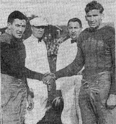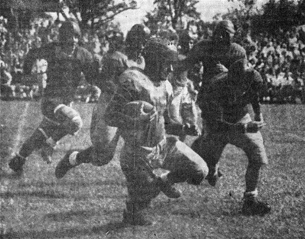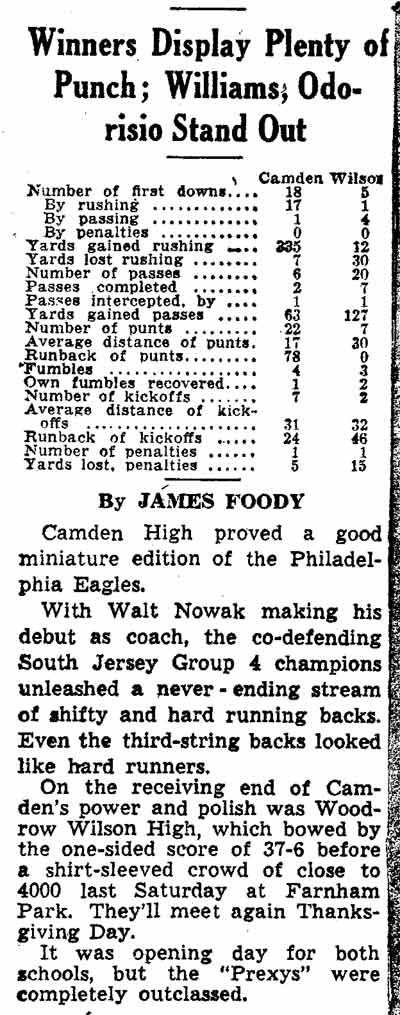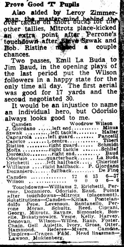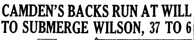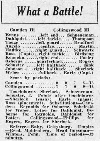 Touchdowns- Wearshing 2, Wallace, Gricco, Winners, Shuster. Points after touchdowns, Wearshing 3, Wise 1 (placement) Substitutions- Camden: Malmsbury for Wearshing, Lawrence for Jackson, Wallace for Carson, Winners for White, Wearshing for Malmsbury, Mozeleski for Gricco, Wisniewski for Weber, Gassel for Cylinder, Tommesetti for Purnell, White for Wallace, Smith for White, Egbert for Jackson. Collingswood: Boggs for Wise, Pickens for Moran, Moran for Voight, Fortiner for Shuster, Wise for Boggs, Galbraith for Hood, Young for Webb. Referees-Geiges, Swarthmore. Umpire- Tatnall, Haverford. Head linesman- Weller, Temple. |