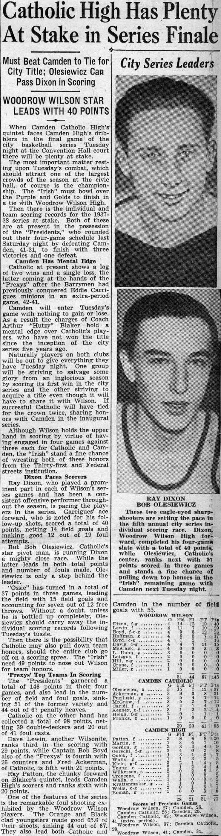 were also announced. Brooks and Mozeleski will coach the various sports at the academic institution, with the latter more than likely taking over football and track and the former basketball and baseball. Brooks, however, will be in charge of the physical department. Mozeleski comes back to his alma mater after having had wide success in college sports and in coaching. "Mitch" attended William and Mary College and captained the football and basketball teams in his senior year, while also earning a letter in track. Following graduation from the Virginia college, Mozeleski coached at a Virginia military academy. Mozeleski is well versed in football and is expected to turn out a formidable team this year at the academic institution. Still, he will have to find plenty of new material, as a number of the present gridders have transferred to the Woodrow Wilson Commercial High School, located at 32nd and Federal Streets. grover "worm" Wearshing, who assisted in the physical ed department at the local school during the past three years, and tutored the football and baseball teams, will take charge of that department and athletic teams at the Woodrow Wilson High School. As yet no assistant has been named for wearshing, but within the next few weeks an announcement will be made by the board of education. Frank Sias, who was on the physical ed staff at the local high school and coached track, has been appointed as physical instructor at cramer junior high school and will be assisted by mary ladewig, another former camden high grad, who has starred on the cinders for temple university and meadowbrook, holding a number of middle atlantic a. a. u. records.