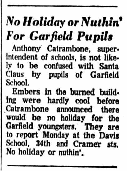 It [The Garfield School- pmc] burnt down on a Friday night in January of 1960. I was in 4th grade in Mrs. Molotsky's class at the time. I remember that I had gone with my dad to the Arlo theater that night to see 'The Magnificent Seven' (still one of my all time favorite westerns). When we got home, we got the news that the school had burnt down. It was a school boy's dream come true and I had visions of an early start to summer vacation, but within one week, all the students had been transferred to Davis or Vets for the remainder of the school year. Ron