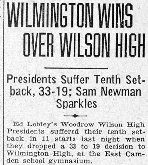 were also announced. Brooks and Mozeleski will coach the various sports at the academic institution, with the latter more than likely taking over football and track and the former basketball and baseball. Brooks, however, will be in charge of the physical department. Mozeleski comes back to his alma mater after having had wide success in college sports and in coaching. "Mitch" attended William and Mary College and captained the football and basketball teams in his senior year, while also earning a letter in track. Following graduation from the Virginia college, Mozeleski coached at a Virginia military academy. Mozeleski is well versed in football and is expected to turn out a formidable team this year at the academic institution. Still, he will have to find plenty of new material, as a number of the present gridders have transferred to the Woodrow Wilson Commercial High School, located at 32nd and Federal Streets. grover "worm" Wearshing, who assisted in the physical ed department at the local school during the past three years, and tutored the football and baseball teams, will take charge of that department and athletic teams at the Woodrow Wilson High School. As yet no assistant has been named for wearshing, but within the next few weeks an announcement will be made by the board of education. Frank Sias, who was on the physical ed staff at the local high school and coached track, has been appointed as physical instructor at cramer junior high school and will be assisted by mary ladewig, another former camden high grad, who has starred on the cinders for temple university and meadowbrook, holding a number of middle atlantic a. a. u. records.