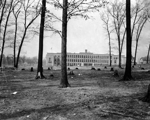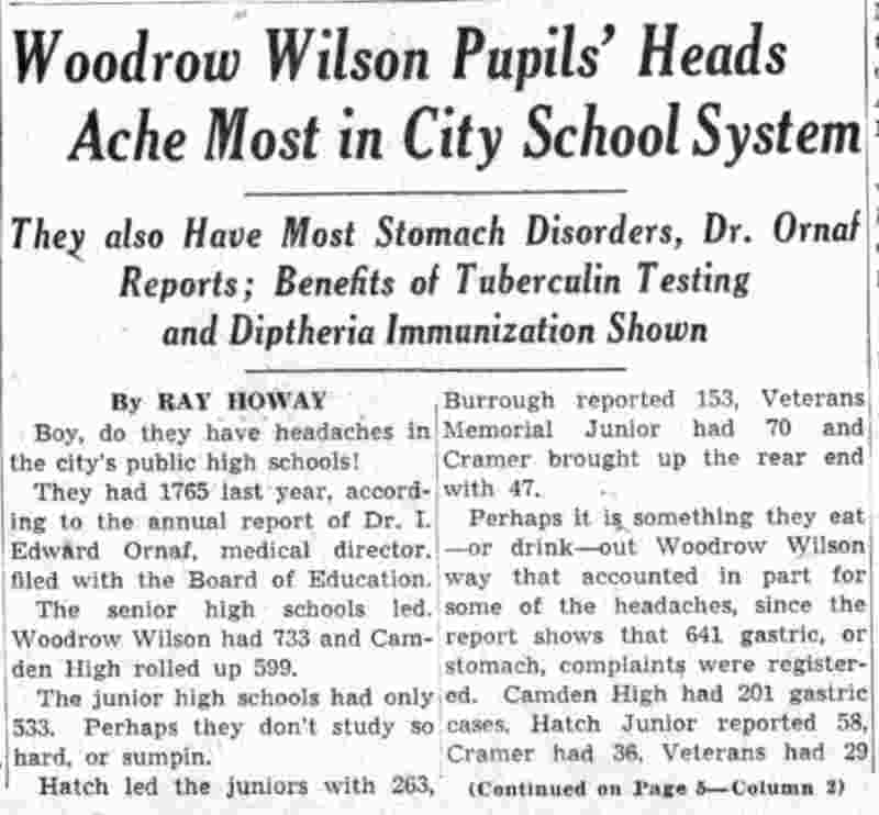 WOODROW WILSON HIGH SCHOOL at 3101 Federal Street in East Camden, originally was built as a junior high school. The school opened in that capacity by February of 1930. In June of 1933 Camden reorganized its schools. Woodrow Wilson became a high school, specializing in commercial and practical arts. The junior high school students were shifted to the Cramer school, which became a junior high schools, and the Garfield and Dudley Schools reabsorbed seventh grade students. The above picture was taken in 1934. The school sits opposite Dudley Grange Park, which for many years housed a branch of the Camden Public Library.