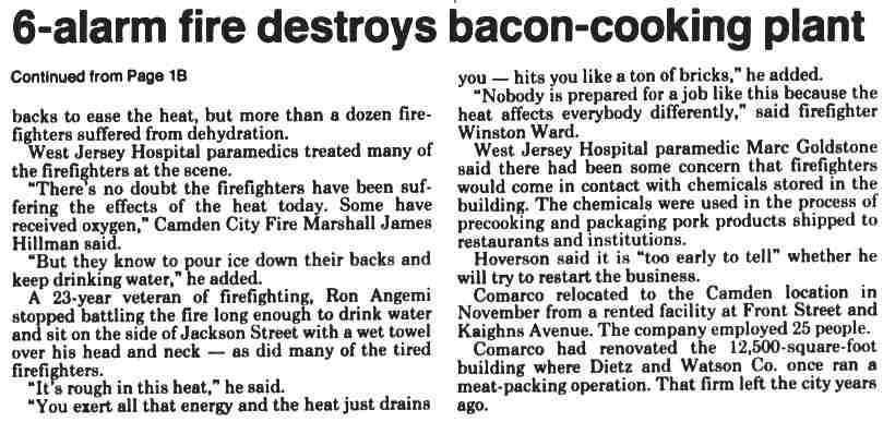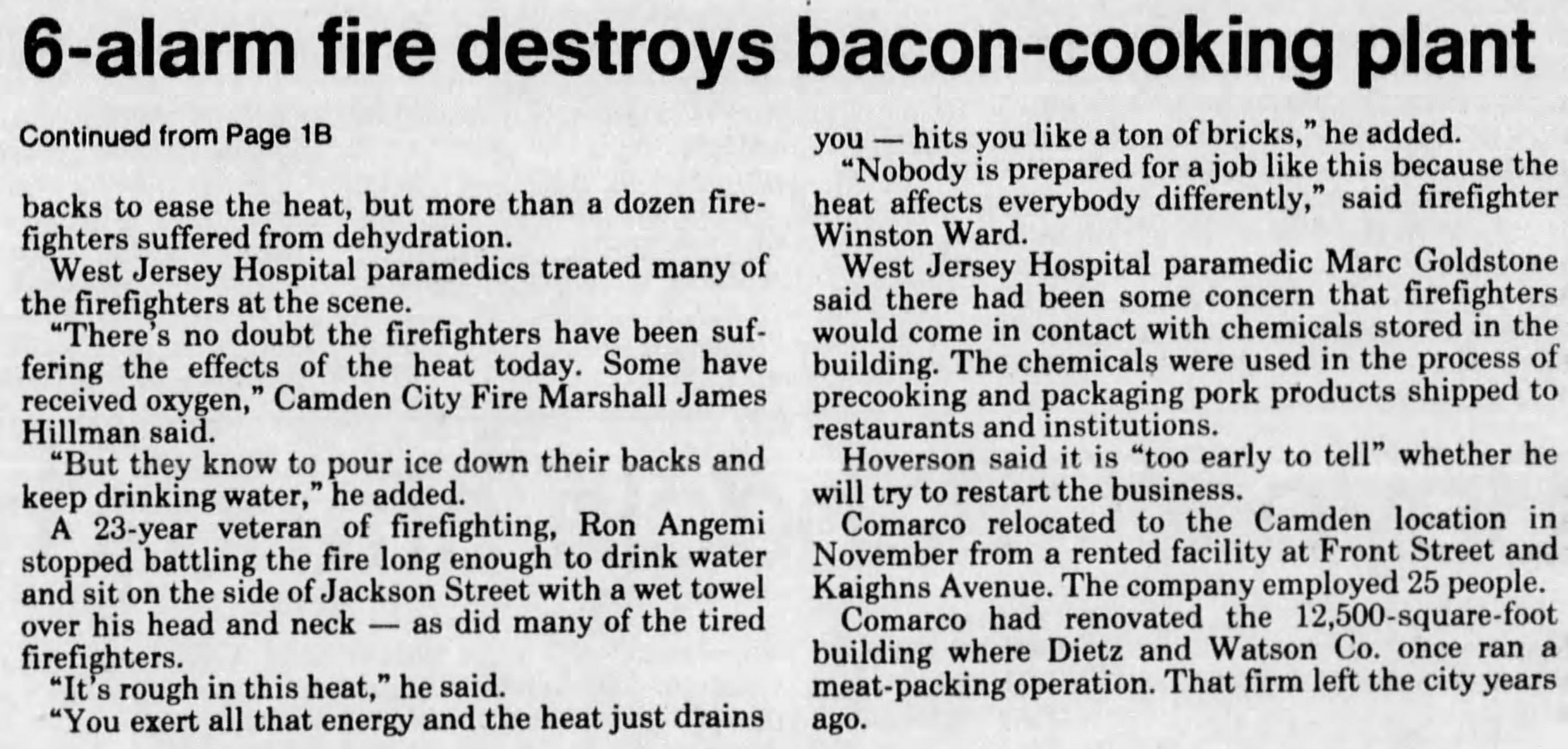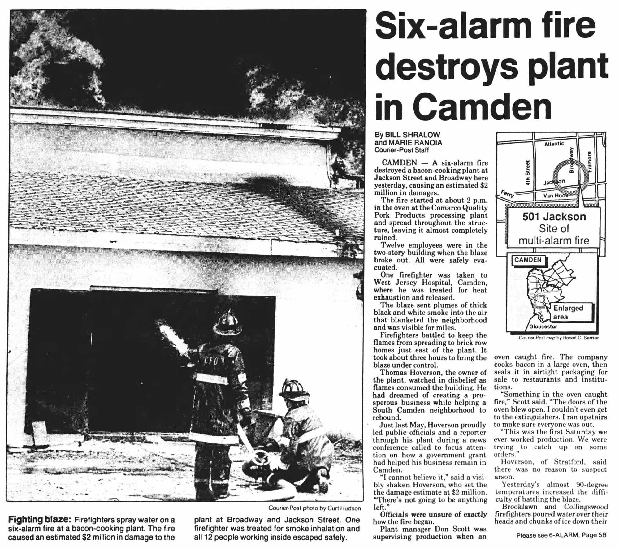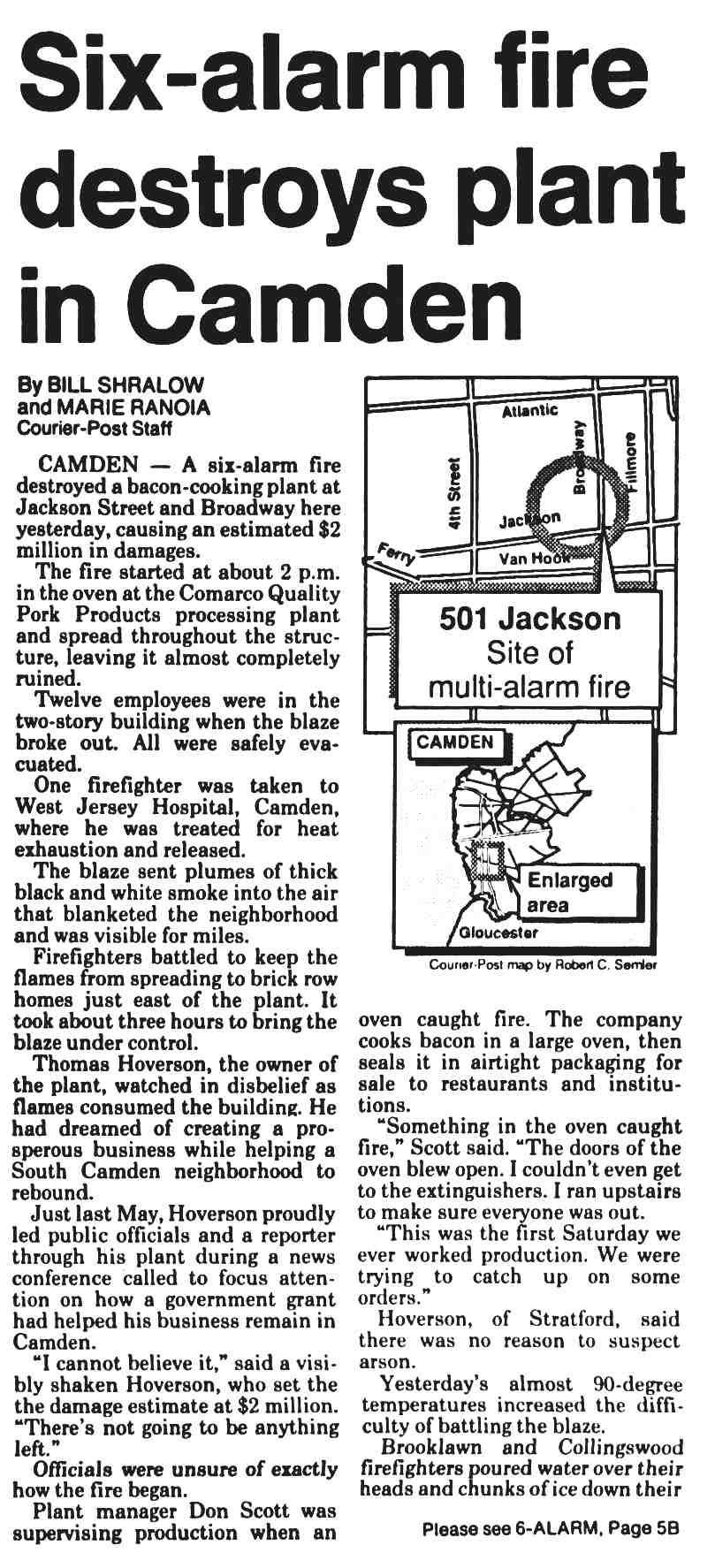 The Comarco Quality Pork Products plant at 501-509 Jackson Street was destroyed after only being in operation a few months. 509-519 Jackson Street had previously been the home of a number of meat cutting and packing business going back to the 1890s. Most recently prior to Comarco, Dietz & Watson had used this facility. There had been a fire in the building once before, in 1950.