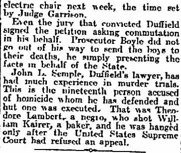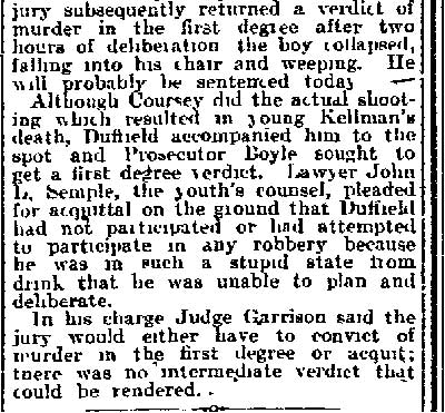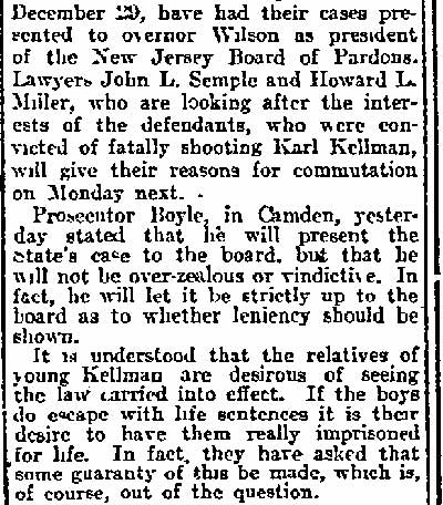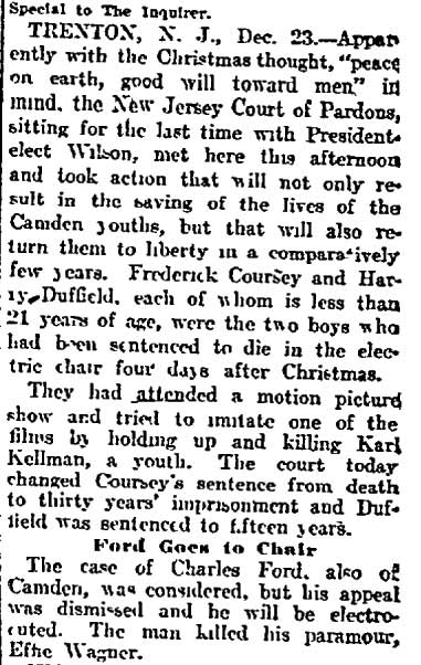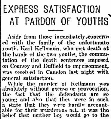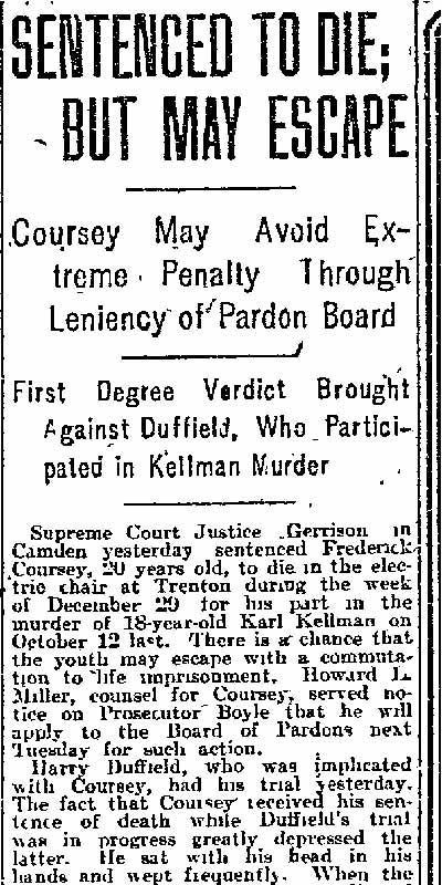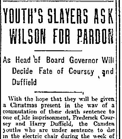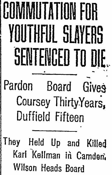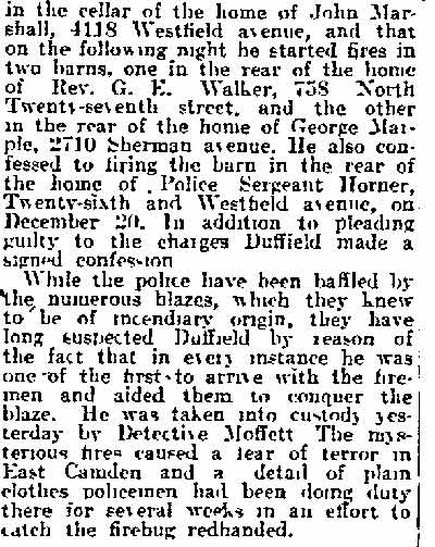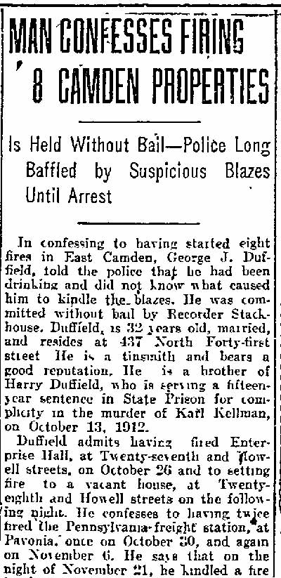 Bob Kellman told me about this case, where his Uncle, Carl Kellman, of 2919 High Street was shot down during a robbery at the railroad tracks at North 27th Street and Sherman Avenue in October of 1912. Harry Duffield, Fred "Cowboy Pete" Coursey, and Linaws Staley were arrested. Staley was cleared of any involvement in the crime in short order. Duffield and Coursey were convicted and sent to prison. Click on this link /people/CamdenPeople-CarlFKellman.htm for more about Carl Kellman and his life and times. September 28, 2006 |