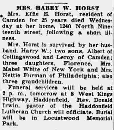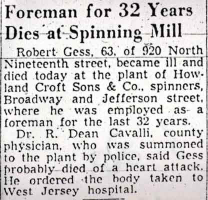 FIREMEN'S AUTO INJURES A Camden city fireman's automobile figured in two successive accidents that injured four persons last night. The fireman is John C. Voll, 33, of 1230 north nineteenth street, attached to Engine Company Number 9, Twenty-seventh and Federal streets. Voll was treated at Cooper Hospital for severe cuts on the face and mouth. His machine collided at Eighteenth Street and River Road about 11 p.m. with the car of Steve Liperi, 23, of 408 West Third Street, Palmyra, injuring Liperi's mother-in-law. Liperi told police Voll's car came at him in a zig-zag manner a block until it struck a pole at Seventeenth Street and River Road, went on the sidewalk and struck two women. One of these, Mrs. Lydia Ramsey, 32, of 2108 Howell Street, was treated at Cooper Hospital for severe cuts on the leg. The other, Miss Pauline Comfort, 22, of 1238 Liberty Street, was treated at West Jersey Homeopathic Hospital far severe bruises. Liperi and his wife, Grace, 19, were unhurt, but her mother, Mrs. Mary Mancuso, 45, of 885 Velde Avenue, Delair, suffered cuts and bruises, No charges were made by either driver. |