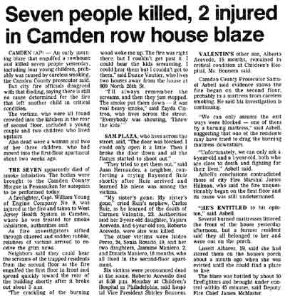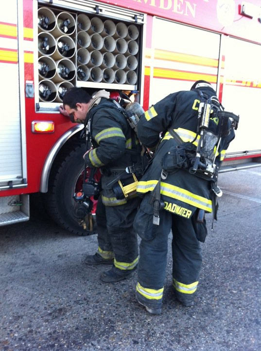 December 9, 2010 Camden Fire Department firefighters Ed Frontado and Johnnie Broadwater changing bottles after extinguishing a working fire at 41 South 28th Street this morning at 07:13 hours. The first due engine company to this fire, Engine Company 9, was closed this day due to policies imposed by City Hall. Click on Image to Enlarge |