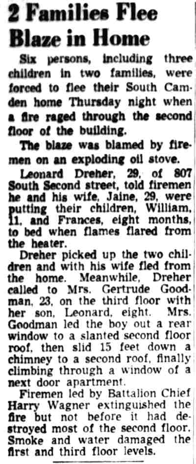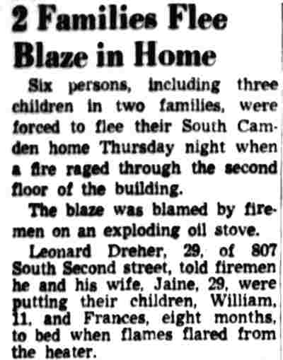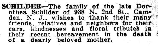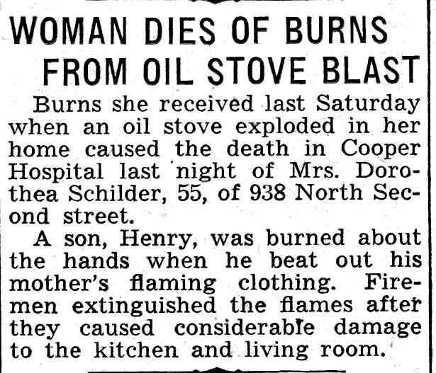 Mrs. Dora Schilder, 55, burned Saturday when an oil stove exploded in her home, was reported "still in critical condition" last night at Cooper Hospital. Mrs. Schilder, who lives at 938 North Second street, suffered burns of the entire body. A son, Henry, 26, was burned about the arms and hands when he tried to beat out the flames. |